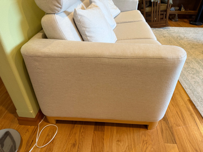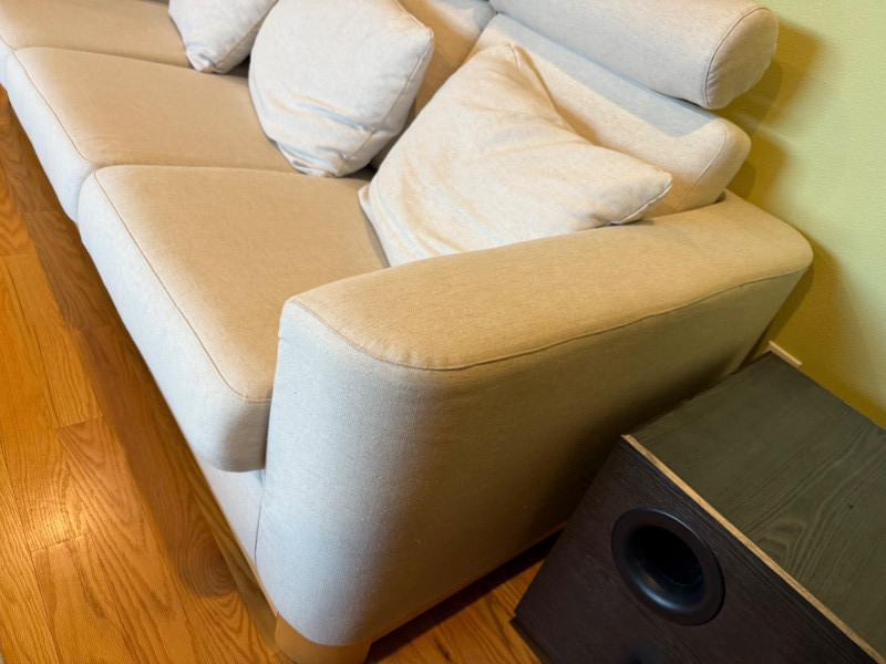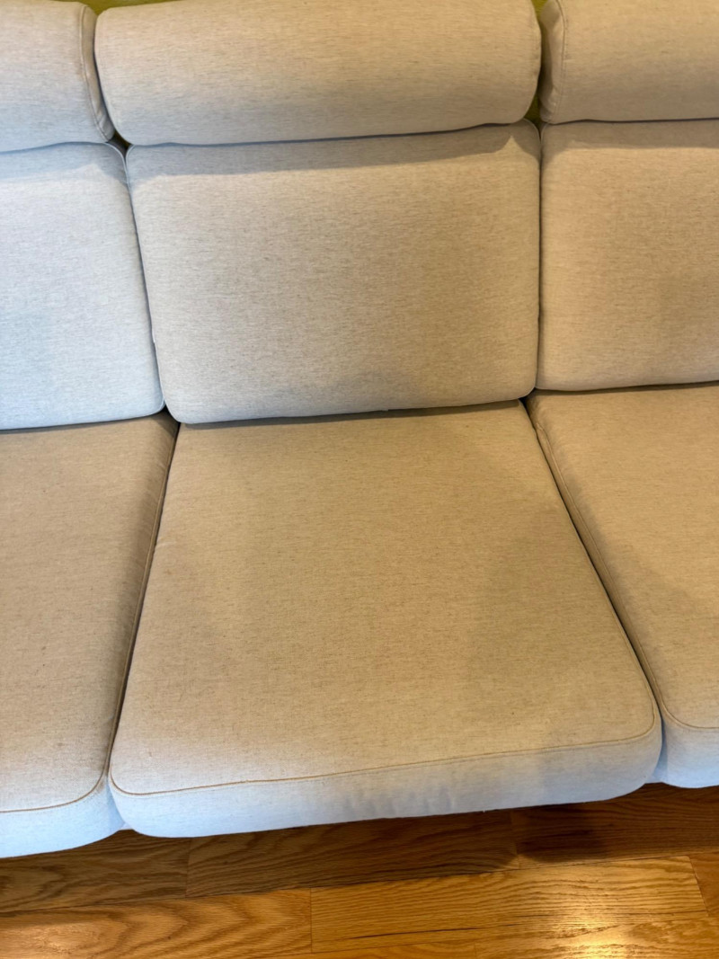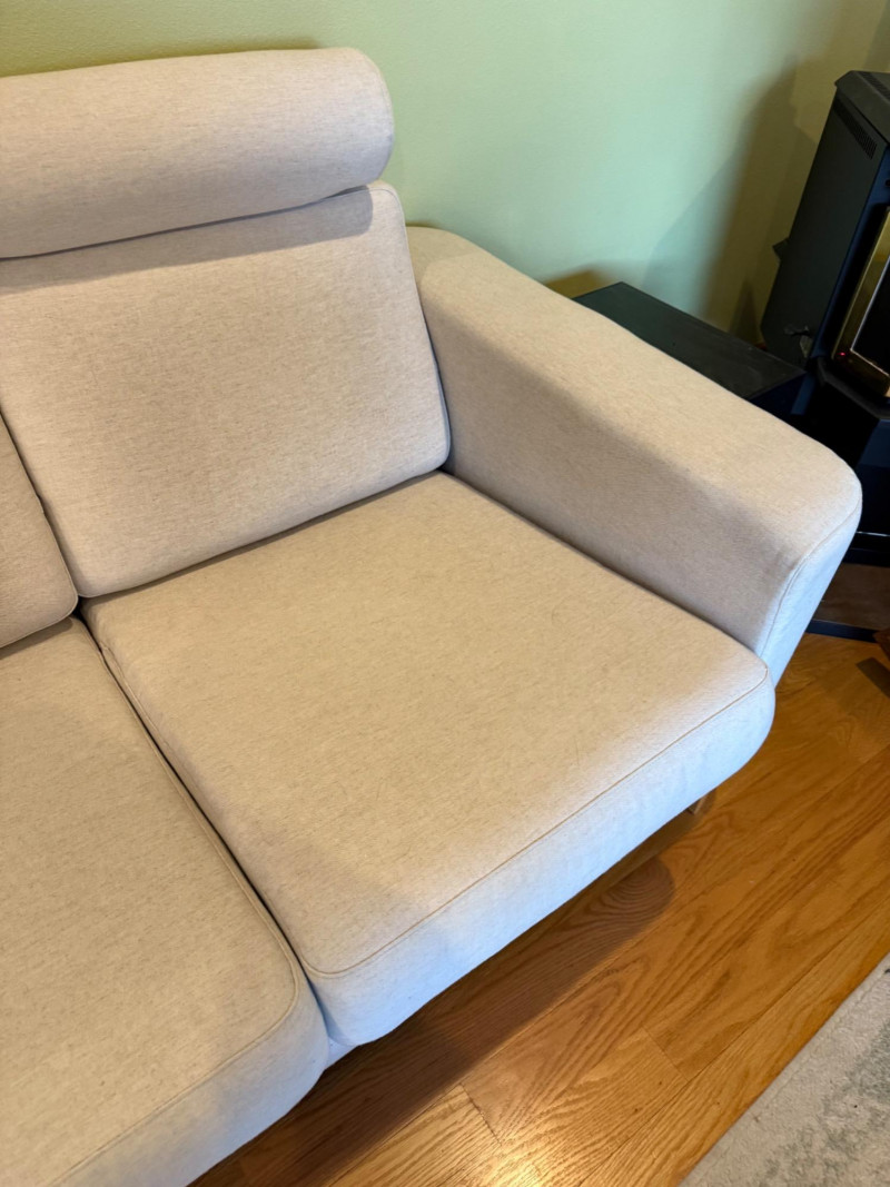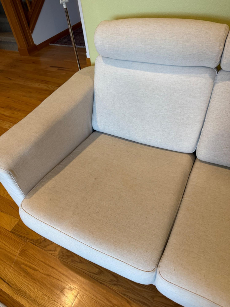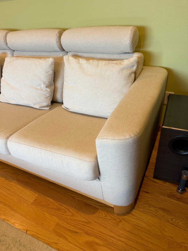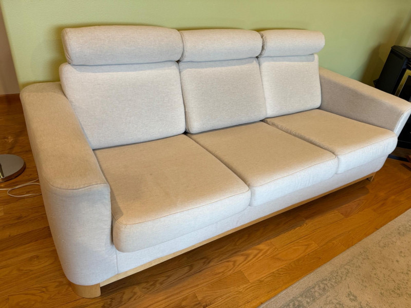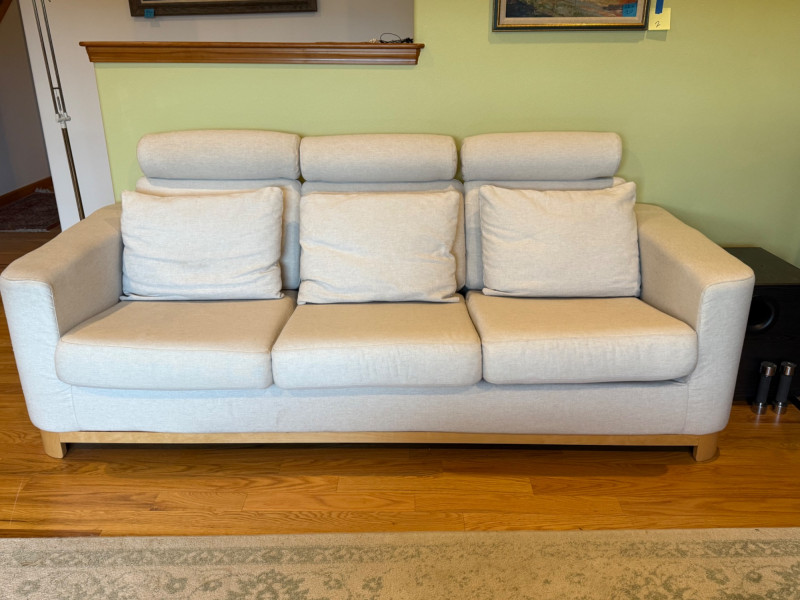 Modern Scandinavian-style 3-seat sofa by IKEA, model Salen, upholstered in a soft light beige woven fabric. The sofa features three adjustable headrests, removable back and seat cushions, and a solid wood base with short block legsin a natural finish. Its clean-lined silhouette and ergonomic comfort make it ideal for contemporary or minimalist interiors. Details: Maker: IKEA Model: Salen 3-Seat Sofa Color: Light Beige (SAGANAS fabric tone) Material: Woven polyester-cotton blend upholstery; solid wood frame and legs Features: Adjustable headrests, removable cushion covers, firm supportive seating Configuration: Three-seat design Why It’s Special: The IKEA Salen series, now discontinued, is sought after for its unique combination of minimalist design and adjustable comfort. Its warm beige fabric and exposed wood base distinguish it from later models like the Uppland or Landskrona, making it a stylish and collectible piece of modern Scandinavian furniture. Handling Note: