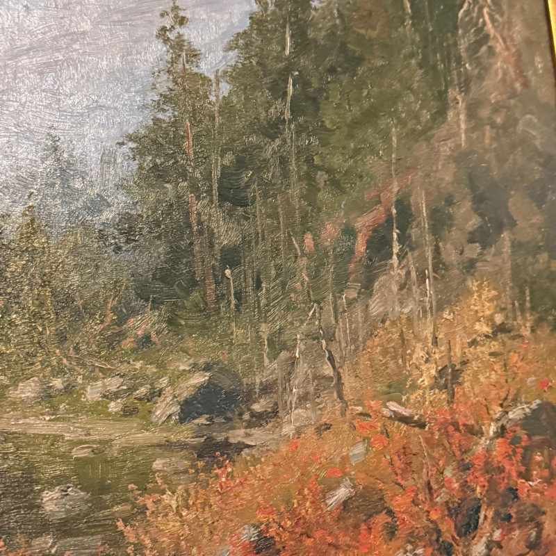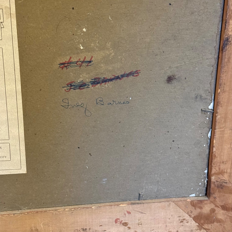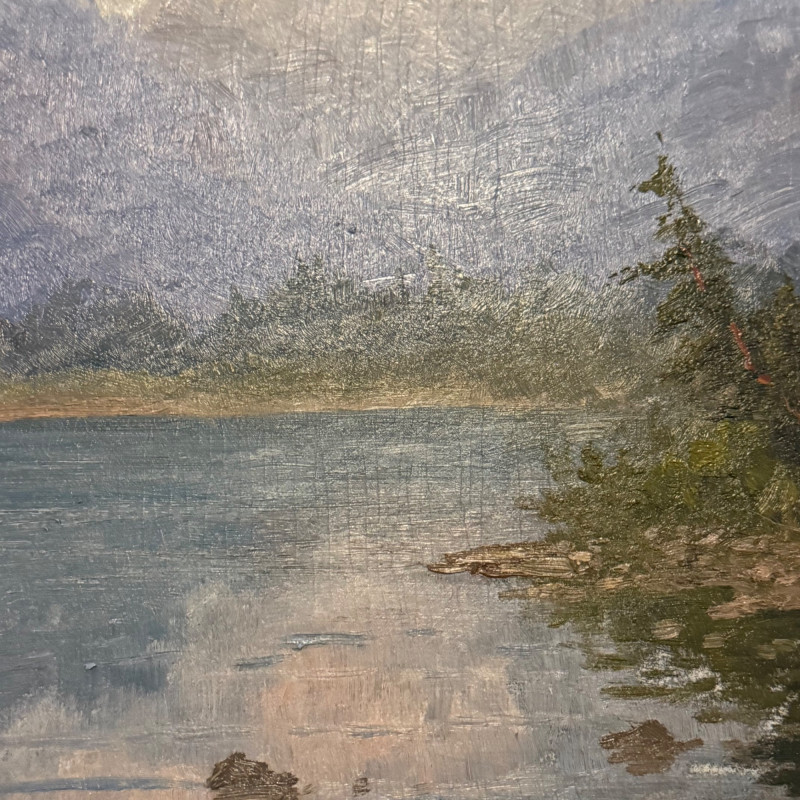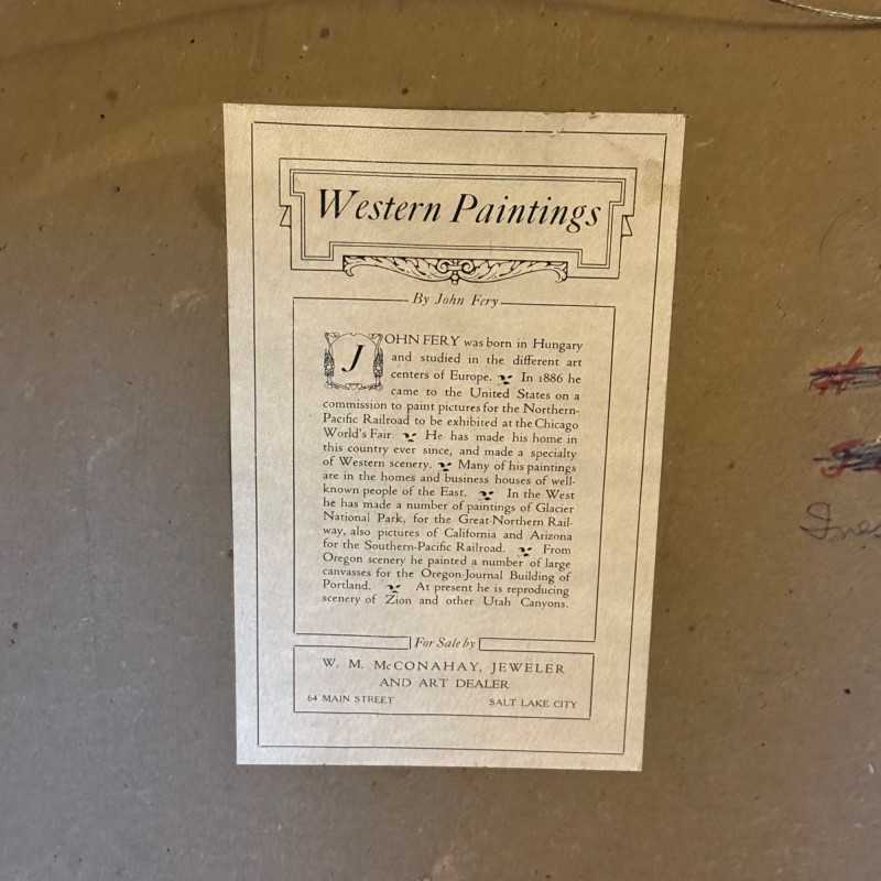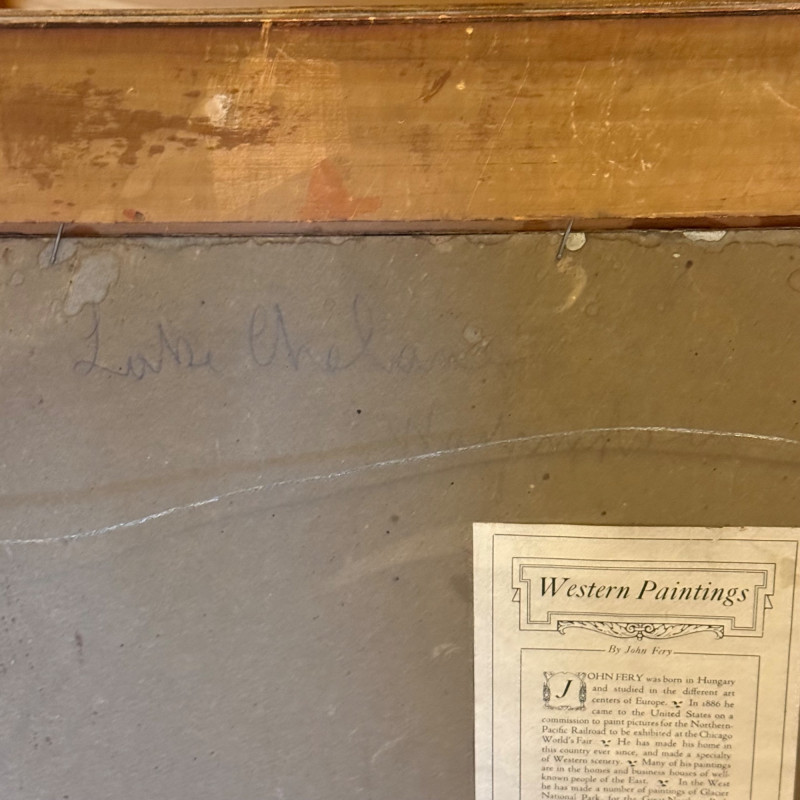 An evocative early 20th-century oil painting on board by John Fery, depicting the tranquil Lake Chelan surrounded by towering pine forests and distant, mist-covered mountains of Washington State. The composition captures Fery’s signature mastery of depth and atmosphere—foreground autumn foliage in vivid orange and rust tones contrasts beautifully with the cool blue water and layered peaks fading into haze. Signature: Medium: Title (verso): Provenance & Label: Retains original printed gallery label: “Western Paintings by John Fery” Distributed by W. M. McConahay, Jeweler and Art Dealer, Salt Lake City, Utah The label notes Fery’s commissions for the Northern Pacific Railroad and his work on Western national park scenes, including Glacier and Zion. Backboard also bears the name “Inez Barnes” in pencil—possibly a former owner or gallery associate. Frame: Collecting Note: