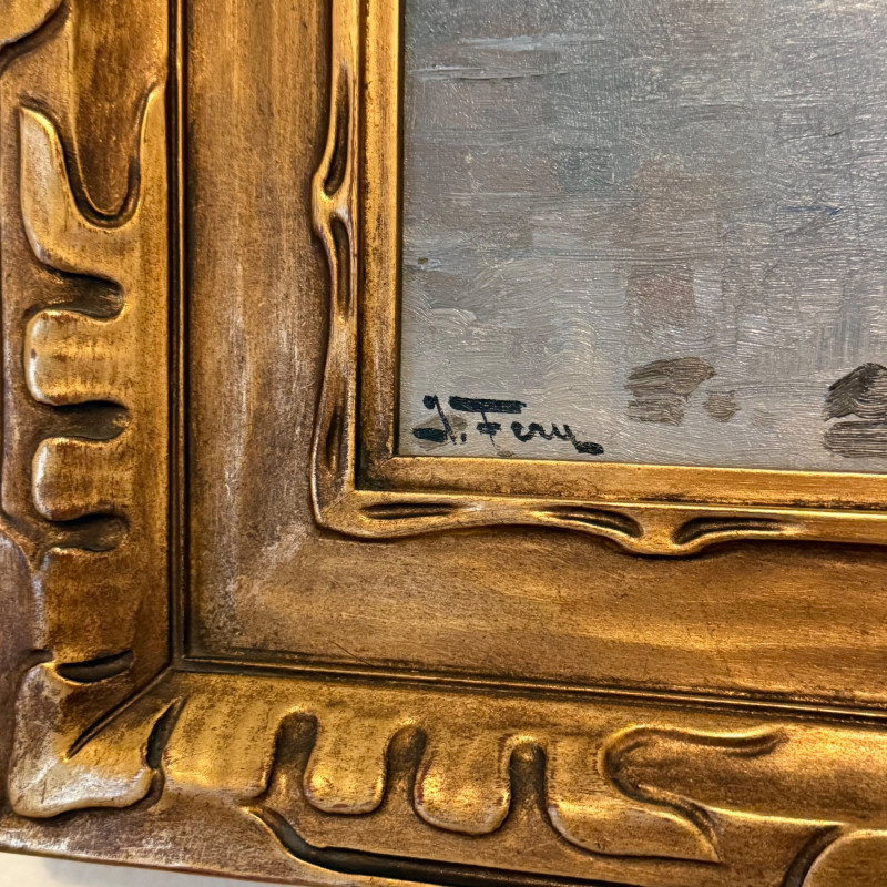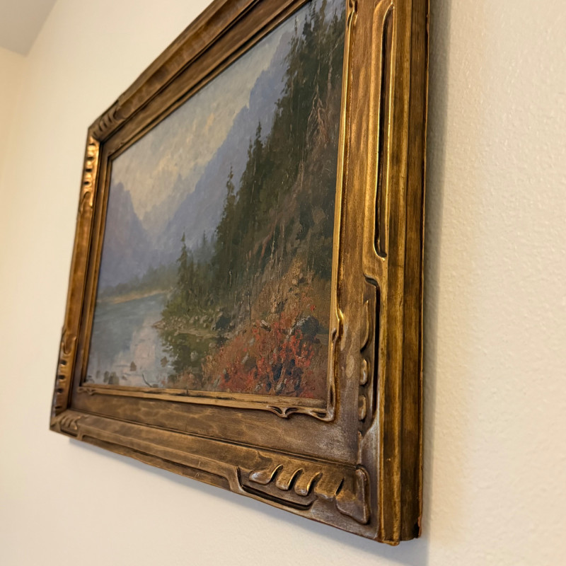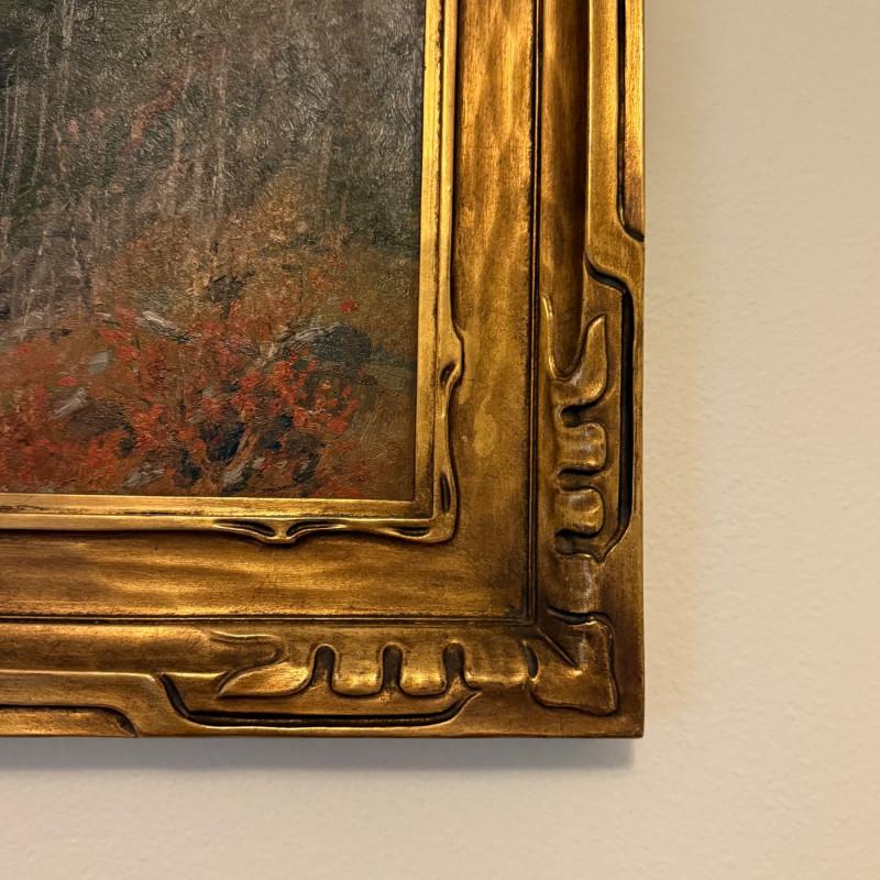 Presented in a gilt carved wood frame with sculptural Art Nouveau / Craftsman-era contours, complementing the tonal richness of the painting.