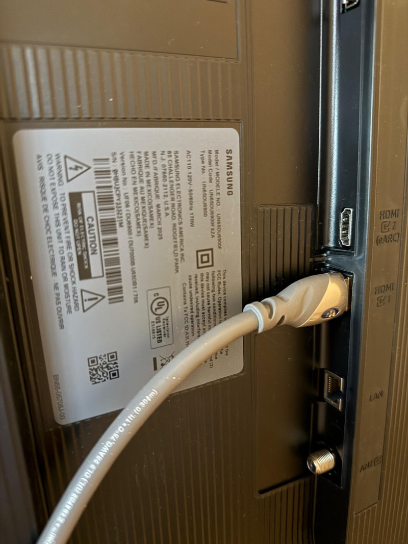 Modern slim-bezel Samsung 65" Smart TV featuring brilliant 4K UHD resolution and vibrant LED display. The screen powers on and displays the HDMI setup interface (“HDMI Cable: Disconnected”), confirming working panel, backlight, and system. Includes the Samsung Smart Remote (solar-charging model) with dedicated streaming service buttons — Netflix, Prime Video, Disney+, Samsung TV Plus. Model Details: Model No.: UN65DU6900FXZA Type No.: UN65DU6900 Manufactured: March 2025 Made in: Mexico Power Input: AC 110–120V, 50/60Hz, 170W Features: 4K UHD resolution with HDR10 Smart Hub (Tizen OS) Built-in Wi-Fi and LAN port Voice assistant compatibility Multiple HDMI and USB inputs Includes: Samsung 65" Smart TV (Model UN65DU6900FXZA) Samsung Smart Remote (solar-powered, Bluetooth) Power cable Handling Note: