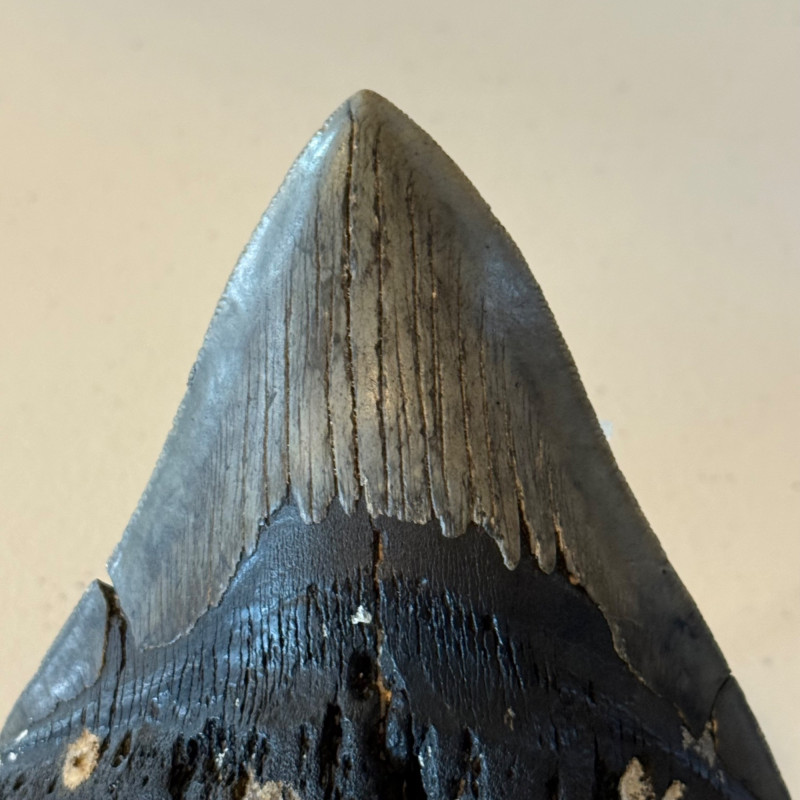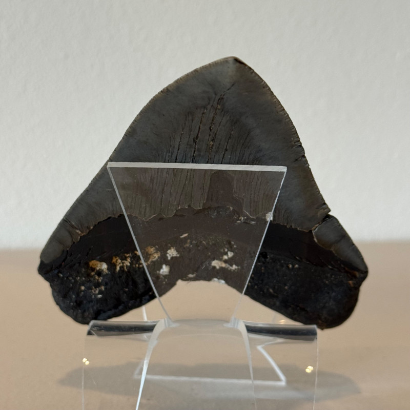 Impressive fossilized shark tooth from the extinct giant Megalodon, featuring dark gray enamel with natural gloss and well-defined serration traces along the edges. The broad triangular crown and thick root display excellent preservation with subtle mineralization from ancient marine sediments. Age: Miocene–Pliocene Epoch (approx. 3.6–23 million years old) Collecting Note: