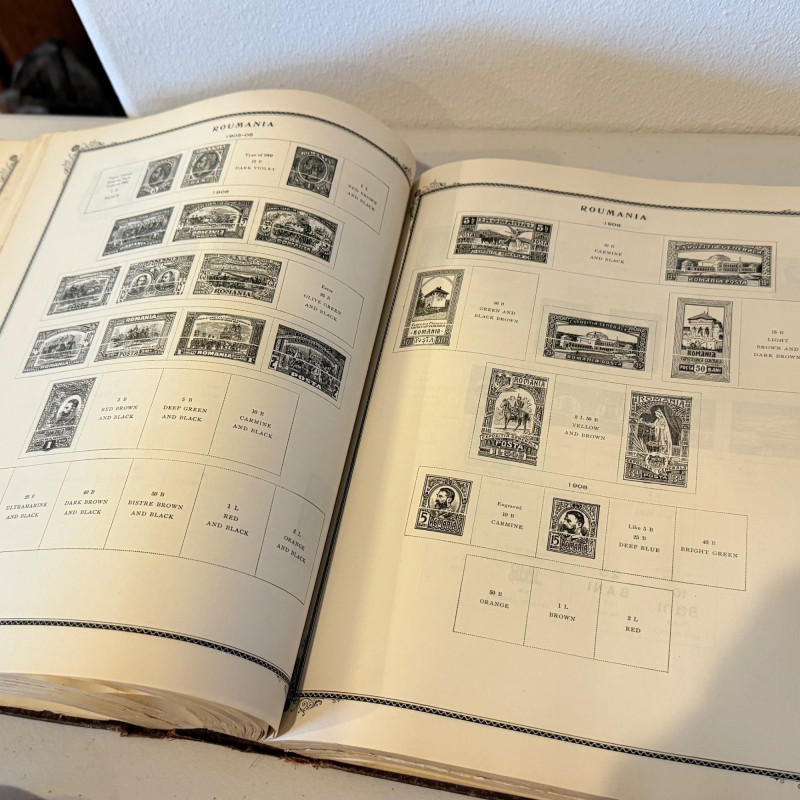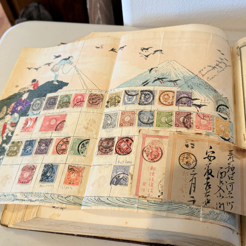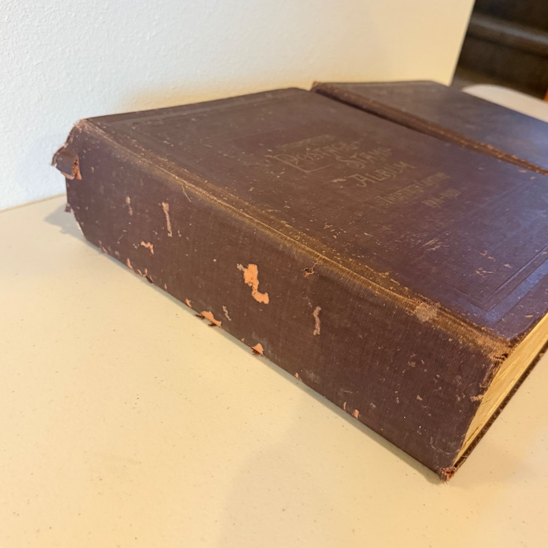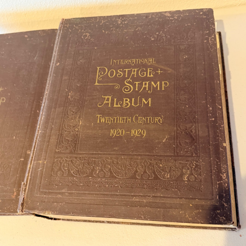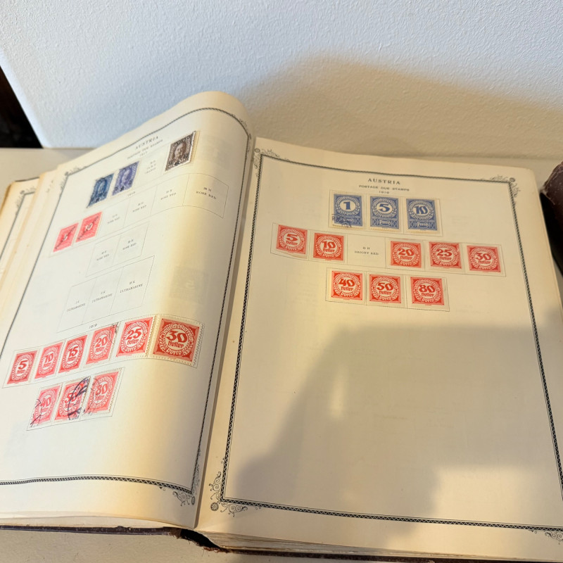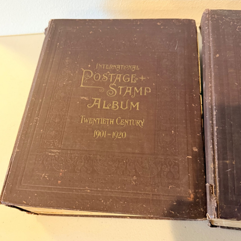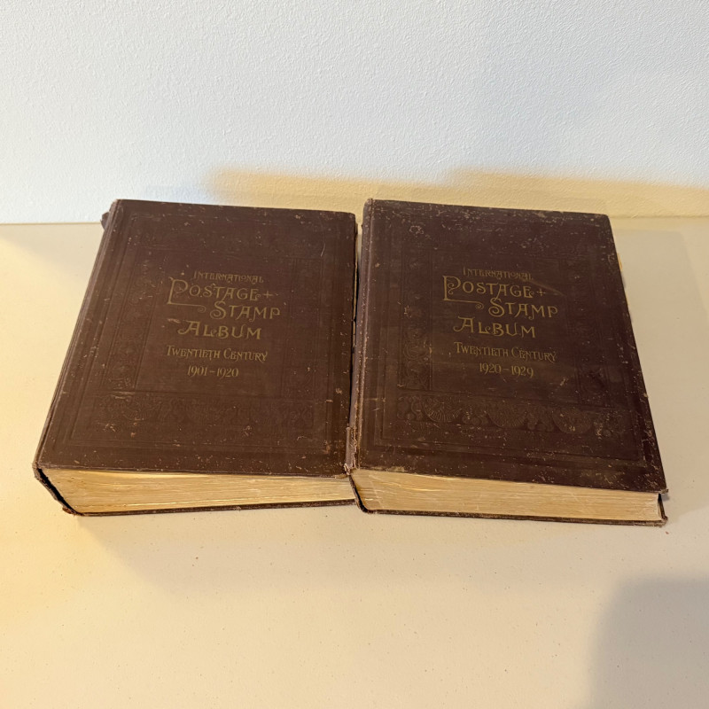 A remarkable pair of antique “International Postage Stamp Album – Twentieth Century” volumes published by Scott Publications, covering 1901–1920 and 1920–1929. These richly illustrated albums represent decades of global postal history, containing hundreds of mounted stamps from the United States, Japan, France, Great Britain, and numerous European and Asian territories. The collection includes early commemorative, definitive, and revenue issues, many identified by hand and neatly arranged by country. Together, these volumes reflect the care and knowledge of an early philatelist documenting an era of expanding international mail. Two original hardcover albums, embossed brown covers with gilt lettering and ornate borders. United States pages featuring early 20th-century Washington–Franklin issues, Pan-American Exposition, and 1898 revenue stamps, with some imperforates and coil variations. Japanese section includes Meiji and Taishō era stamps (c. 1880s–1930s) displayed on a striking decorative folio with Mount Fuji artwork, hand-labeled “Military Issues” and postal cards with kanji inscriptions and cancellations. European selection featuring classic French, German, and British colonial stamps, some early airmail and revenue issues. Additional materials: loose envelopes, postal covers with cancellations, and a small group of detached stamps tucked between album pages. The International Postage Stamp Album series was among the premier collector’s albums of the early 20th century, providing structured layouts for every recognized world issue. The presence of both consecutive decade volumes—still filled and annotated—makes this a rare archival pair, highly desirable for collectors of U.S. and worldwide classic stamps.Highlights