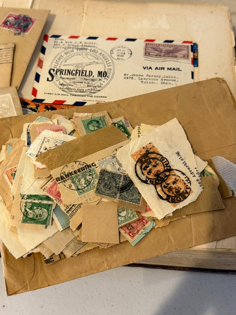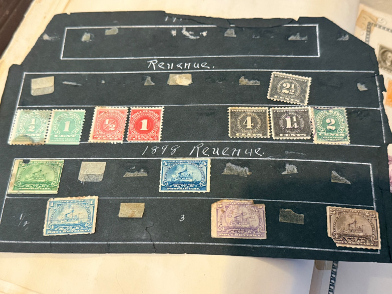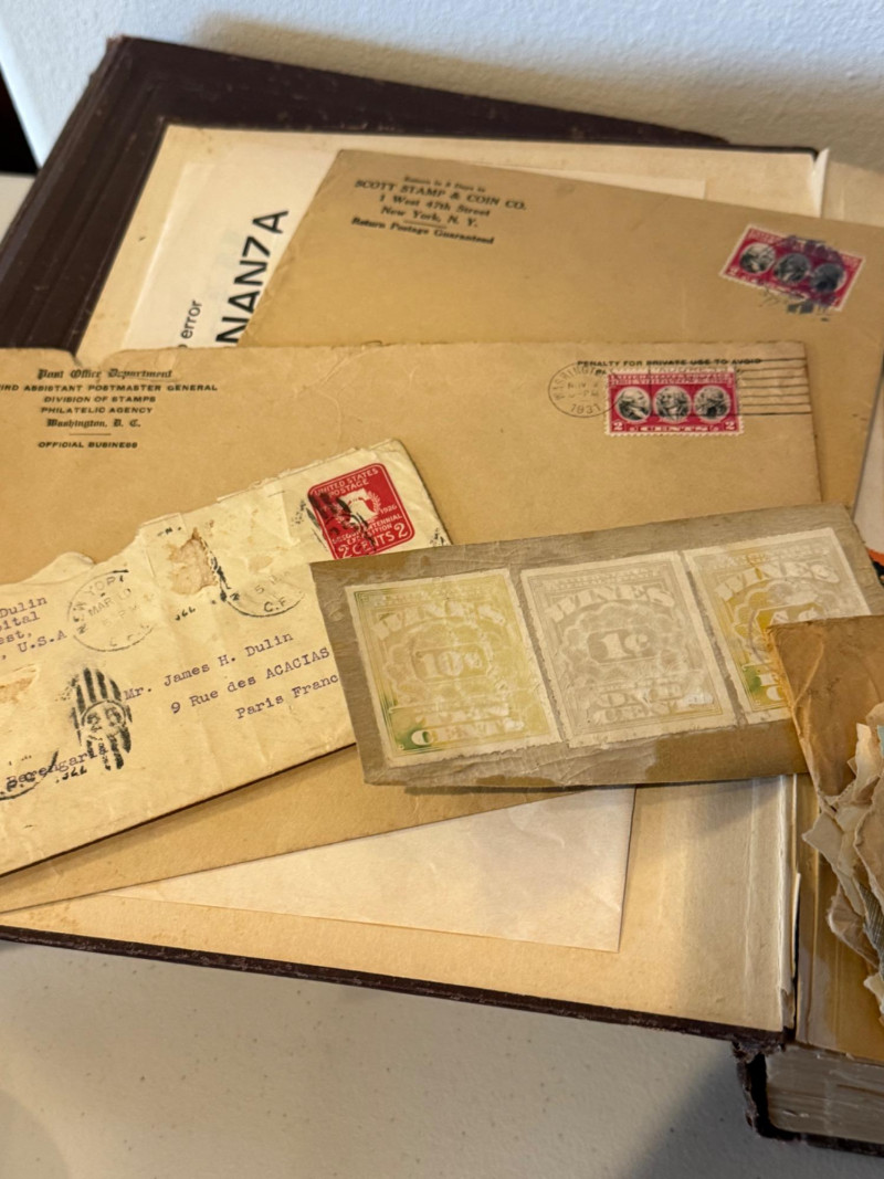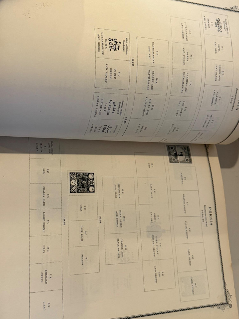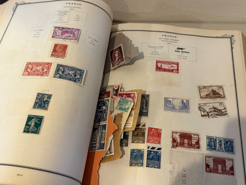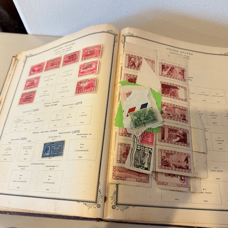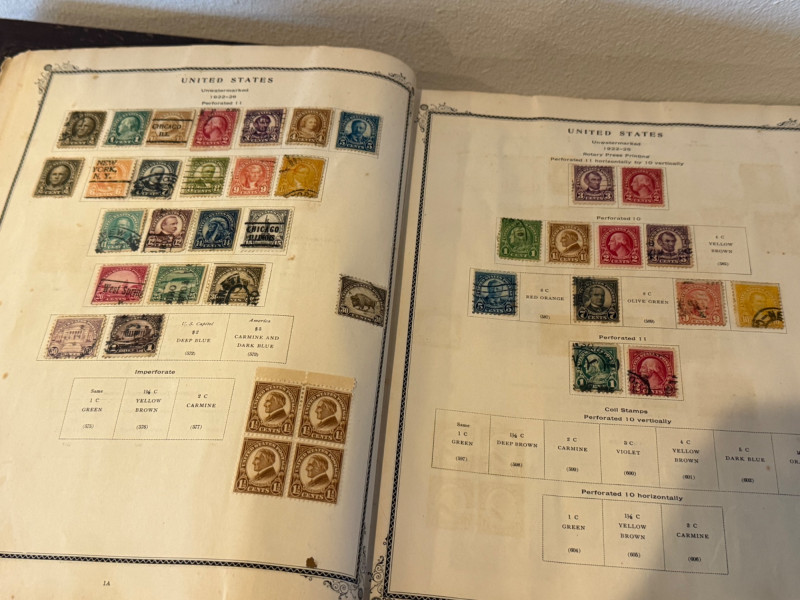 A remarkable pair of antique “International Postage Stamp Album – Twentieth Century” volumes published by Scott Publications, covering 1901–1920 and 1920–1929. These richly illustrated albums represent decades of global postal history, containing hundreds of mounted stamps from the United States, Japan, France, Great Britain, and numerous European and Asian territories. The collection includes early commemorative, definitive, and revenue issues, many identified by hand and neatly arranged by country. Together, these volumes reflect the care and knowledge of an early philatelist documenting an era of expanding international mail. Two original hardcover albums, embossed brown covers with gilt lettering and ornate borders. United States pages featuring early 20th-century Washington–Franklin issues, Pan-American Exposition, and 1898 revenue stamps, with some imperforates and coil variations. Japanese section includes Meiji and Taishō era stamps (c. 1880s–1930s) displayed on a striking decorative folio with Mount Fuji artwork, hand-labeled “Military Issues” and postal cards with kanji inscriptions and cancellations. European selection featuring classic French, German, and British colonial stamps, some early airmail and revenue issues. Additional materials: loose envelopes, postal covers with cancellations, and a small group of detached stamps tucked between album pages. The International Postage Stamp Album series was among the premier collector’s albums of the early 20th century, providing structured layouts for every recognized world issue. The presence of both consecutive decade volumes—still filled and annotated—makes this a rare archival pair, highly desirable for collectors of U.S. and worldwide classic stamps.Highlights
