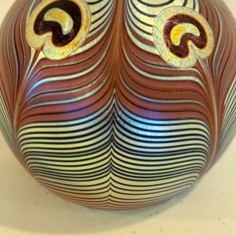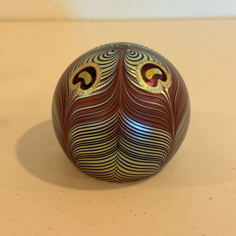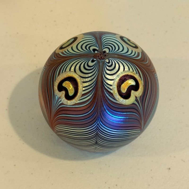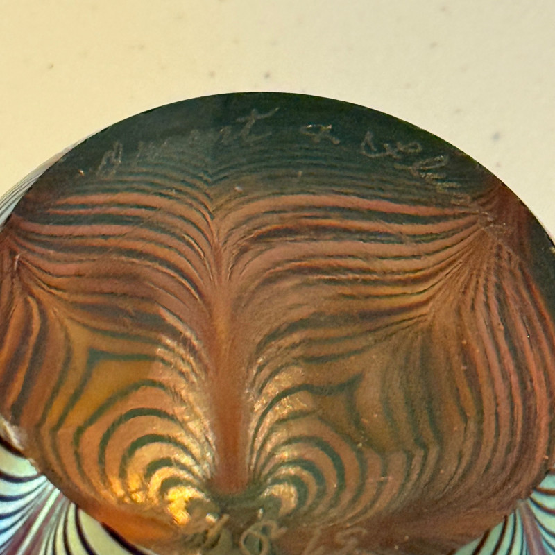 A striking example of 1970s American studio glass artistry, this iridescent pulled feather paperweight displays flowing symmetrical feather patterns in radiant hues of cobalt blue, copper, and gold. The shimmering surface reveals abstract teardrop and heart-like motifs surrounded by intricate feathering, creating a hypnotic sense of movement and depth. The piece is etched on the base “57 @ 1977,” a mark consistent with early Orient & Flume production dating from the late 1970s. The delicate luster and precision patterning embody the distinctive quality and craftsmanship for which the studio became renowned. Dimensions: Approx. 3" diameter Founded in 1972 in Chico, California, Orient & Flume quickly rose to prominence as one of the leading American studio glass houses of the modern art glass movement. Known for their brilliant use of iridescence, luster techniques, and complex encased designs, the studio’s artists produced both decorative and collectible works inspired by Tiffany and Loetz traditions. Early examples from the 1970s—like this piece—were often individually numbered and dated, reflecting the studio’s emphasis on craftsmanship and limited production artistry.
