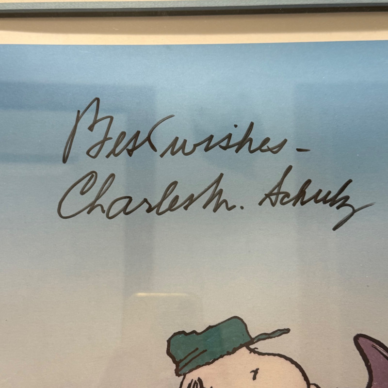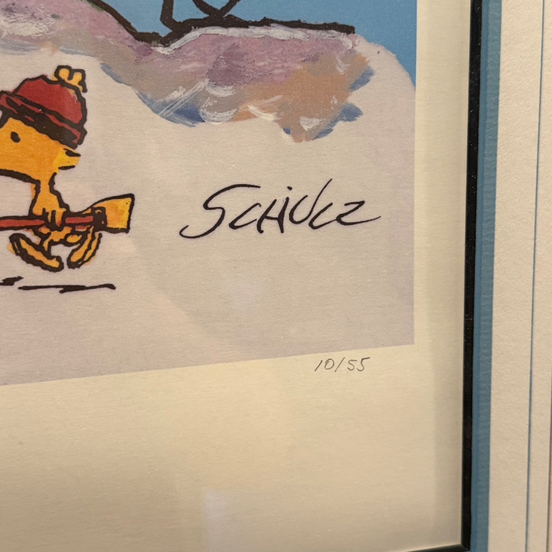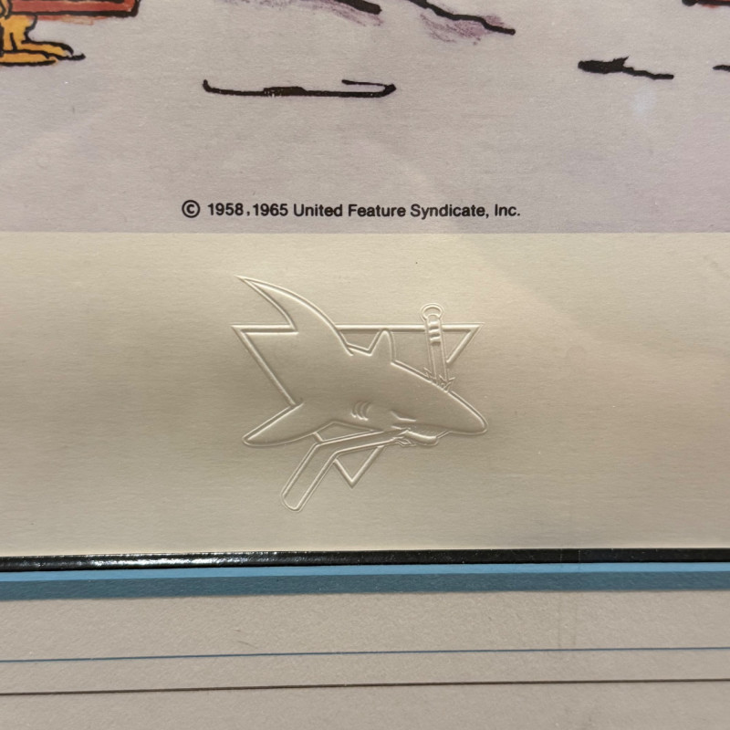 Rare limited-edition Peanuts lithograph personally hand-signed by Charles M. Schulz, featuring Snoopy driving a red Zamboni atop a birdbath while Woodstock and friends play hockey below. This piece was created in celebration of Schulz’s connection to the San Jose Sharks NHL franchise and reflects his well-known love for the sport of hockey. Edition & Authenticity: Hand-signed in marker: “Best Wishes – Charles M. Schulz” Numbered 10/55 (limited edition of only 55) Official San Jose Sharks embossed logo at the lower margin Copyright © 1958, 1965 United Feature Syndicate, Inc. Collecting Note: