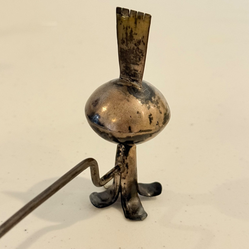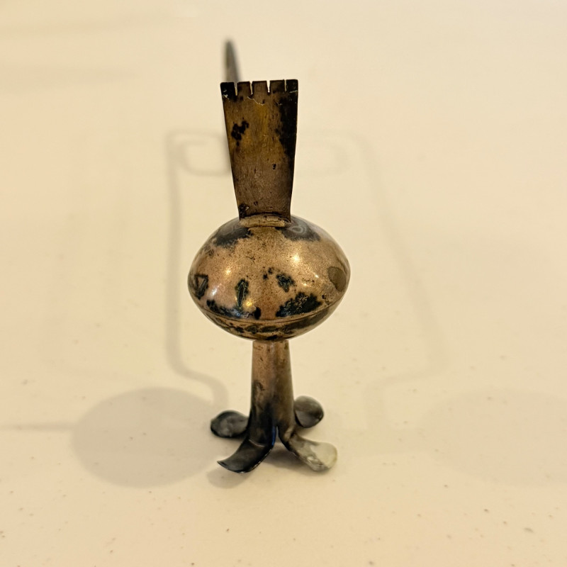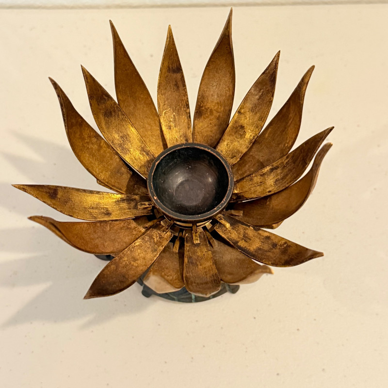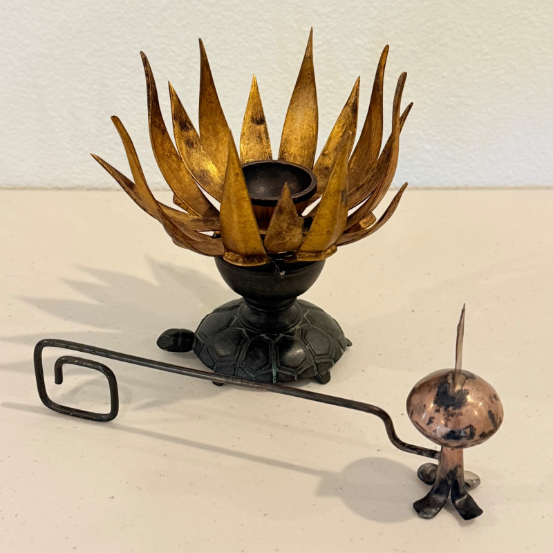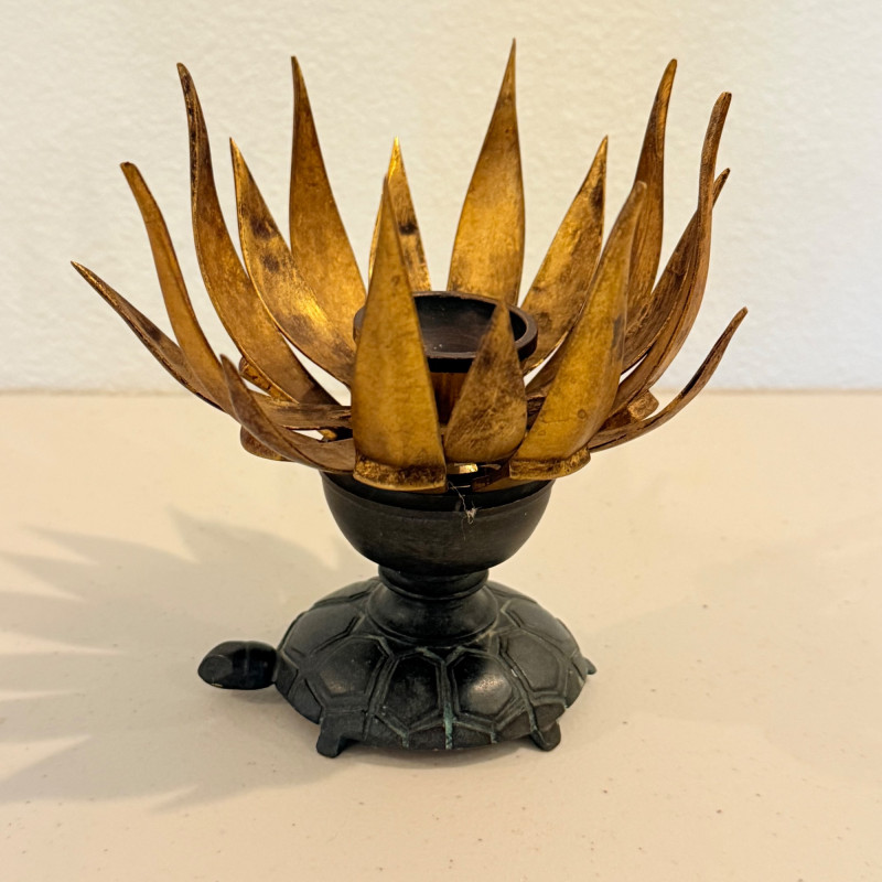 Elegant Tibetan Buddhist-style lotus candle holder paired with a squash blossom-form candle snuffer. The holder features gilt metal lotus petals surrounding a central candle cup, set atop a turtle-shaped base symbolizing stability and wisdom. The snuffer, crafted with a gourd-like finial and looped iron handle, complements the spiritual and sculptural balance of the set. Details: Material: Mixed metals with gilt and patinated finishes Design: Lotus blossom on turtle base; matching squash blossom snuffer Dimensions: Holder approx. 6.5" H × 5.5" W × 5.5" D Snuffer approx. 7.5" L × 2" W × 2" H Symbolism: