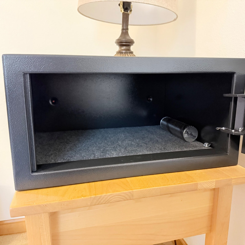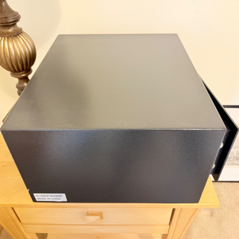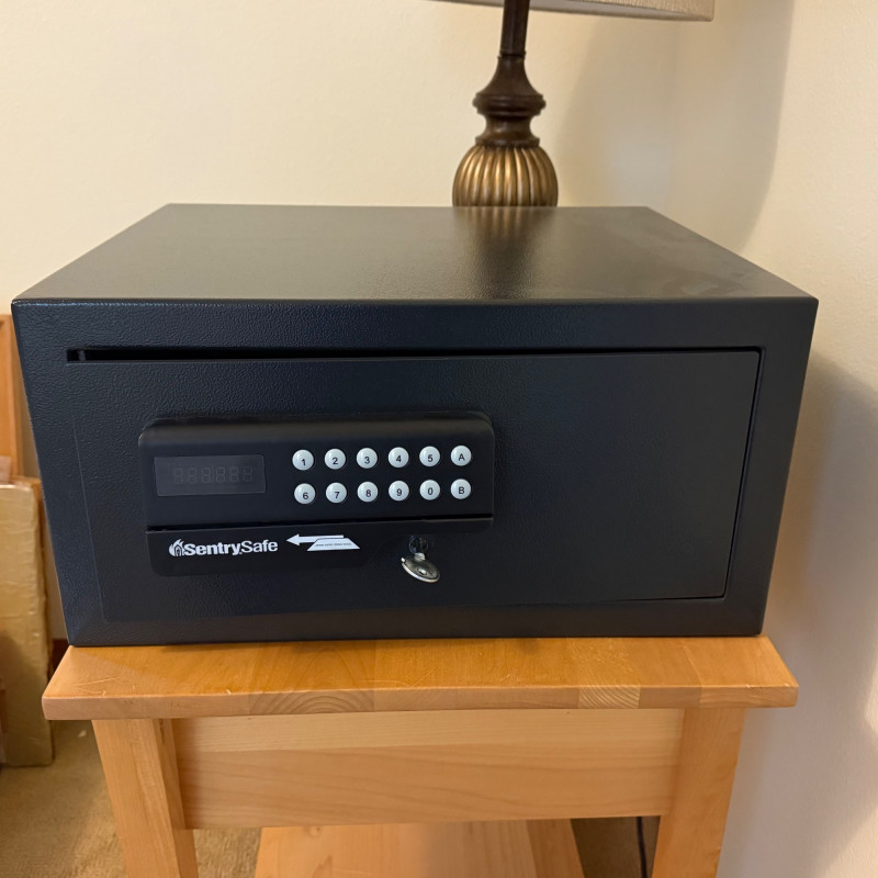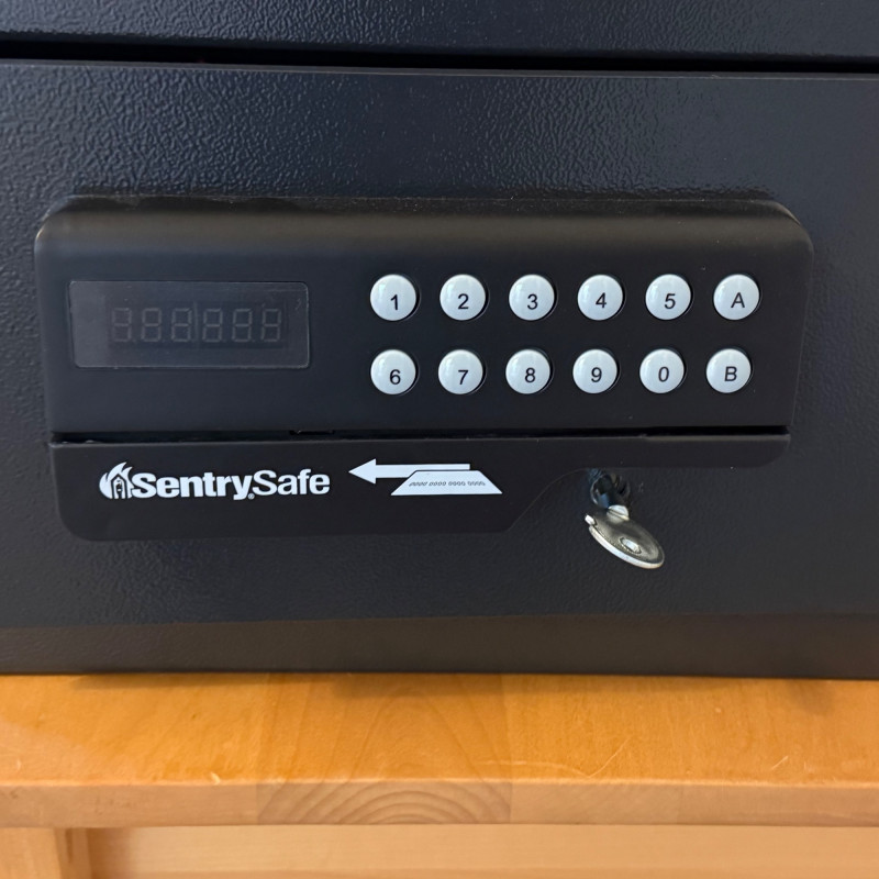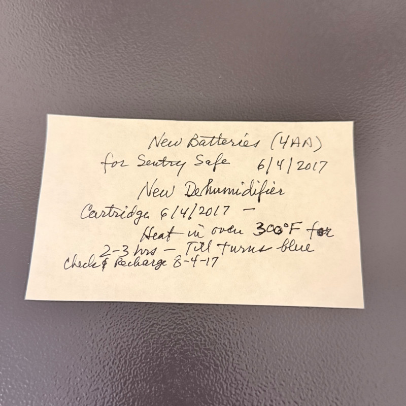 Secure and durable SentrySafe electronic deposit safe, ideal for safeguarding valuables, cash, or important documents. Built from solid steel with a matte black textured finish, this safe offers both digital keypad entry and manual key backup. The digital combination is unknown, and the batteries appear to be dead, but the key is included, allowing immediate manual operation. Inside, the safe contains a removable dehumidifier cartridge, along with a handwritten maintenance note, referencing battery replacement and dehumidifier recharge, suggesting careful maintenance by the previous owner. Details: Brand: SentrySafe Model: HL100ESF Material: Solid steel, black textured finish Features: Digital keypad lock (code unknown) Manual override key (included) Power: 4 × AA batteries (currently dead) Dimensions: 16.5" W × 14" D × 8" H Condition: Excellent exterior and interior condition; electronics untested due to dead batteries.