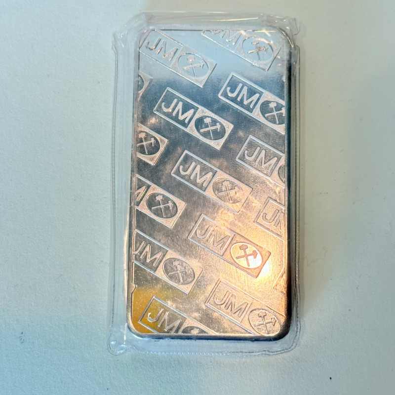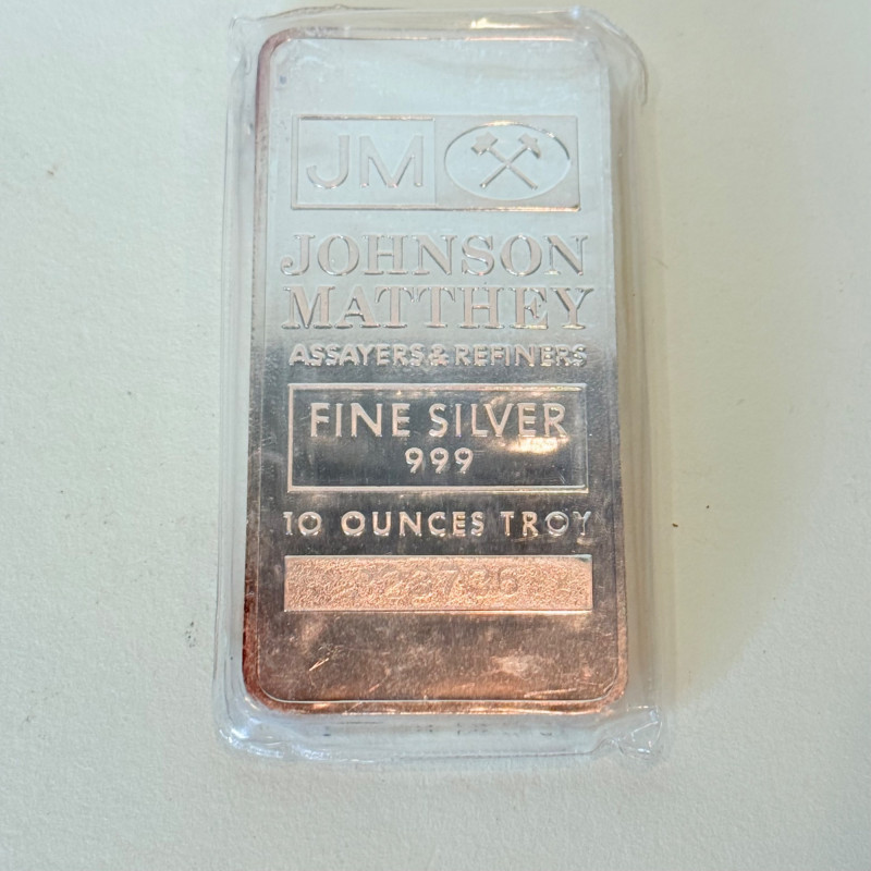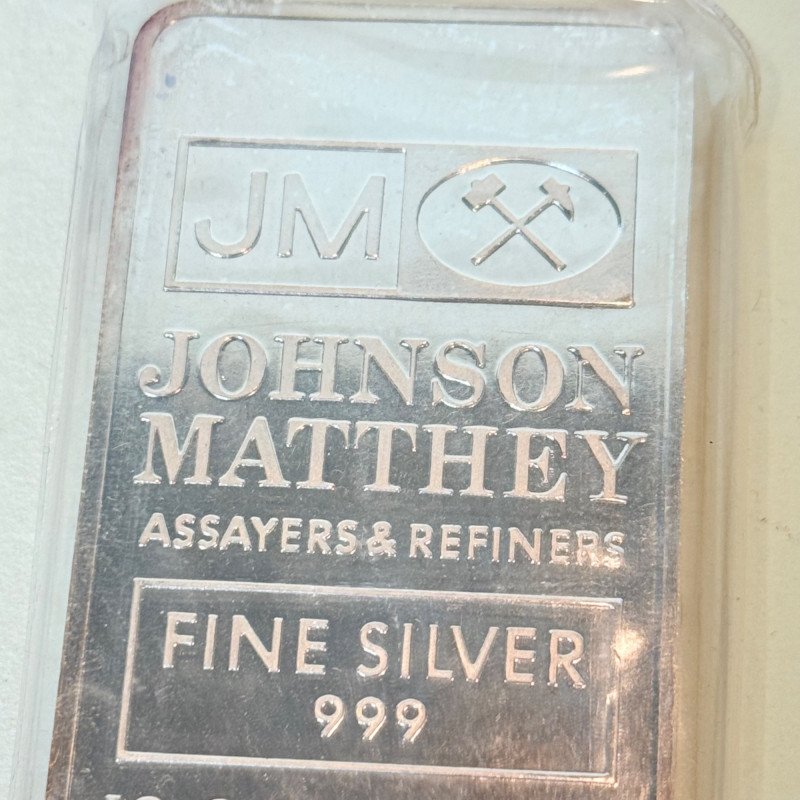 A highly collectible 10 Troy ounce silver bar produced by Johnson Matthey, one of the world’s most trusted names in precious metal refining. This bar is composed of .999 fine silver and bears the distinctive JM logo with crossed hammers, along with the full text: Specifications: Maker: Johnson Matthey Material: .999 Fine Silver Weight: 10 Troy Ounces Form: Cast/Pressed Bullion Bar Finish: Bright, reflective surface; light toning and handling marks visible through plastic