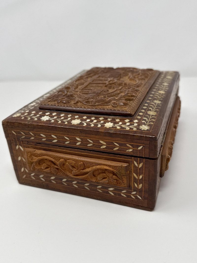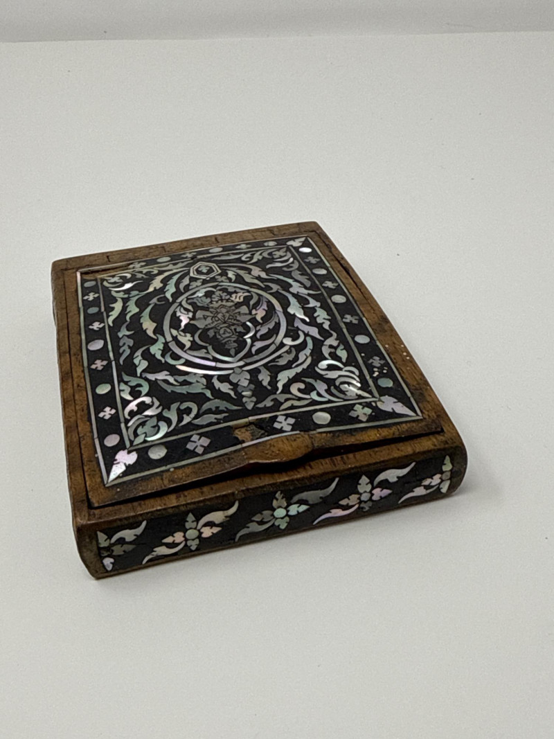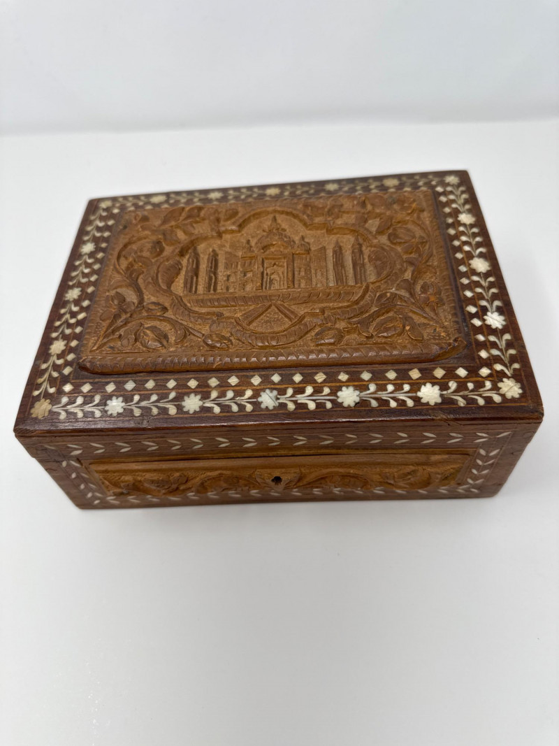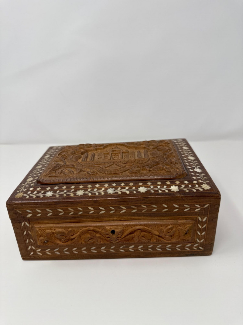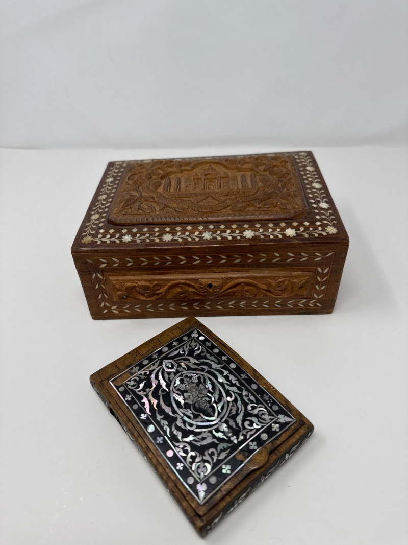 Dimensions: 7.25ʺ wide × 5ʺ deep × 3ʺ tall Material: Hand-carved rosewood (or similar hardwood) with bone or faux-ivory inlay Origin: Agra, India Design: Finely carved lid depicting the Taj Mahal surrounded by floral scrollwork and bordered with intricate bone inlay. The interior is lined in deep blue velvet and includes a fitted removable tray and mirror. Period: Early 20th Century (Anglo-Raj influence) Style Notes: A beautifully crafted Anglo-Indian jewelry box that reflects Agra’s renowned tradition of inlaid woodwork. Elegant, richly detailed, and both decorative and functional. Dimensions: 4.5ʺ wide × 3ʺ deep Material: Wood with black lacquer and mother-of-pearl inlay Origin: East Asia (likely Korea or Vietnam) Design: Hand-inlaid with iridescent mother-of-pearl in intricate foliate scrolls and medallion motifs on a black lacquer field. The interior features a deep red lacquer finish. Period: Mid-20th Century Style Notes: Exemplifies traditional East Asian lacquer artistry with shimmering shell inlay. A delicate and decorative piece suited for trinkets or snuff.A – Anglo-Indian Taj Mahal Inlaid Jewelry Box