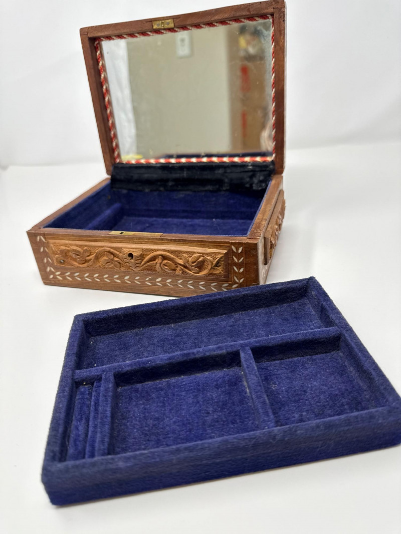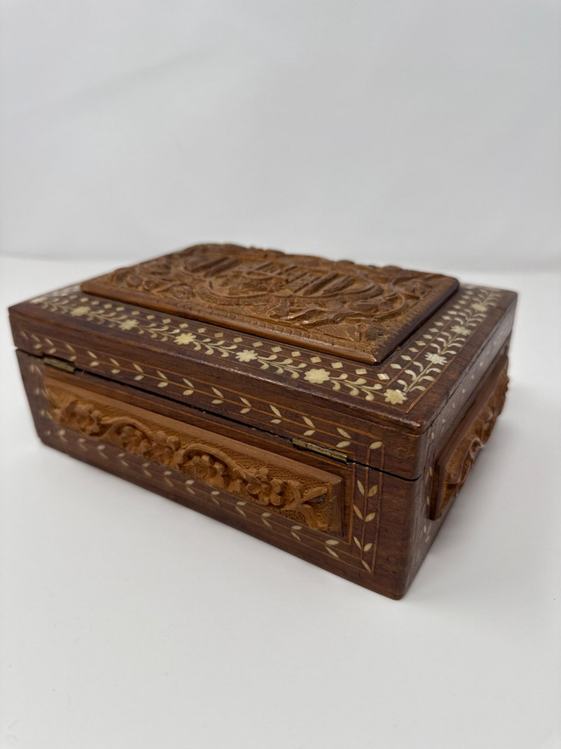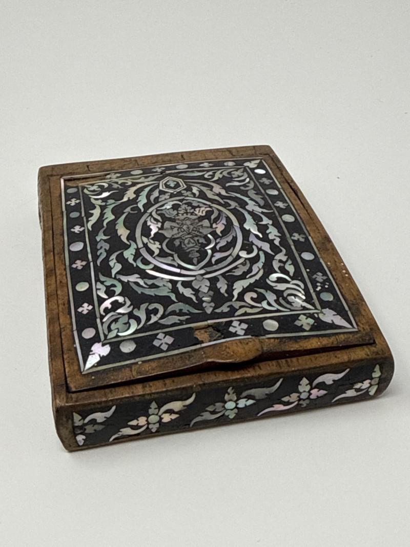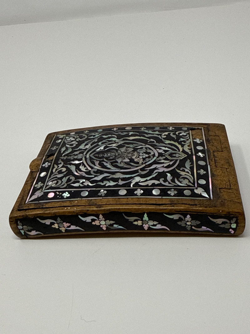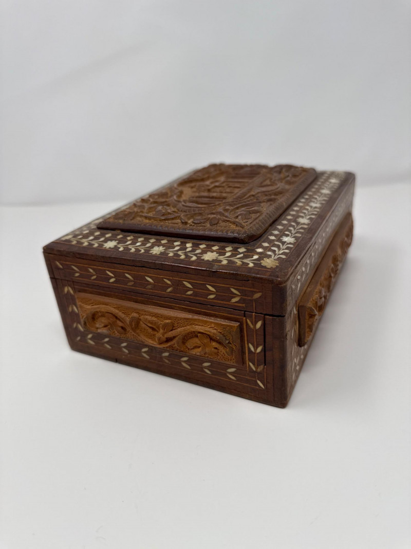 Dimensions: 7.25ʺ wide × 5ʺ deep × 3ʺ tall Material: Hand-carved rosewood (or similar hardwood) with bone or faux-ivory inlay Origin: Agra, India Design: Finely carved lid depicting the Taj Mahal surrounded by floral scrollwork and bordered with intricate bone inlay. The interior is lined in deep blue velvet and includes a fitted removable tray and mirror. Period: Early 20th Century (Anglo-Raj influence) Style Notes: A beautifully crafted Anglo-Indian jewelry box that reflects Agra’s renowned tradition of inlaid woodwork. Elegant, richly detailed, and both decorative and functional. Dimensions: 4.5ʺ wide × 3ʺ deep Material: Wood with black lacquer and mother-of-pearl inlay Origin: East Asia (likely Korea or Vietnam) Design: Hand-inlaid with iridescent mother-of-pearl in intricate foliate scrolls and medallion motifs on a black lacquer field. The interior features a deep red lacquer finish. Period: Mid-20th Century Style Notes: Exemplifies traditional East Asian lacquer artistry with shimmering shell inlay. A delicate and decorative piece suited for trinkets or snuff.A – Anglo-Indian Taj Mahal Inlaid Jewelry Box