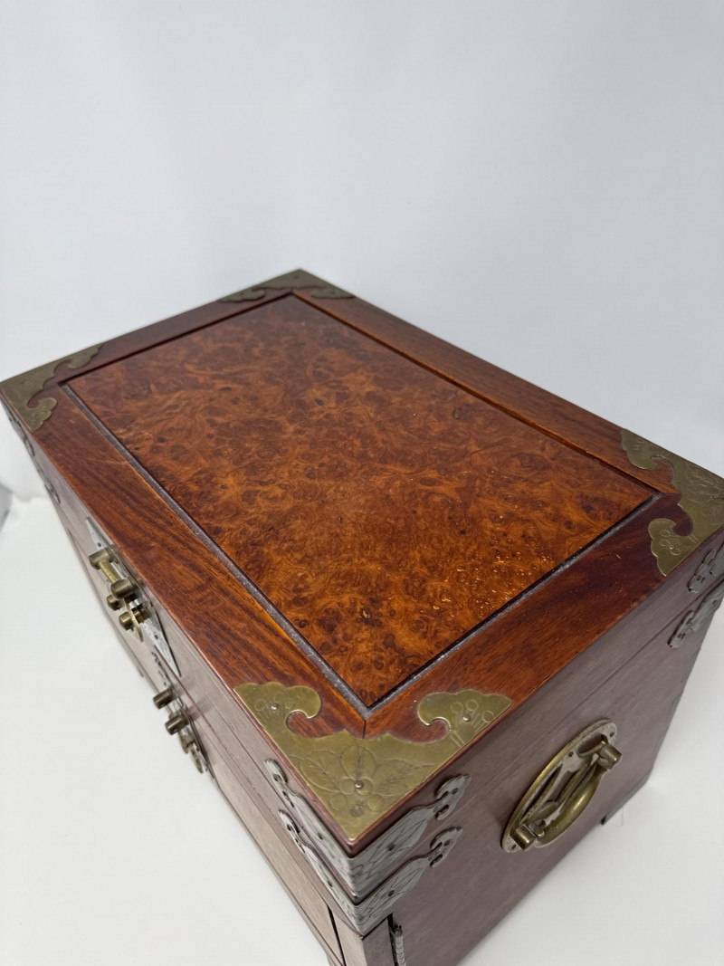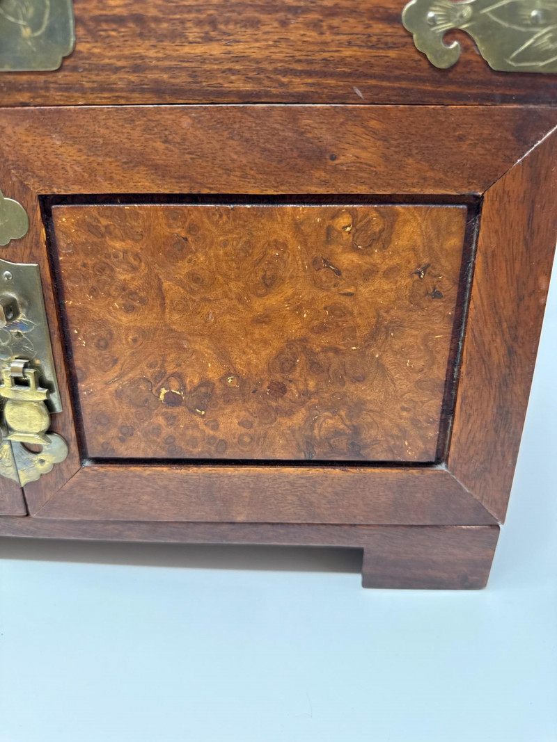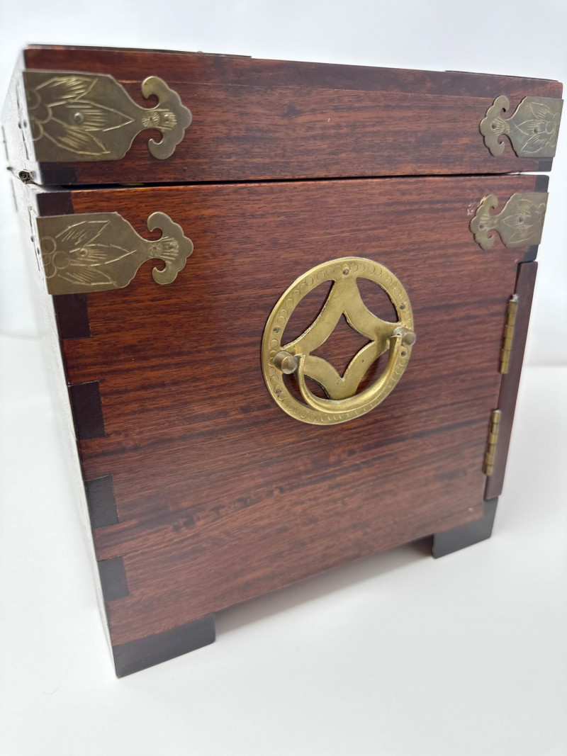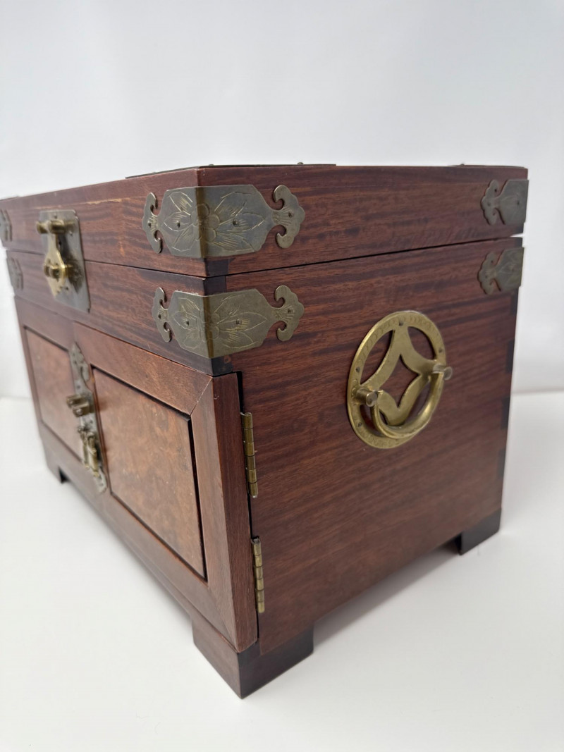 Elegant vintage Asian jewelry chest crafted from richly toned wood and adorned with ornate brass fittings. The hinged top opens to reveal a vibrant turquoise-blue silk interior embroidered with auspicious motifs. Three pull-out drawers are concealed behind double doors, providing storage for jewelry and keepsakes. Traditional brass side handles and corner mounts add a refined decorative touch. Features: Likely Korean or Chinese craftsmanship, mid-20th century Solid wood construction with brass hardware Blue embroidered silk-lined interior Three drawers behind hinged doors Approx. 7.25" W × 5" D × 3" H Collecting Note: These Asian jewelry chests reflect the artistry and practicality of mid-century craftsmanship. Their combination of brass fittings, fine joinery, and silk-lined interiors make them enduring examples of Asian decorative design.