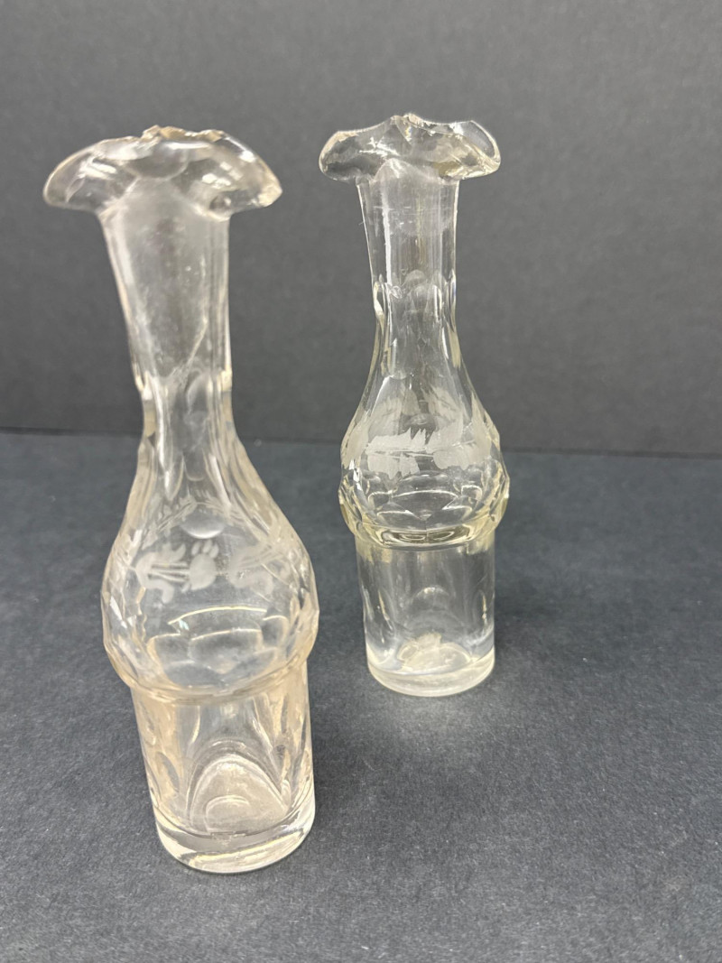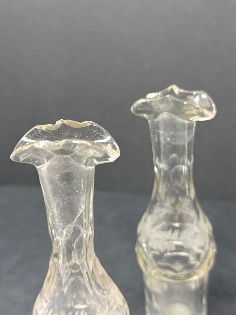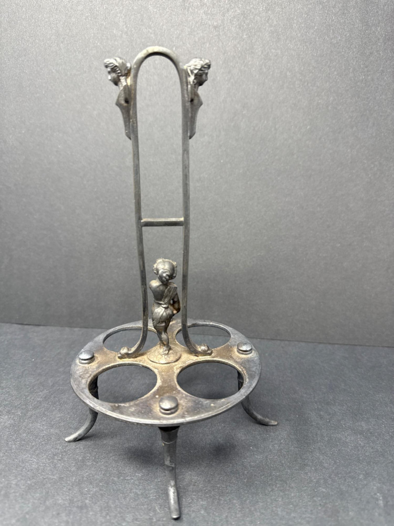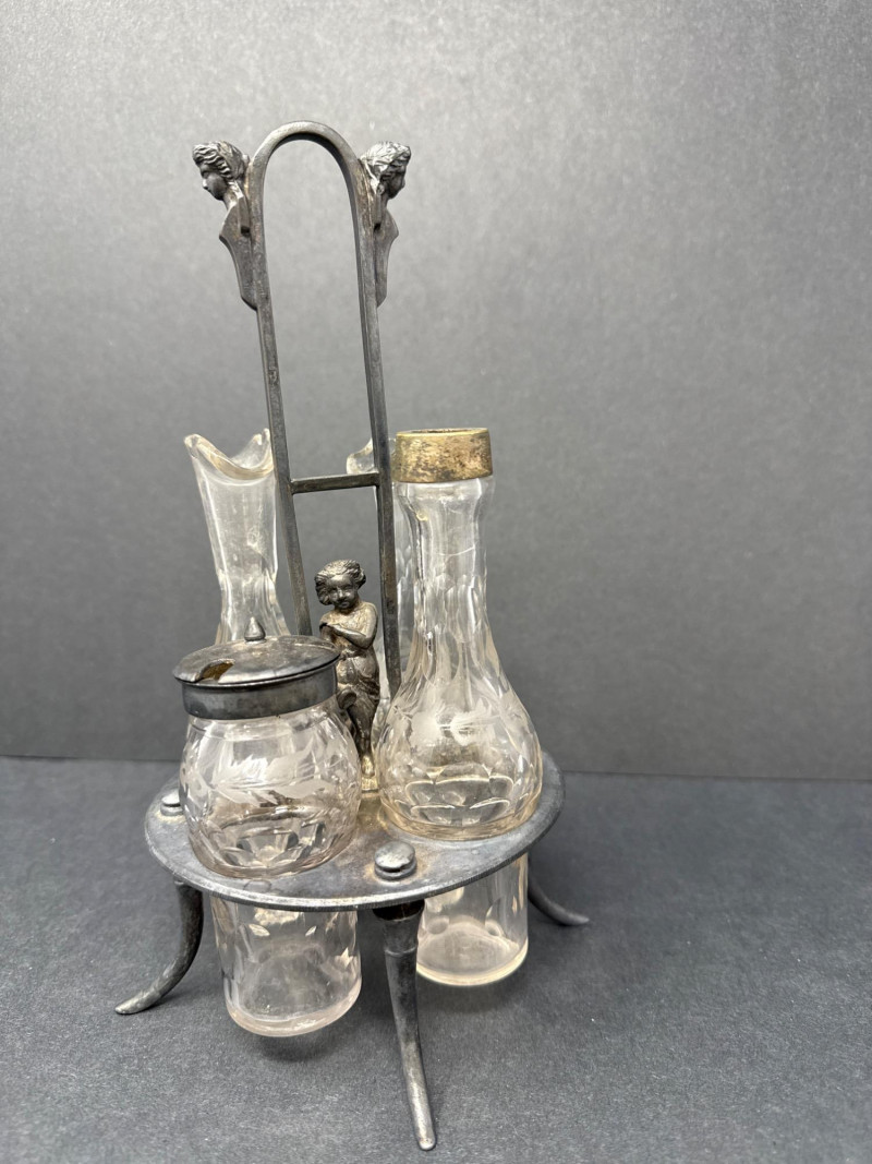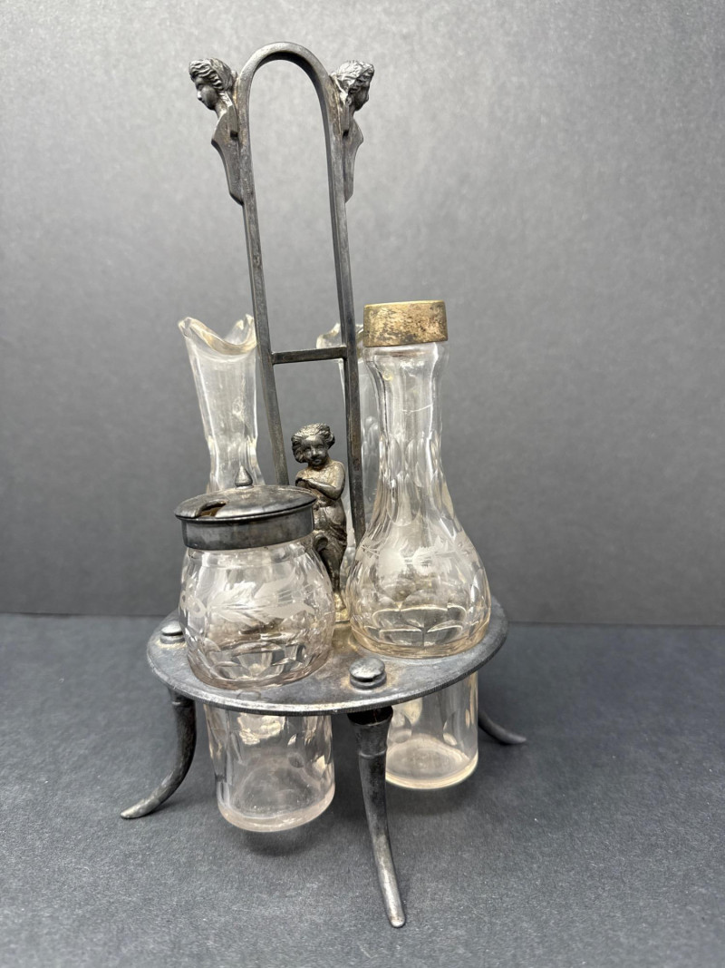 Elegant late 19th-century Victorian cruet set, featuring an ornate silverplate stand with cherub figure at the center and twin maiden bust finials at the handle top. Supported by curved legs, this four-bottle frame reflects the refined Aesthetic Movement design popular from circa 1880–1890. Set Includes: (1) Silverplate figural stand with cherub and maiden motifs – 4-bottle capacity (4) Etched glass bottles with floral engraving Dimensions: 9” tall × 4” wide Condition Note: One fluted bottle chipped on rim Collecting Note: Dating to the Victorian Aesthetic period (c.1880–1890), this four-bottle cruet caddy exemplifies the era’s fascination with nature-inspired ornament and figural design. Similar examples by Wilcox Silver Plate Co. and Meriden Britanniafeature comparable cherub and maiden motifs. Complete sets like this remain prized among collectors for their craftsmanship, elegance, and table presentation value.