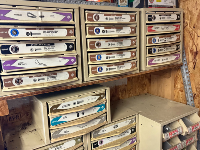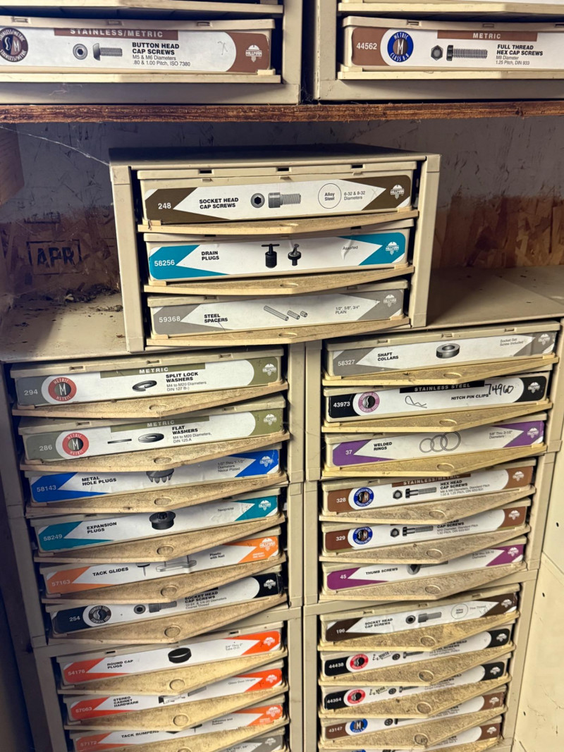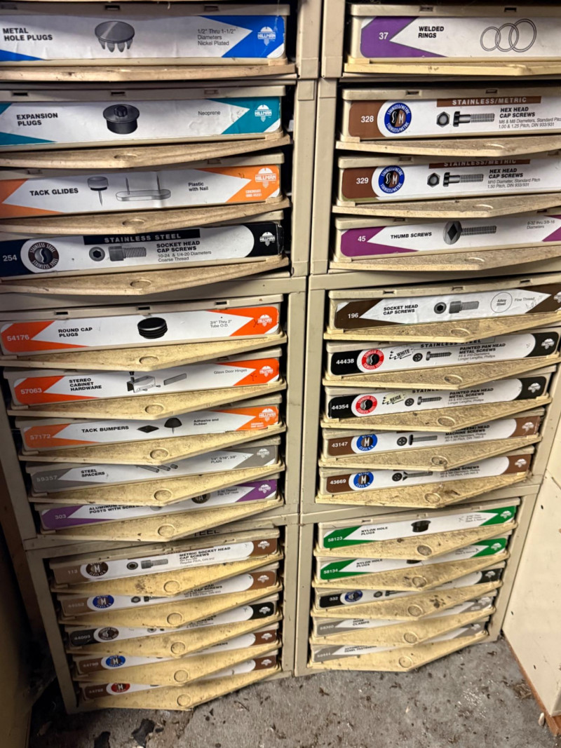 A comprehensive set of commercial-grade metal and plastic hardware storage cabinets, The tall units measure approximately 40” H x 13” W x 10–16” D and are designed for workshop or industrial use. Collecting Note: