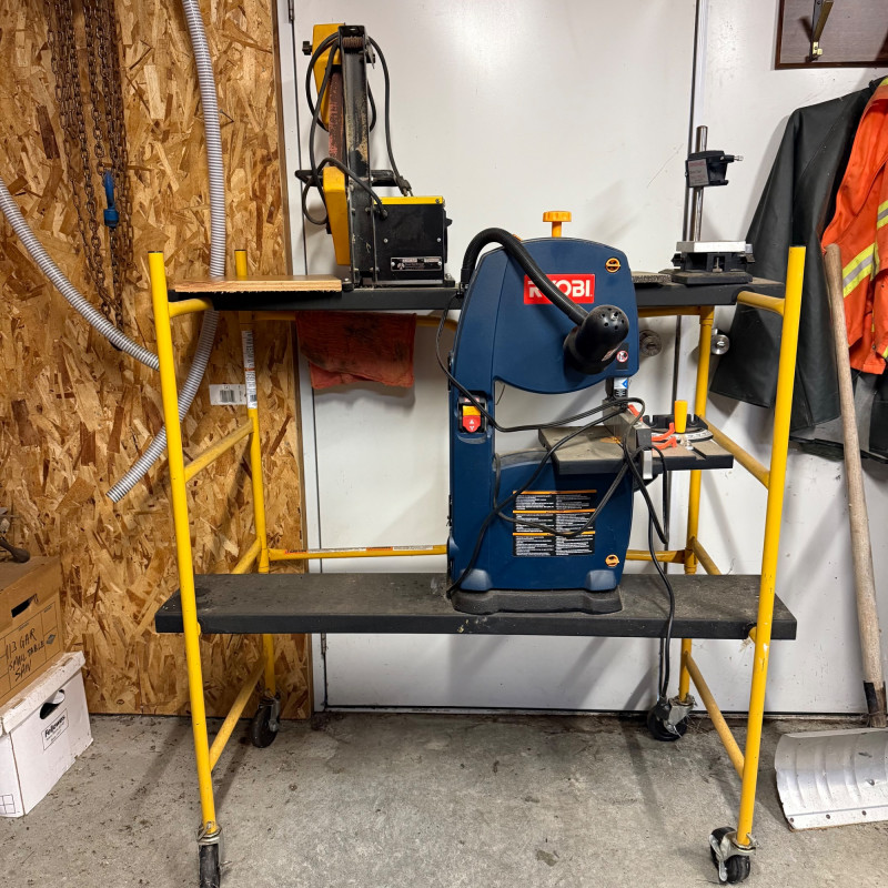 Dimensions: 24" tall × 14" wide × 10" deep Model / Power: BS902 – 9" (229 mm) band saw, 120V / 2.5A / 60Hz, 3000 FPM Design: Compact tabletop band saw with adjustable tilting table, precision blade guide, and safety paddle switch for steady operation. Origin: Ryobi Power Tools, made in China Style Notes: A reliable and smooth-running saw ideal for curved or straight wood cuts—perfect for hobbyists, model makers, and small workshop users. Dimensions: Approx. 40" tall × 13" wide × 10–16" deep Model / Serial: Model 31-322, Serial No. KN1871 – Rockwell International, Power Tool Division, Pittsburgh, PA, U.S.A. Design: Heavy-duty vertical belt sander with durable cast frame, adjustable platform, and industrial-grade performance for shaping and smoothing wood or metal. Style Notes: A vintage American-made Rockwell tool admired for its longevity, consistent power, and collectible industrial design. Dimensions: Approx. 12" tall × 7" base width Design: Compact adjustable drill press stand compatible with Dremel rotary tools. Ideal for small-scale drilling, engraving, and polishing projects. Style Notes: A precision accessory for craftspeople and model builders requiring fine control and accuracy. Rack Dimensions: 49.5” tall × 43” wide × 21” deep Design: Two-shelf rolling scaffold rack with yellow steel frame, offering portability and organized workspace for the tool set.Ryobi BS902 9” Band Saw