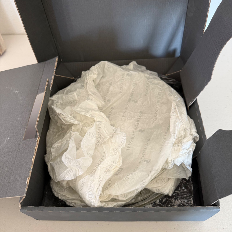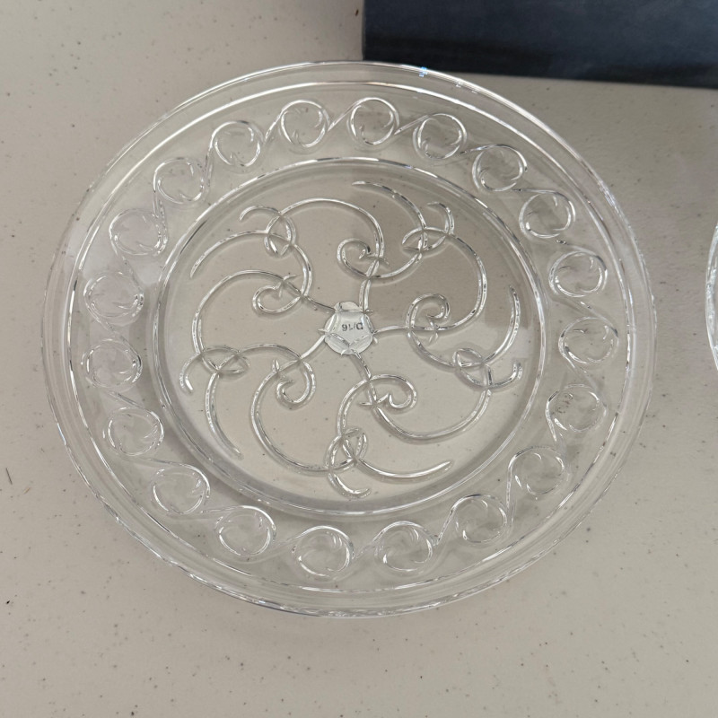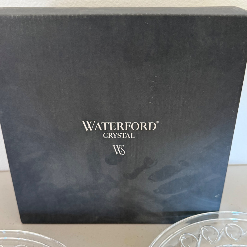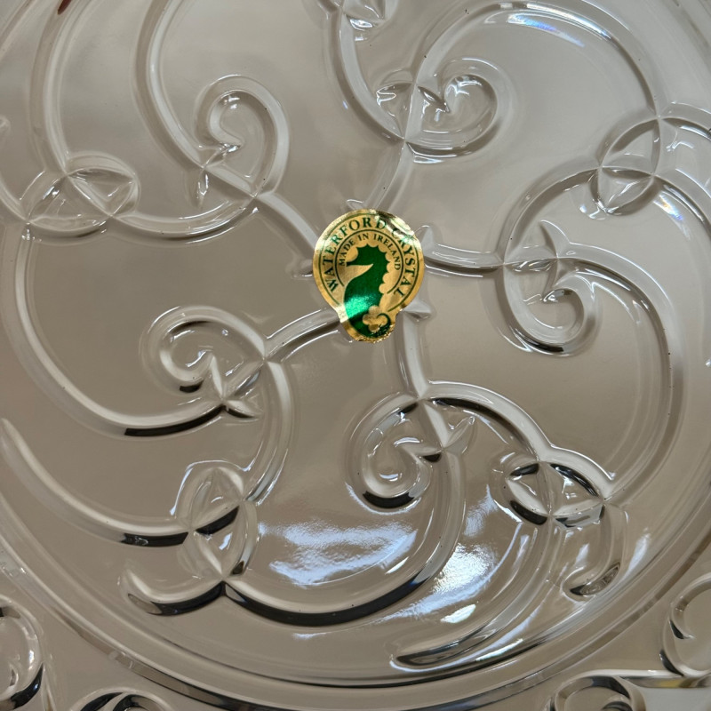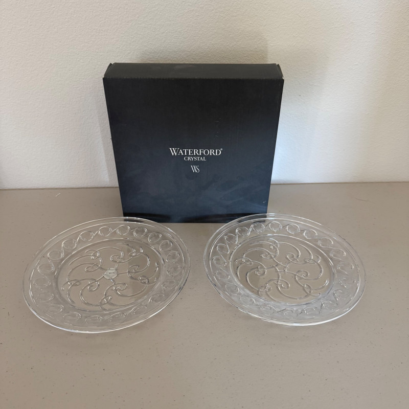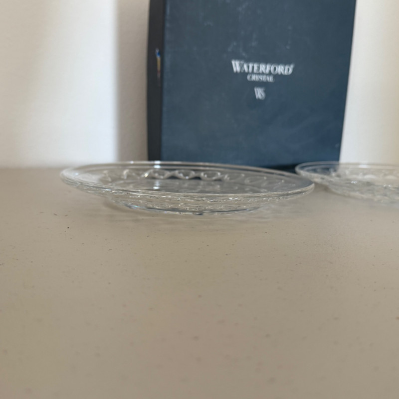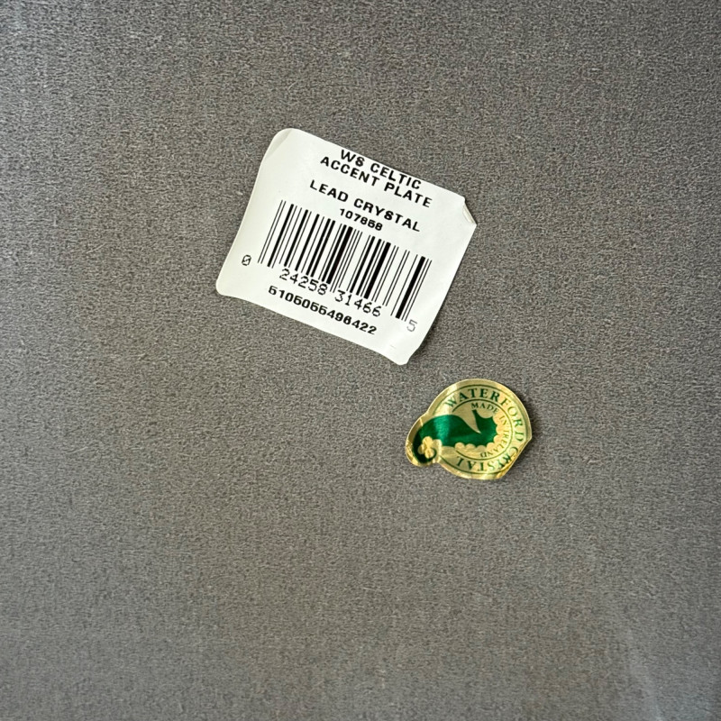 A beautiful pair of Waterford “WS Celtic” accent plates, each measuring 8 inches in diameter, crafted of brilliant lead crystal and featuring an intricate Celtic knot design in raised relief. These plates exemplify Waterford’s timeless artistry and exceptional craftsmanship. Maker: Waterford Crystal Pattern: WS Celtic Material: Lead Crystal Design: Raised swirling Celtic knot motif with smooth rim Diameter: 8 inches each Quantity: 2 plates Includes: Original Waterford box Origin: Made in Ireland Plate retains its original Waterford foil sticker, and the box bears the matching factory label marked “WS Celtic Accent Plate Lead Crystal 107886.” Collecting Note: