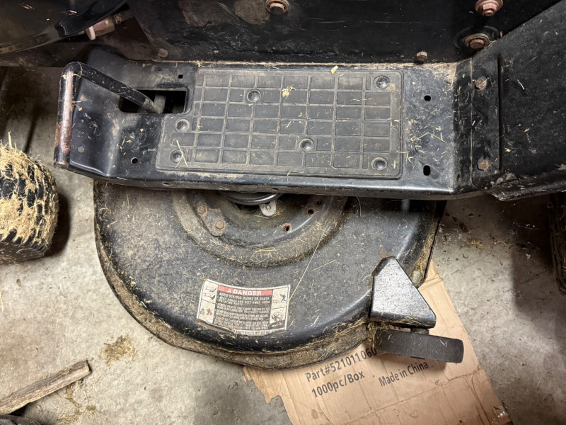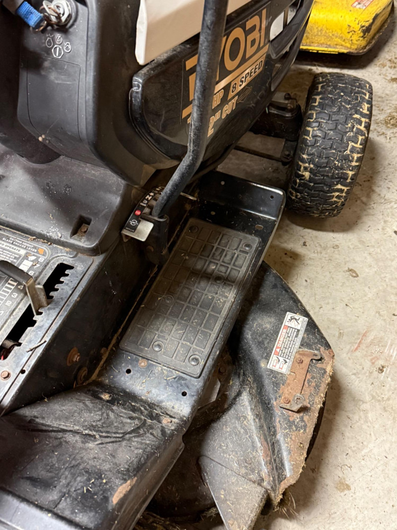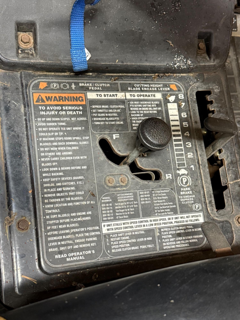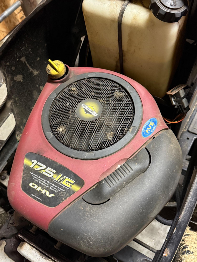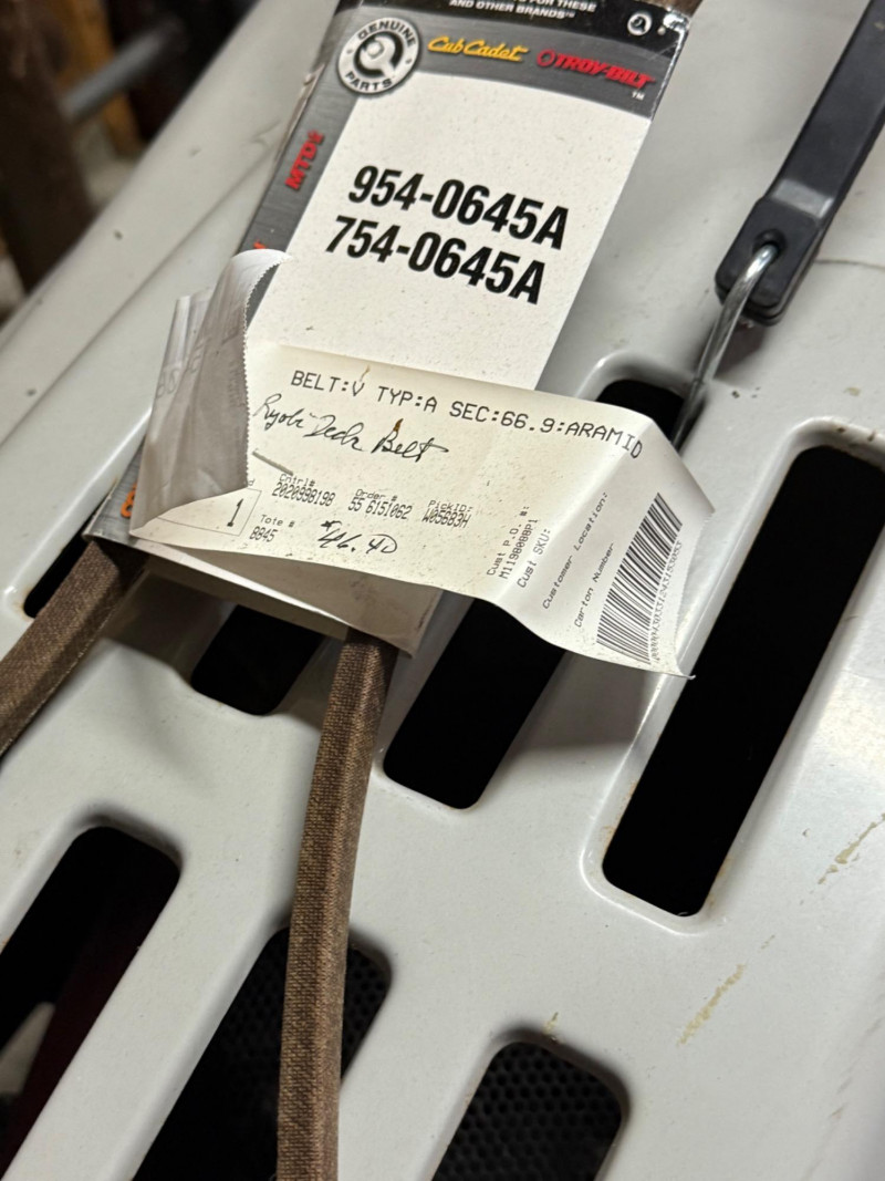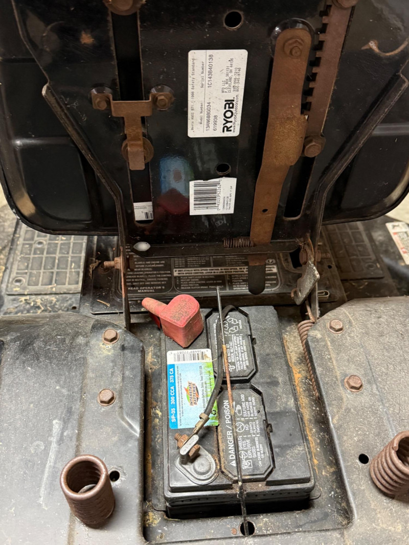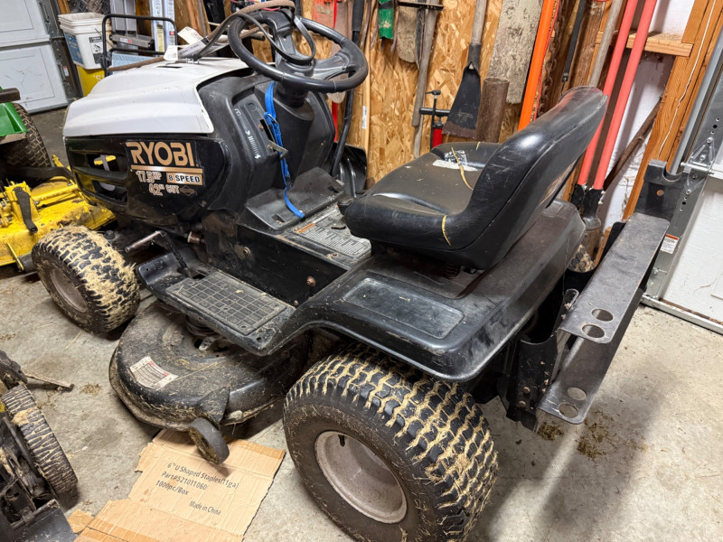 A sturdy Ryobi 17.5 horsepower riding lawn tractor powered by a Briggs & Stratton OHV engine, featuring a 42-inch cutting deck and 8-speed manual transmission. The mower includes the original seat (shows wear), deck assembly, and control levers intact. Comes with a replacement drive belt (Cub Cadet / Troy-Bilt part #954-0645A / 754-0645A) still in packaging. Model: Ryobi Riding Lawn Tractor (Briggs & Stratton 17.5 HP Engine) Cutting Width: 42 inches Transmission: 8-speed manual Engine Type: Briggs & Stratton 17.5 HP OHV I/C Condition: Used; battery is dead, and owner reports it needs work Collecting Note: Ryobi-branded lawn tractors with Briggs & Stratton engines were produced under MTD manufacturing in the early 2000s and are known for their serviceable design and cross-compatibility with Cub Cadet and Troy-Bilt parts.