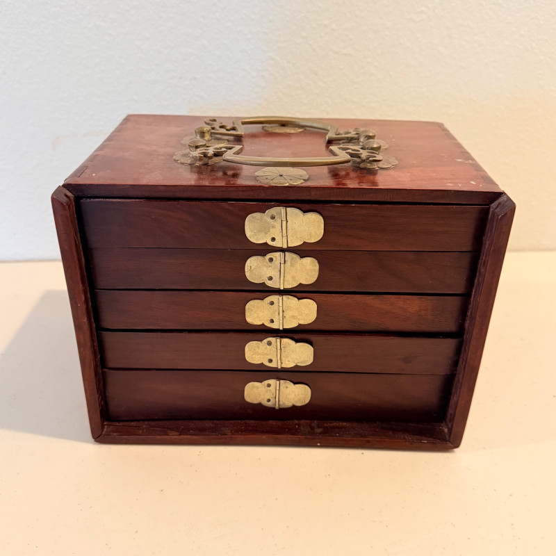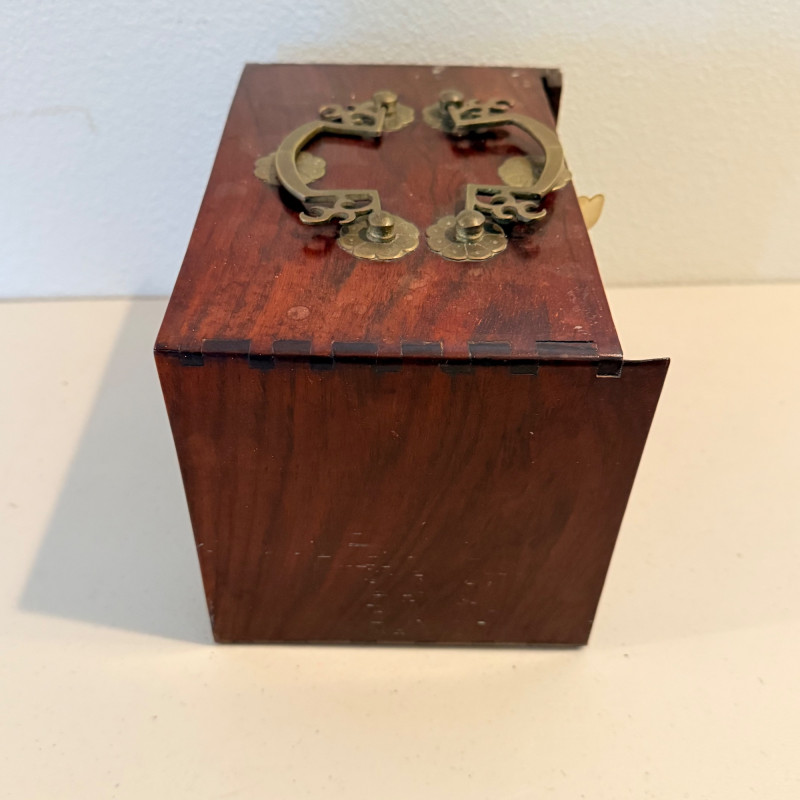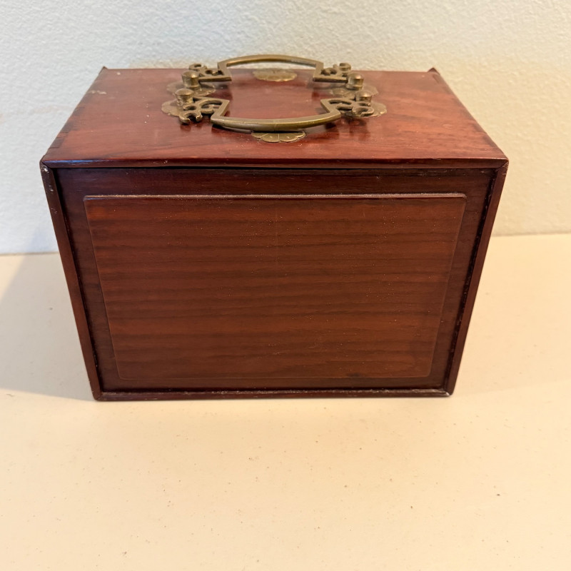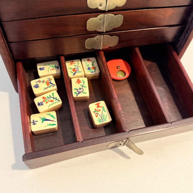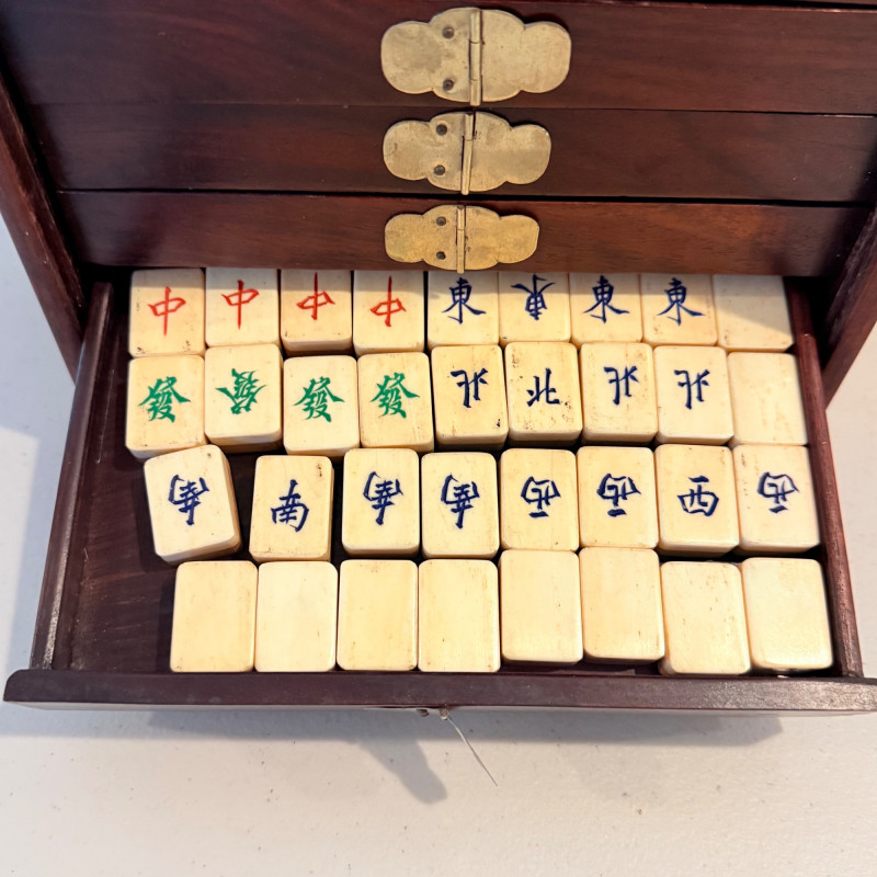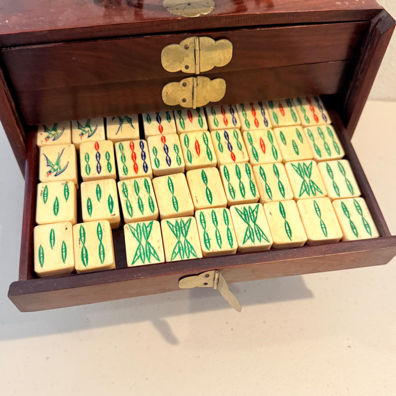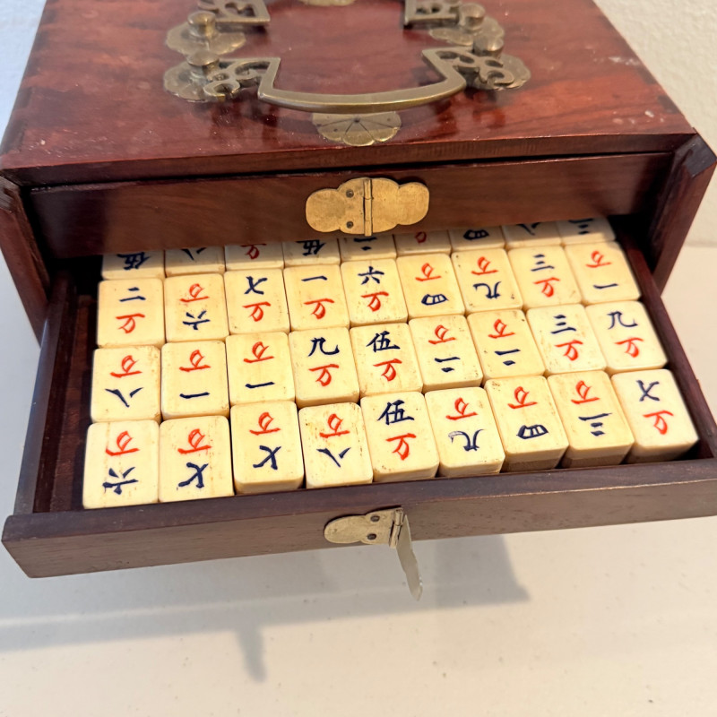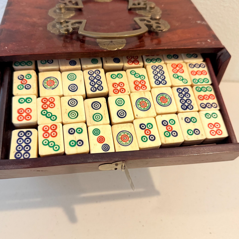 A beautifully crafted antique Mahjong set featuring hand-carved bone-and-bamboo tiles housed in a traditional hardwood case with ornate brass fittings. Each tile displays classic circle, bamboo, and character motifs in red, green, and blue — carefully engraved and hand-painted with rich detail. The set reflects early 20th-century Chinese craftsmanship, produced during the 1920s–1940s when bone-and-bamboo Mahjong sets were made for both domestic use and export. Materials: Bone and bamboo tiles; hardwood case with brass hardware Dimensions: Box measures approximately 6” H × 8” W × 5.5” D; tiles measure 1” × ¾” each Details: Hand-carved and ink-filled tiles stored in sliding drawers; brass handle and latch with decorative floral motifs Authenticity Note: The layered bone-and-bamboo construction, hand-engraved designs, and handmade brass fittings are indicative of authentic early 20th-century Chinese Mahjong sets, preceding the mid-century plastic reproductions.