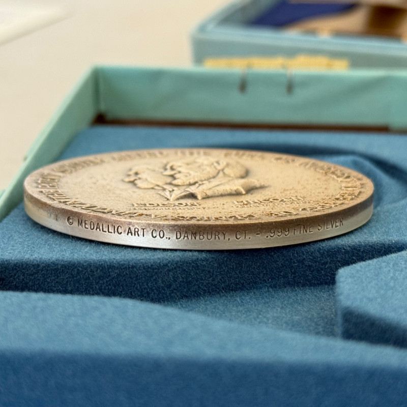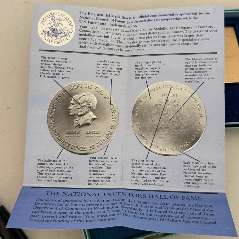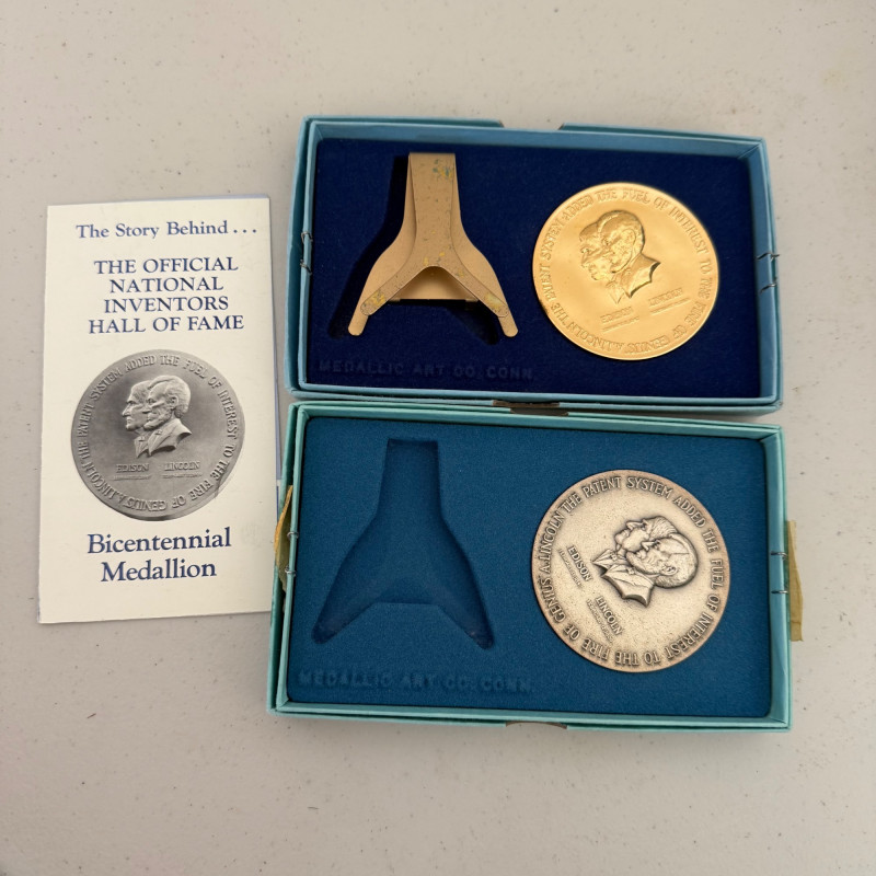 Set includes both medallions in their original blue velvet-lined presentation boxes, complete with display stand and official pamphlet issued in cooperation with the U.S. Patent and Trademark Office and National Council of Patent Law Associations.