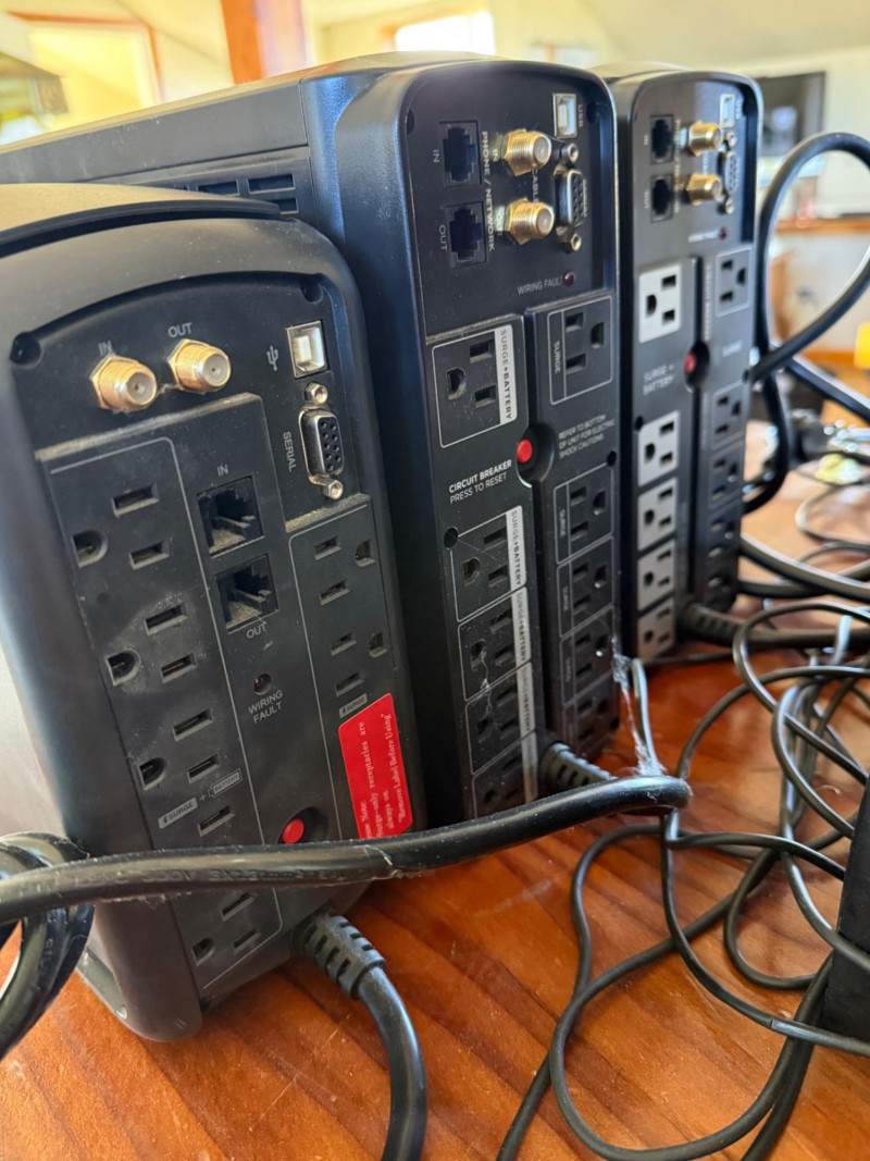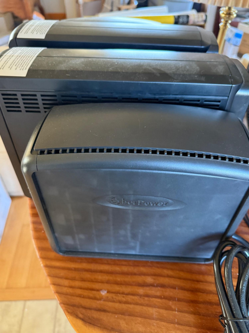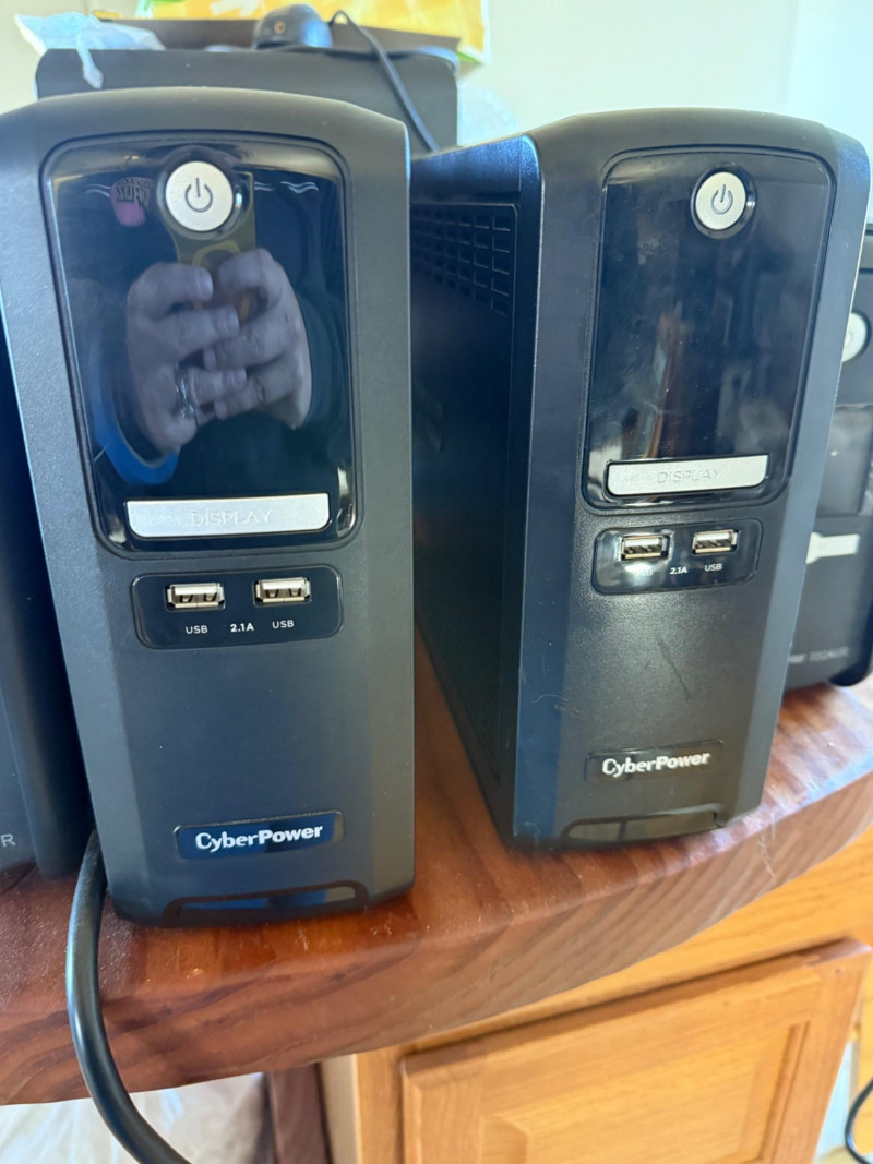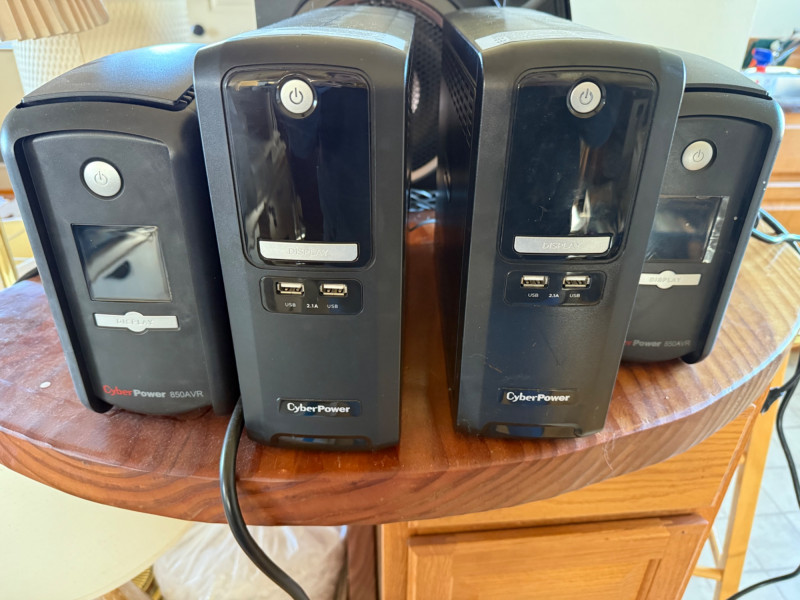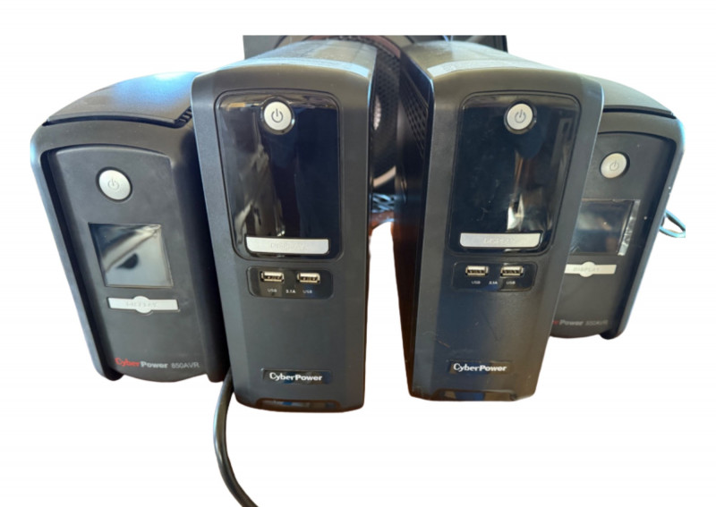 This lot includes four uninterruptible power supply (UPS) units by CyberPower, ideal for protecting computers, networking gear, and home electronics from power surges and outages. Details: (2) CyberPower 850AVR units with digital display panels (2) CyberPower 650AVR units Each features multiple battery-backup and surge-only outlets Equipped with USB charging ports (2.1A and standard USB) Input and output connections for phone/network coaxial protection