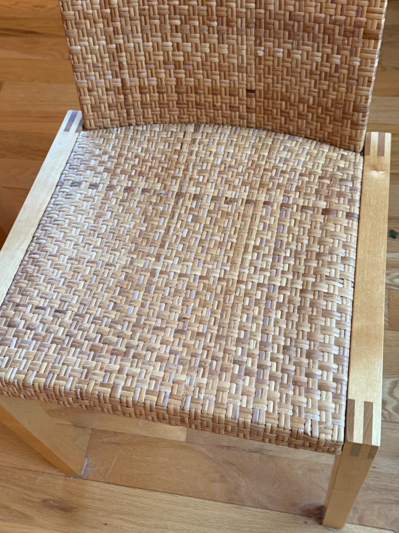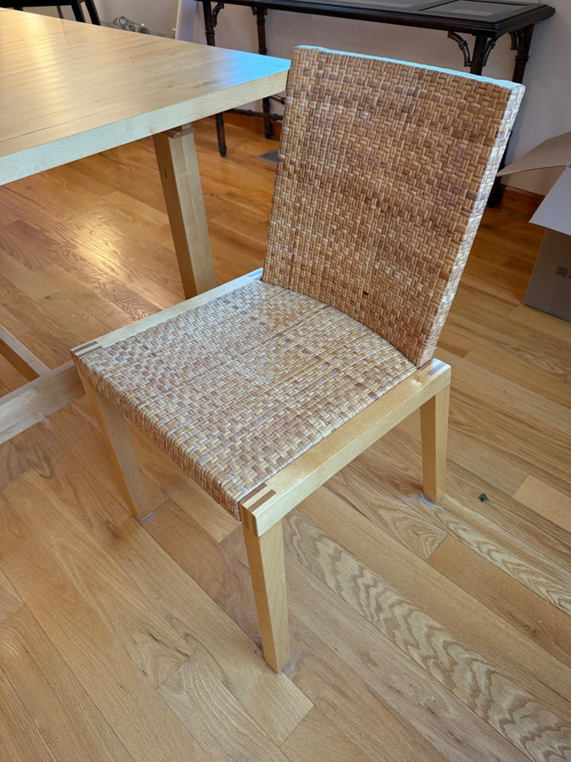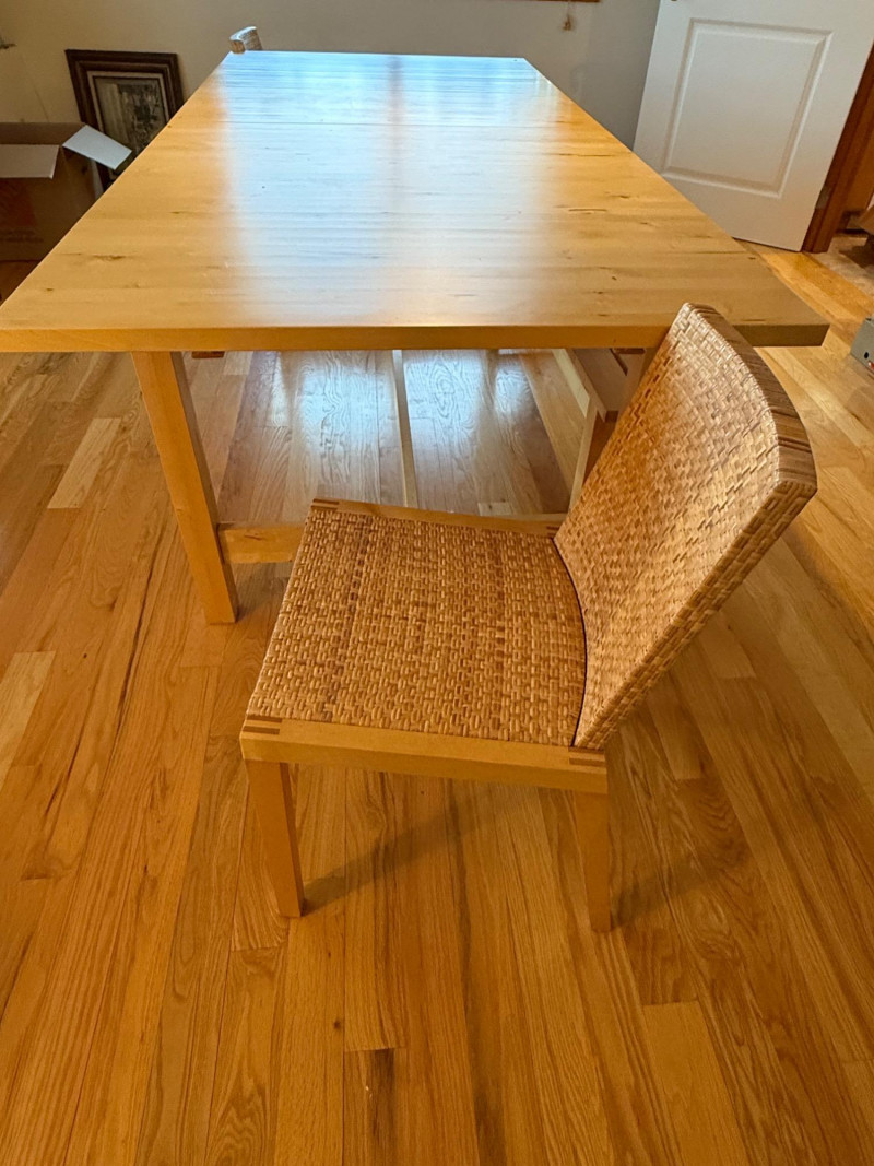 A clean-lined, Scandinavian dining set from IKEA’s Norden collection, crafted in solid birch wood. The natural tone and visible grain of the birch give this set a bright, modern warmth—ideal for both contemporary and minimalist interiors. Includes: (1) Dining Table (1) Matching Bench (2) Woven-Seat Chairs Details: Table: 29.5” H × 86” W × 38.5” D Bench: 18” H × 59” W × 14” D Chairs: 31” H × 17” W × 16” D Material: Solid birch wood with a clear natural finish Chair Seats: Handwoven rattan-style weave over a sturdy birch frame Design Notes: Simple, durable Scandinavian design emphasizing functionality and natural materials. The bench fits neatly beneath the table for efficient space saving. Clean, rectangular lines and a smooth matte finish highlight the craftsmanship of the solid birch top. The set’s light tone complements both neutral and vibrant room palettes. Collecting/Decor Note:
