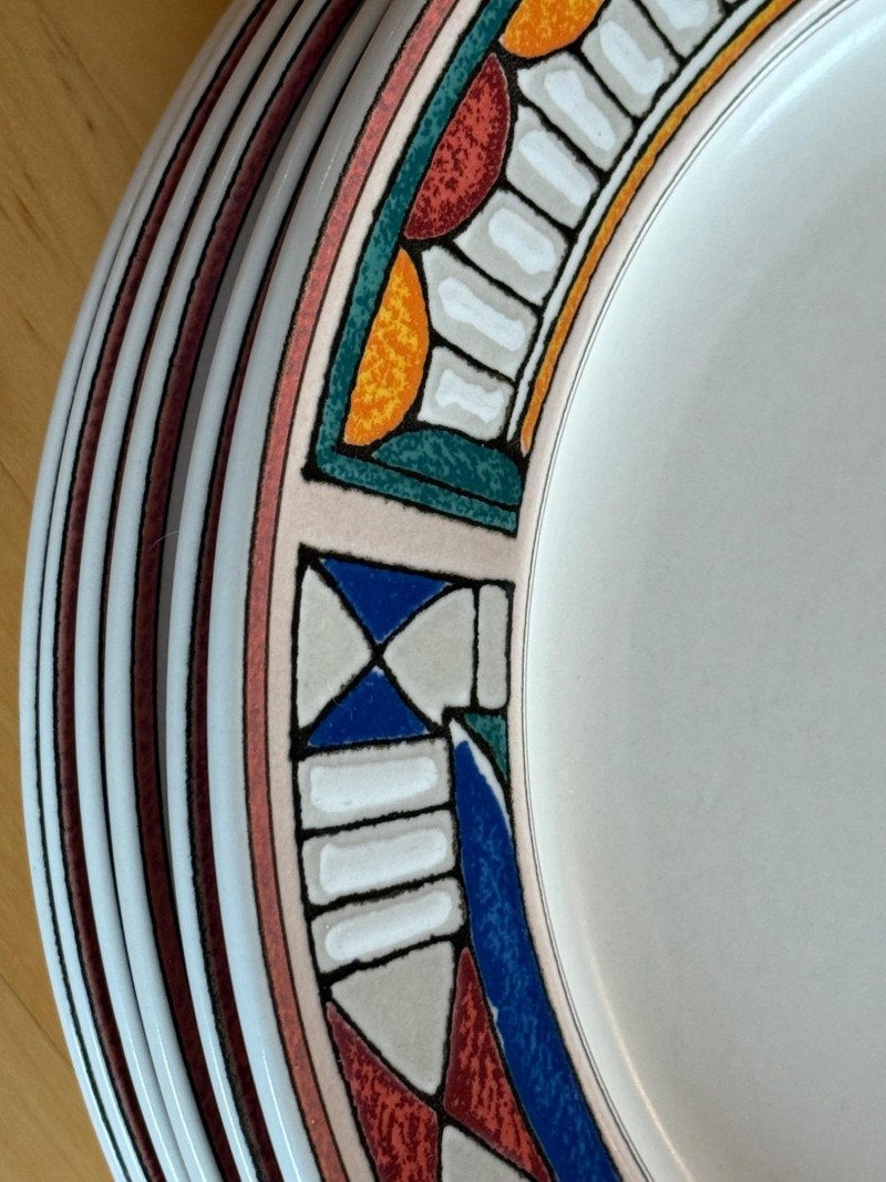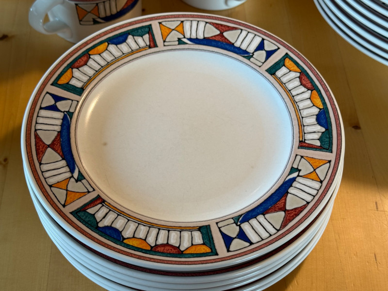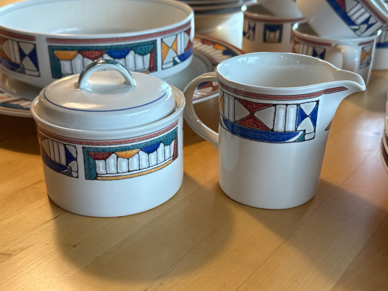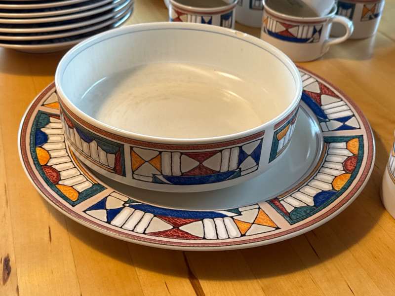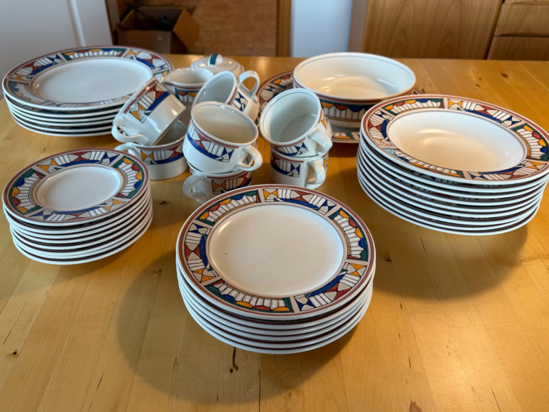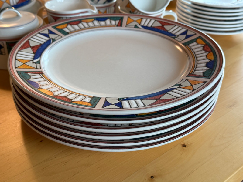 A vibrant and collectible Mikasa Intaglio “Collage” pattern dinnerware set, featuring bold geometric motifs in jewel tones of red, blue, yellow, and green accented by sculpted white relief detailing. This pattern, produced in Malaysia, is dishwasher and microwave safe, making it both practical and visually striking. Set Includes: 6 large dinner plates 6 medium plates 8 salad or dessert plates 9 soup/cereal bowls 7 handled cups Creamer and lidded sugar bowl 1 serving platter 1 large serving bowl (it has a chip on rim) Mark: Collecting Note: