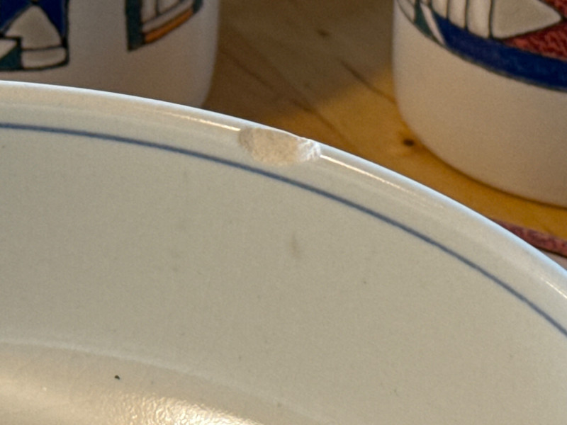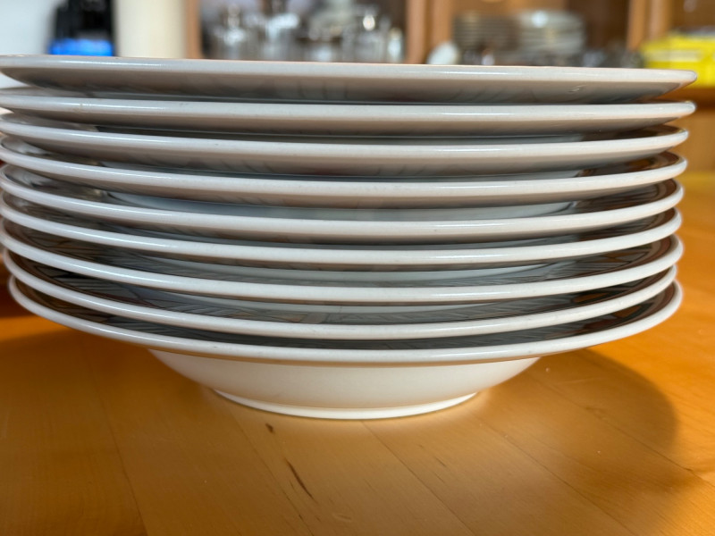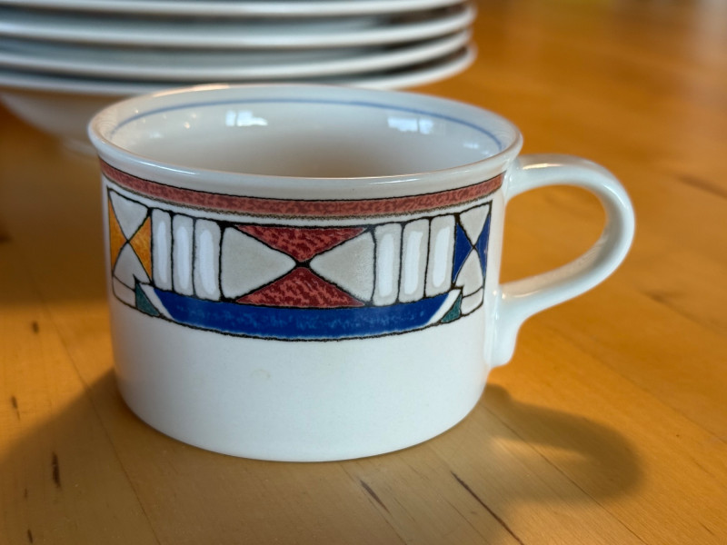The Collage pattern from Mikasa’s Intaglio line captures the postmodern design energy of the late 1980s to early 1990s. It’s a favorite among collectors for its bold geometric artistry and tactile raised texture, blending everyday function with artistic flair.