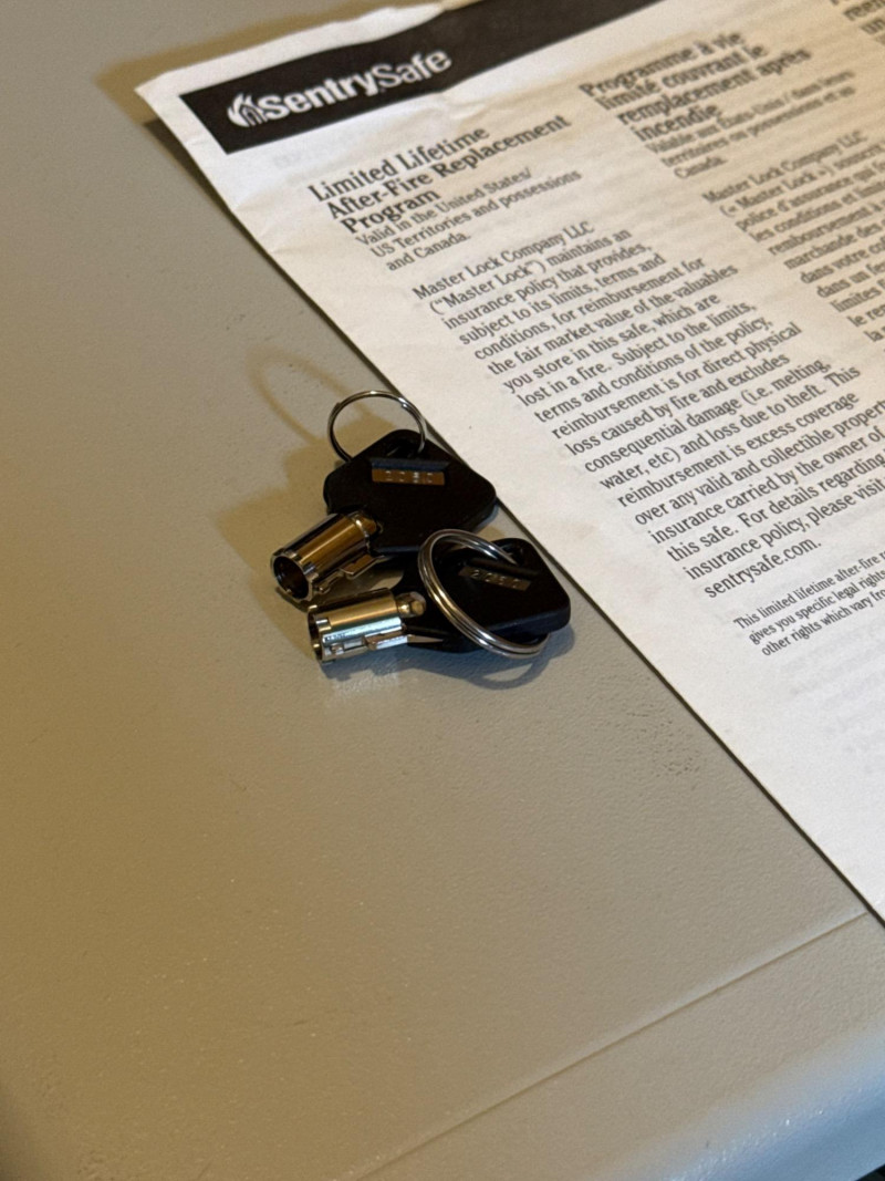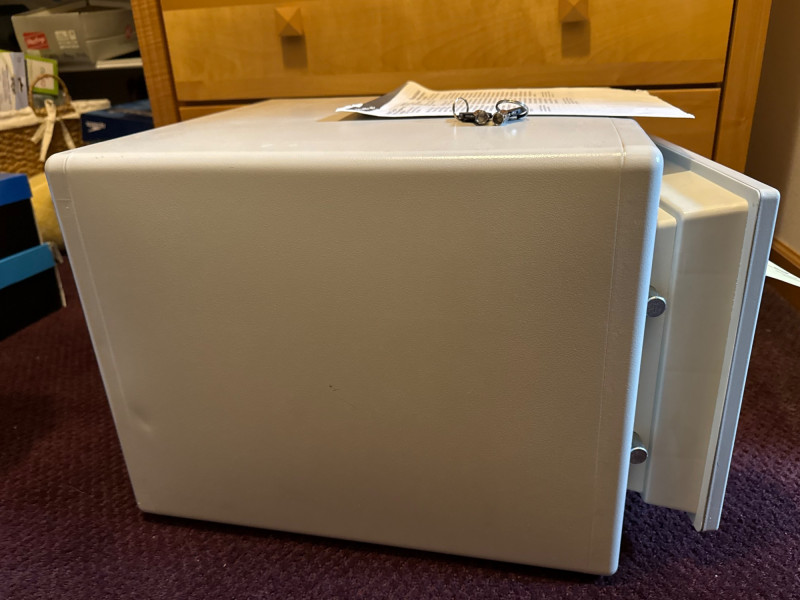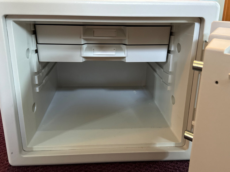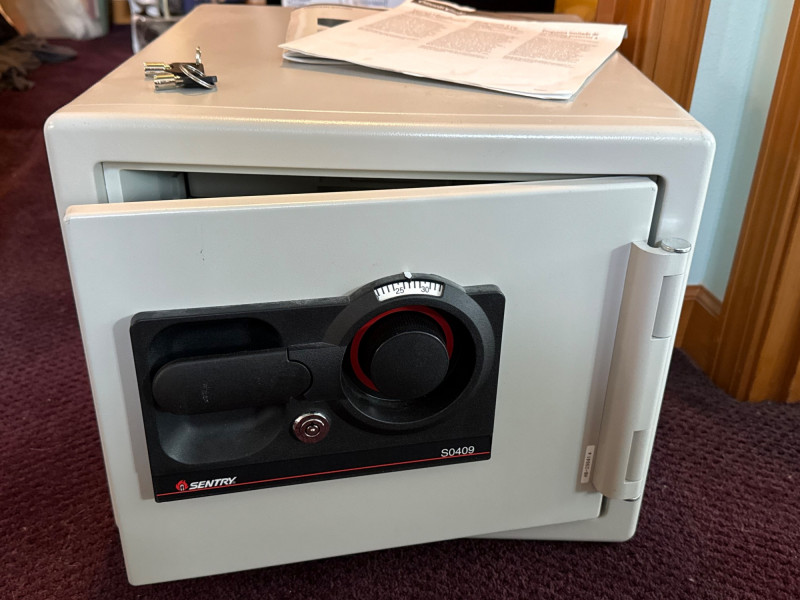 Secure your valuables with this SentrySafe S0409 Fireproof Combination Safe, designed to protect important documents, jewelry, and small electronics from fire and theft. Features: Model: S0409 Lock Type: Combination dial with key lock for dual security Includes: Original keys, paperwork, and limited lifetime after-fire replacement documentation Interior: Spacious compartment with two pull-out drawers for organized storage Construction: Heavy-duty steel body with reinforced door and concealed hinges Approximate Size: Mid-size personal safe (see photos for scale)