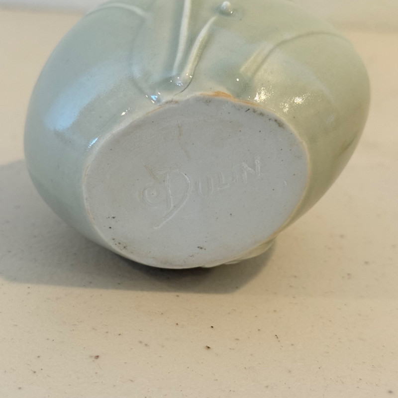 Handcrafted porcelain bottle by Carolyn Dulin, recognized for her serene celadon glazes and elegant organic motifs. This rounded vessel is decorated with raised, flowing vine-like reliefs accented by small bead details, giving the surface a soft, tactile rhythm. The glaze is a gentle pale green with a glossy, translucent finish typical of Dulin’s refined studio porcelain. The bottle includes its original porcelain stopper with cork fitting. While its exact intended use is uncertain—it may have been designed as a decorative vessel, oil bottle, or small sculptural accent—it demonstrates Dulin’s signature craftsmanship and minimalist aesthetic. Signature: Impressed Dulin mark on underside. Artist Note: Carolyn Dulin is known for her contemporary porcelain work featuring fluid, nature-inspired forms and subtle celadon finishes. Each piece reflects her focus on balance, texture, and simplicity.
