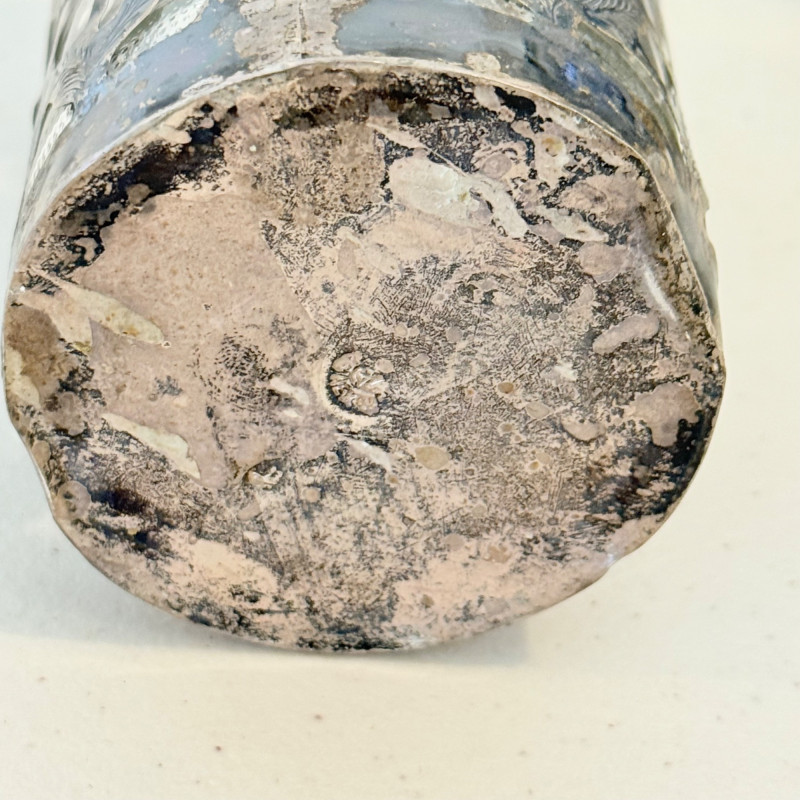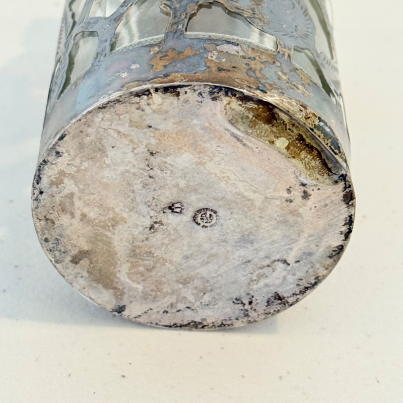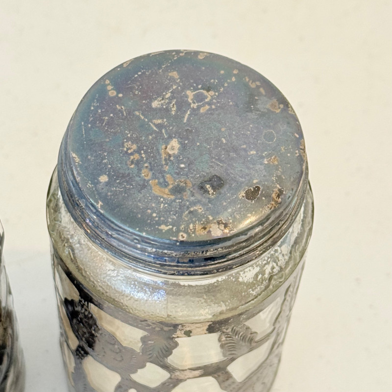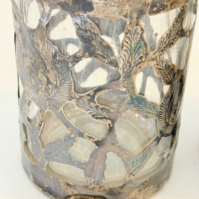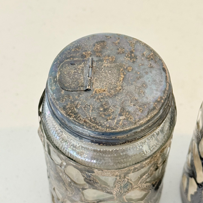 Pair of vintage Mexican glass jars with ornate sterling silver (.925) overlay, featuring a floral and leaf motif by silversmith EL, circa 1940s–1950s. Each clear glass jar is encased in detailed silver openwork and fitted with threaded metal lids. Collecting Note: Comparable examples are listed as “Vintage Glass Nestle Jar Mexico 925 Sterling Silver Floral Overlay,” confirming authenticity and maker lineage.
