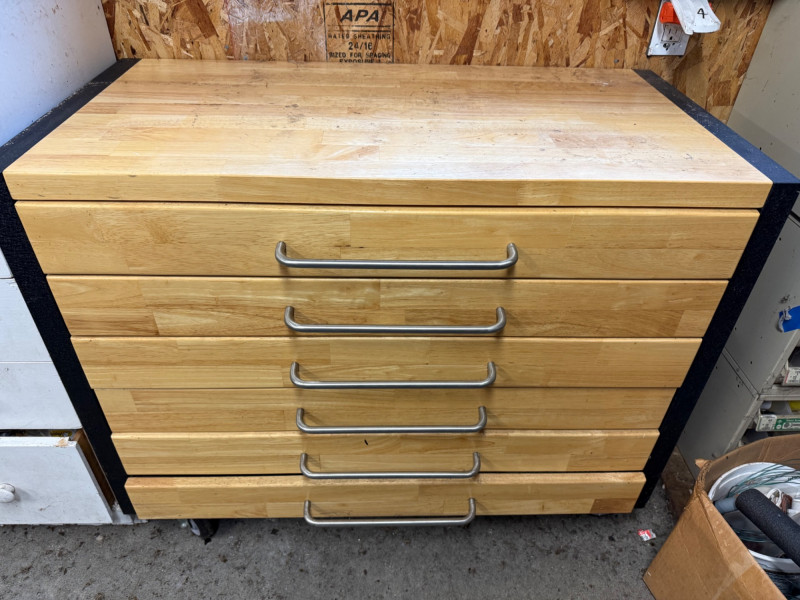 Heavy-duty Whalen workshop rolling tool chest, featuring six full-width drawers, a solid butcher-block wood top, and sturdy steel side panels with brushed metal handles. This professional-grade toolbox combines style and strength, ideal for organizing tools in a garage or workshop. Each drawer is neatly arranged with a wide variety of hand tools and accessories, including: Drawer 1: Paint and finishing tools — brushes, spreaders, trowels, hose, and accessories. Drawer 2: Assorted Stanley and other brand hand saws, miter saw, utility knives, and safety goggles. Drawer 3: Hardware and large fasteners, including clamps, bolts, hooks, and pry bars. Drawer 4: Drill bits, driver sets, and accessories — includes Irwin, General, and assorted specialty sets. Drawer 5: Electronics repair tools — Sony-labeled box with soldering irons and solder, plus connectors and cases. Maker: Whalen Furniture