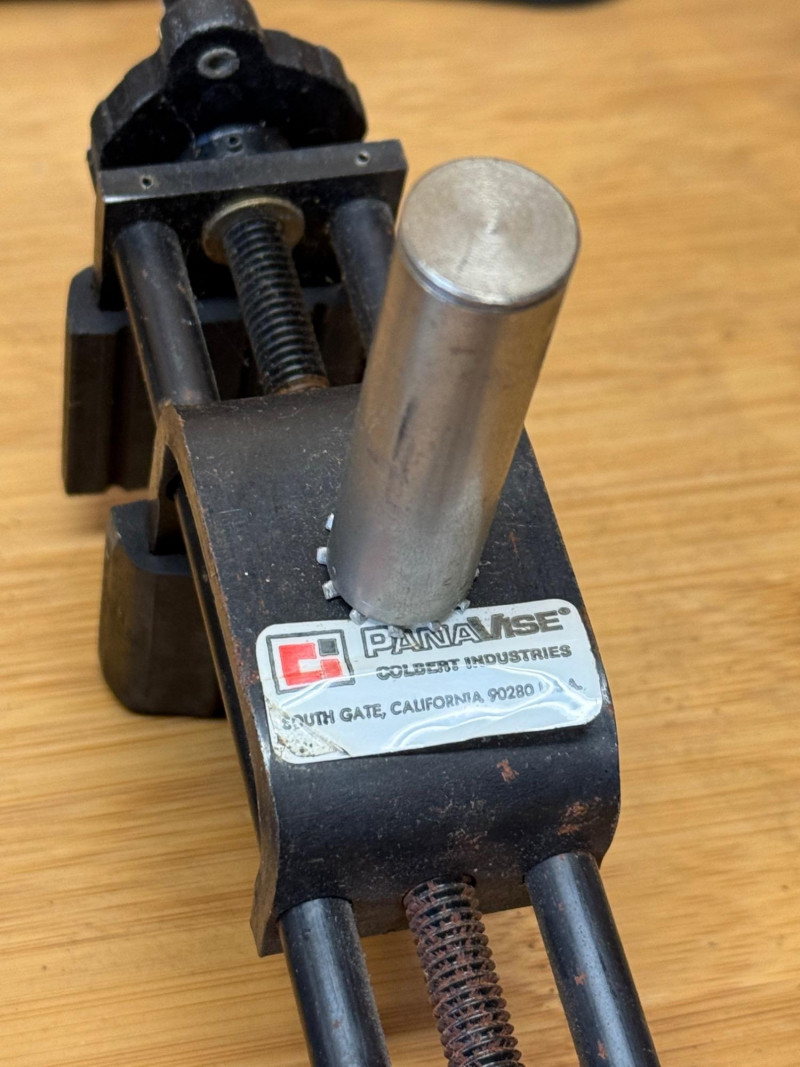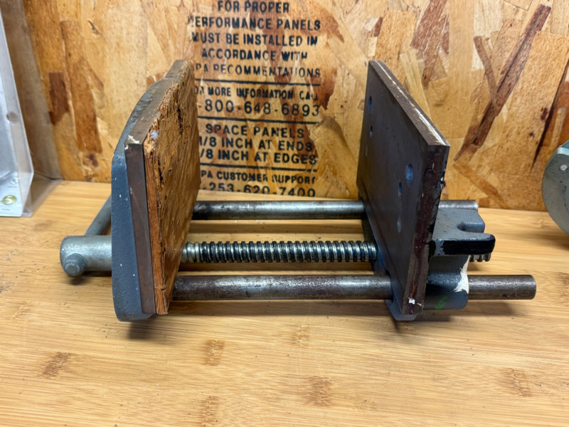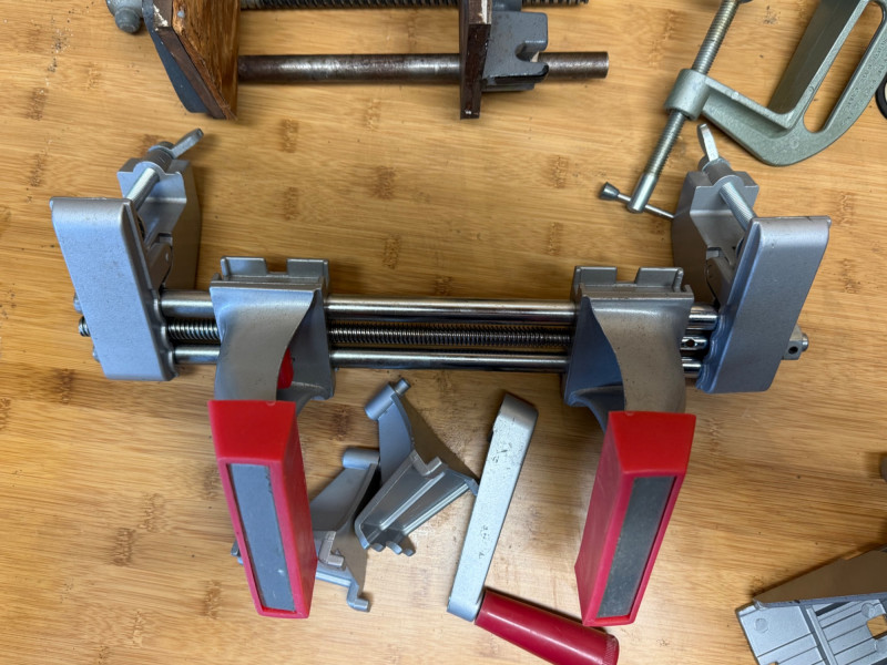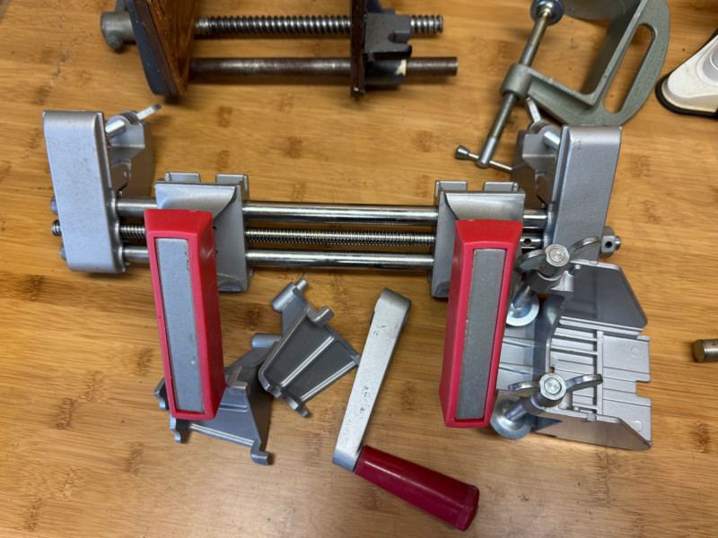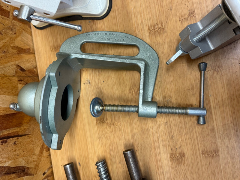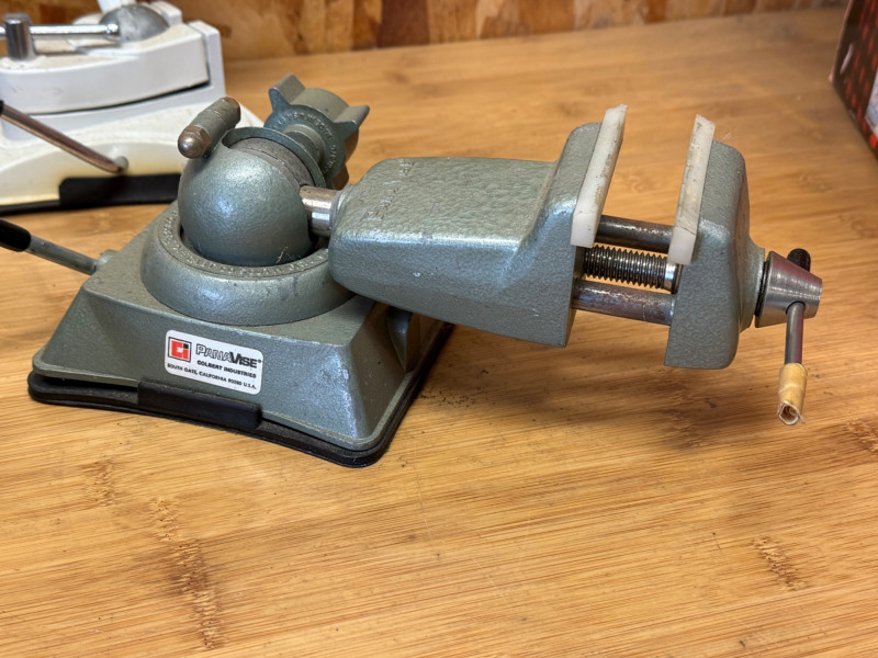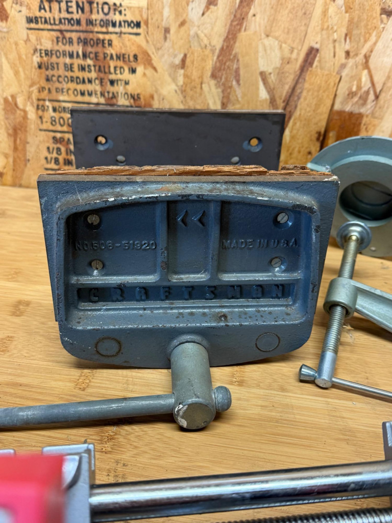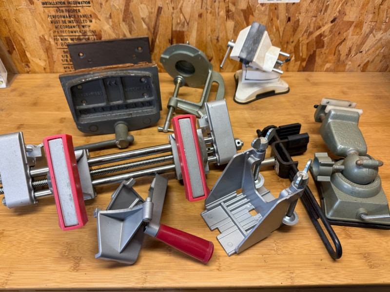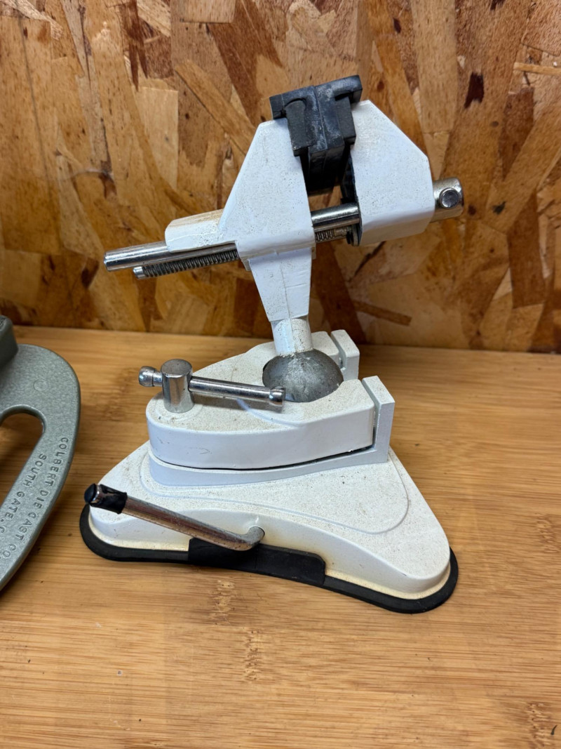 A versatile group of precision vises and clamping tools ideal for woodworking, metalworking, or hobbyist applications. The lot includes: PanaVise Multi-Angle Bench Vise – Heavy-duty cast aluminum base with full swivel and tilt capability. Features non-marring nylon jaws and adjustable positioning ball joint for delicate electronic or model work. PanaVise Mounting Clamp – Matching clamp mount marked Colbert Die Cast Co., South Gate, Calif., designed to secure the vise to a benchtop. Craftsman Woodworker’s Vise – Classic U.S.-made cast iron bench vise (Model No. 506-51820) with wooden jaw pads, smooth screw operation, and under-bench mount design. Precision Dual Bar Corner Clamp – Adjustable aluminum assembly clamp with dual screw shafts and red soft-grip jaws; ideal for gluing and squaring frames or boxes. Mitre and Corner Angle Clamps – Two adjustable aluminum angle brackets for holding mitered or perpendicular joints during assembly. Tilting Swivel Vise – White, ball-joint style vise with suction base, ideal for light bench or electronics work.