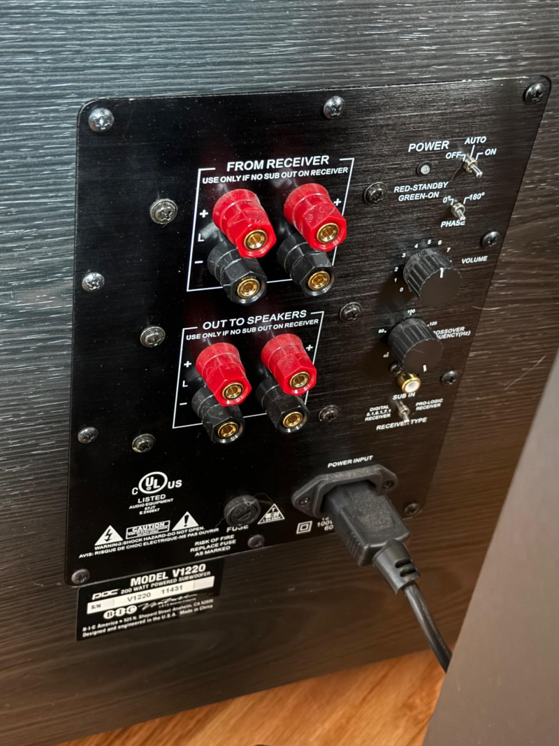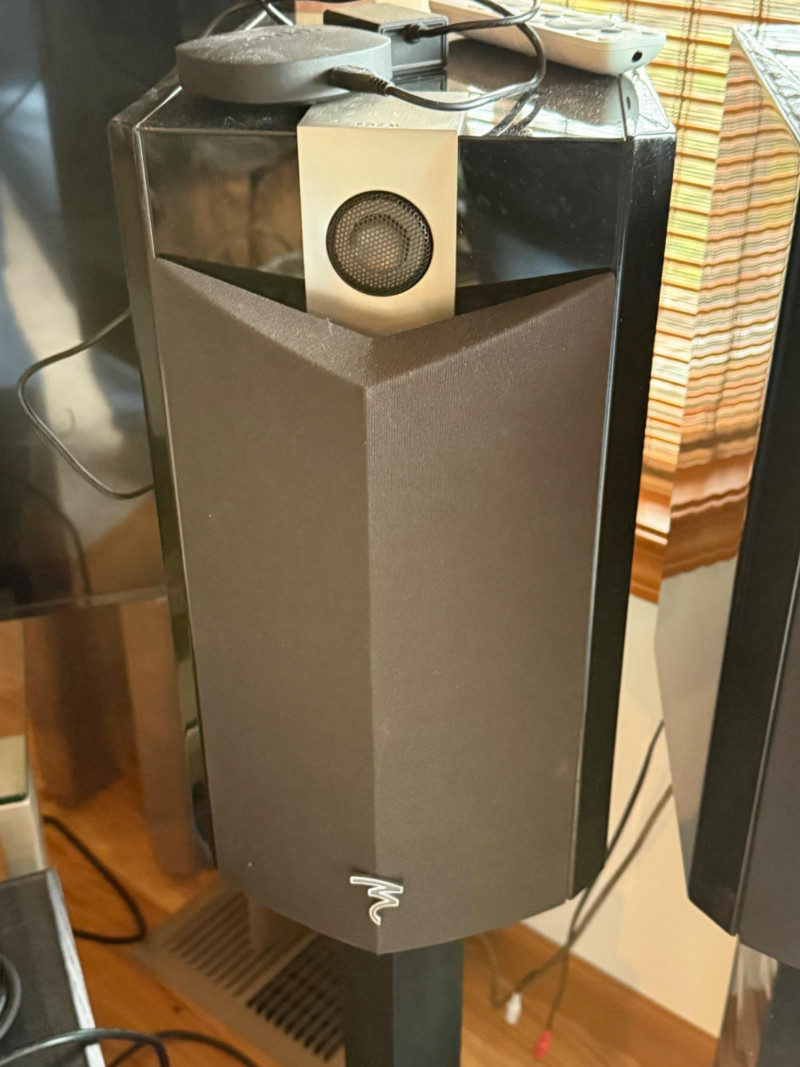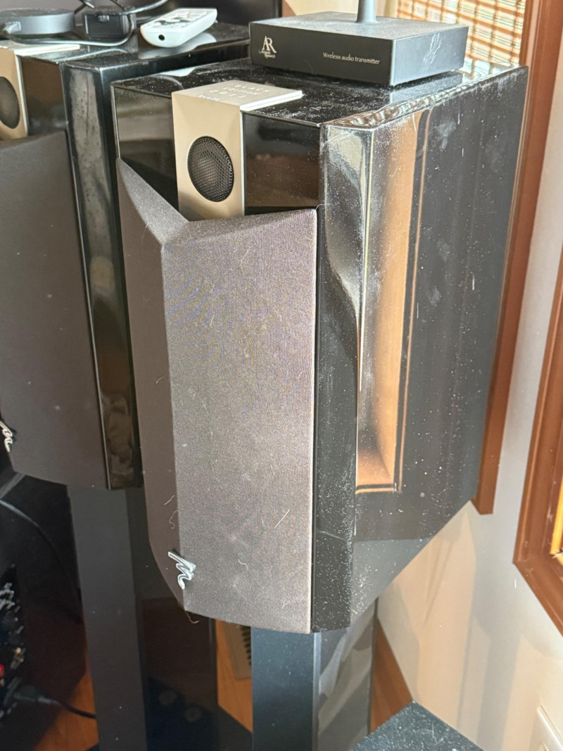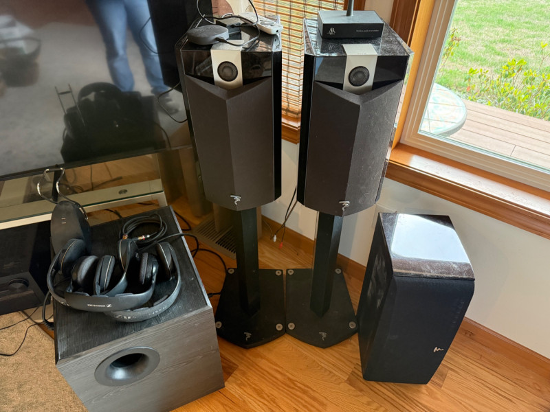 Includes: Pair of Focal Black Edition bookshelf speakers Focal Chorus center channel speaker BIC America V1220 powered subwoofer (200W RMS, 12” driver) Onkyo TX-NR818 7.2-Channel THX Select2 Plus AV Receiver with remote Sennheiser RS wireless headphones AR wireless audio transmitter ONN streaming box with power adapter and remote Premium home theater audio system featuring Focal’s limited-edition 2011 Black Edition speakers, known for their refined clarity and precision. The set includes dual bookshelf speakers on stands, a matching center channel, and a BIC V1220 powered subwoofer for deep, dynamic bass. Also included are Sennheiser RS wireless headphones, a wireless audio transmitter, and an ONN streaming media box for smart TV connectivity. Tall Speakers (each): 40” H × 8.5” W × 11” D