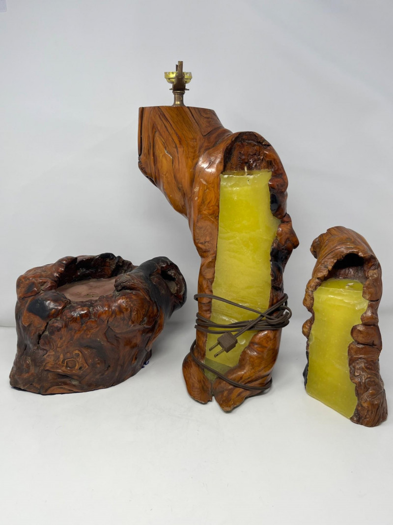 Lot # 15 - Hand‑Carved Wood Lamp & Matching Candle Holders– Integrated Candle Starting Bid: $ 5.00 Bids: Bidding starts in: |