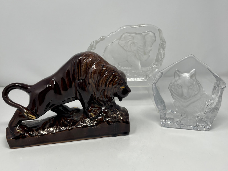 Lot # 14 - Wildlife Statues – Ceramic Lion and Glass Wolf and Elephant Starting Bid: $ 5.00 Bids: Bidding starts in: |