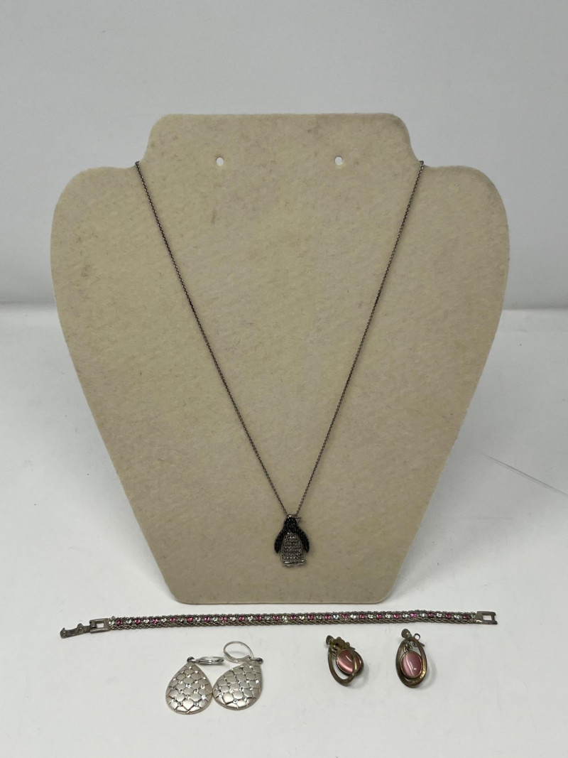 Lot # 84 - Mixed Jewelry Lot – Sterling Penguin Pendant, Earrings & Bracelet Starting Bid: $ 5.00 Bids: Bidding starts in: |