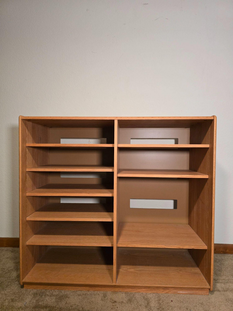 Lot # 59 - Custom Woodwork & Design Warm Oak Multi‑Shelf Cabinet Starting Bid: $ 5.00 Bids: Bidding starts in: |