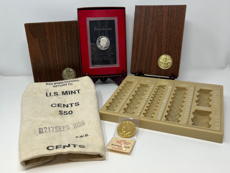 Lot # 48 - Vintage Coin Counter Tray, U.S. Mint Bag & Eisenhower Coins Starting Bid: $ 5.00 Bids: Bidding starts in: |