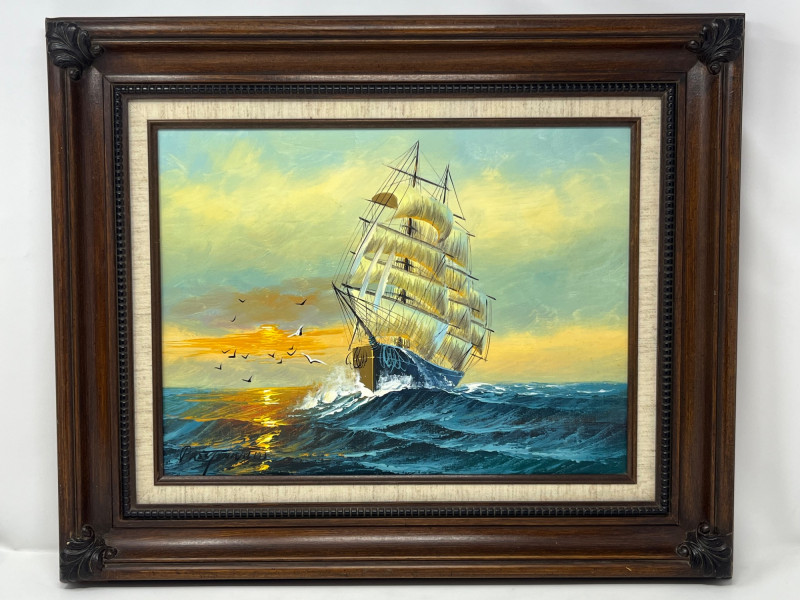 Lot # 18 - Preston Willis Signed Nautical Oil Painting– Framed Tall Ship Scene Starting Bid: $ 5.00 Bids: Bidding starts in: |