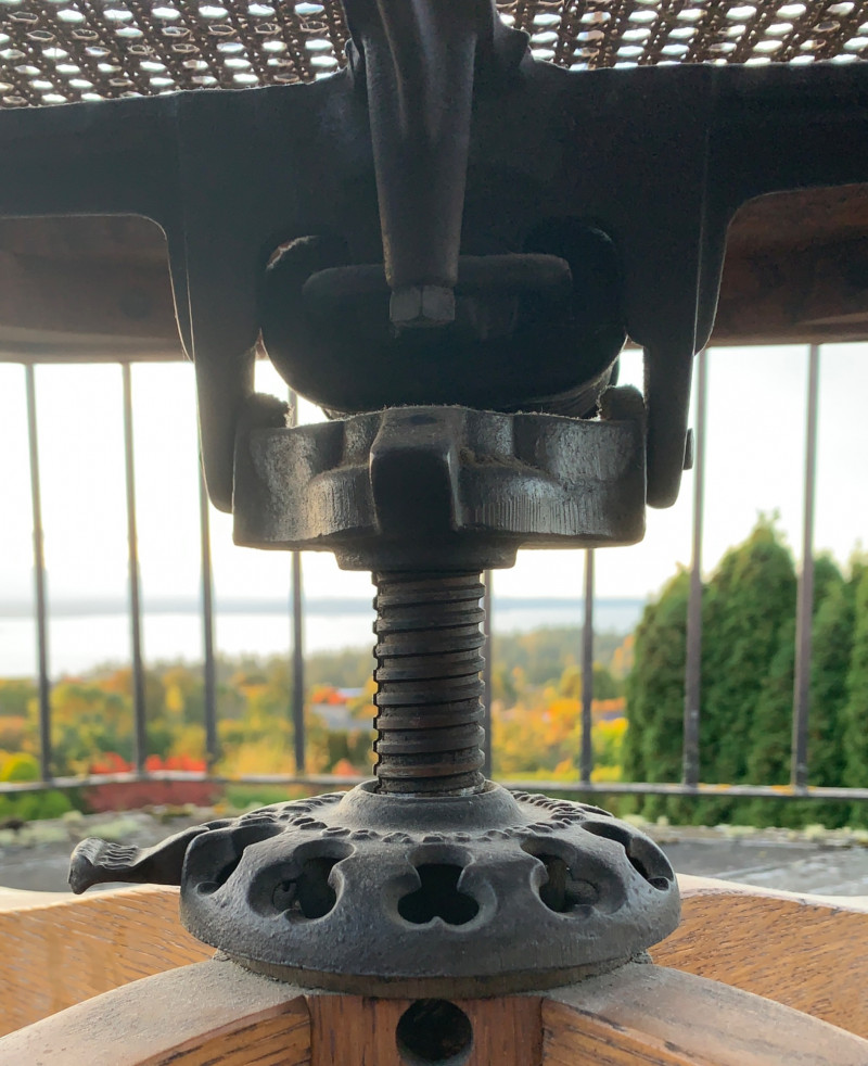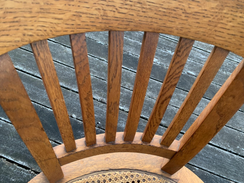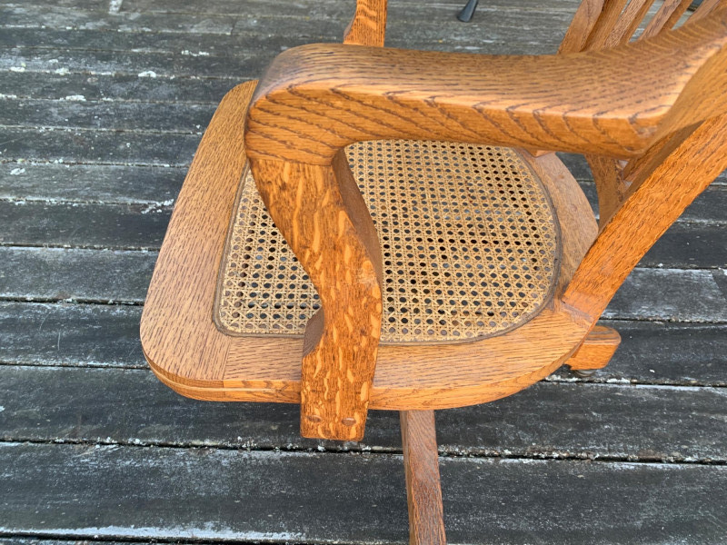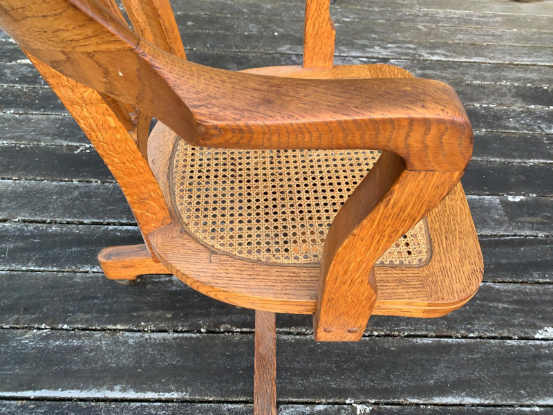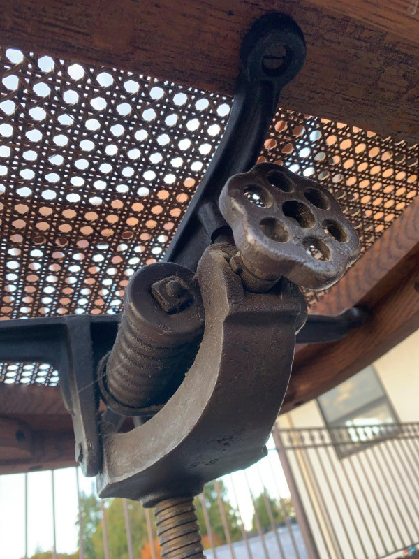 This chair is in excellent condition. The oak wood shows its natural grain beautifully, and the cane seat is in pristine shape. The cast iron base and all its mechanisms are in perfect working order. Please refer to all photos for a complete view of the chair's quality and craftsmanship.