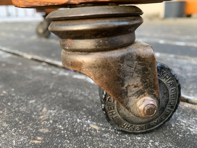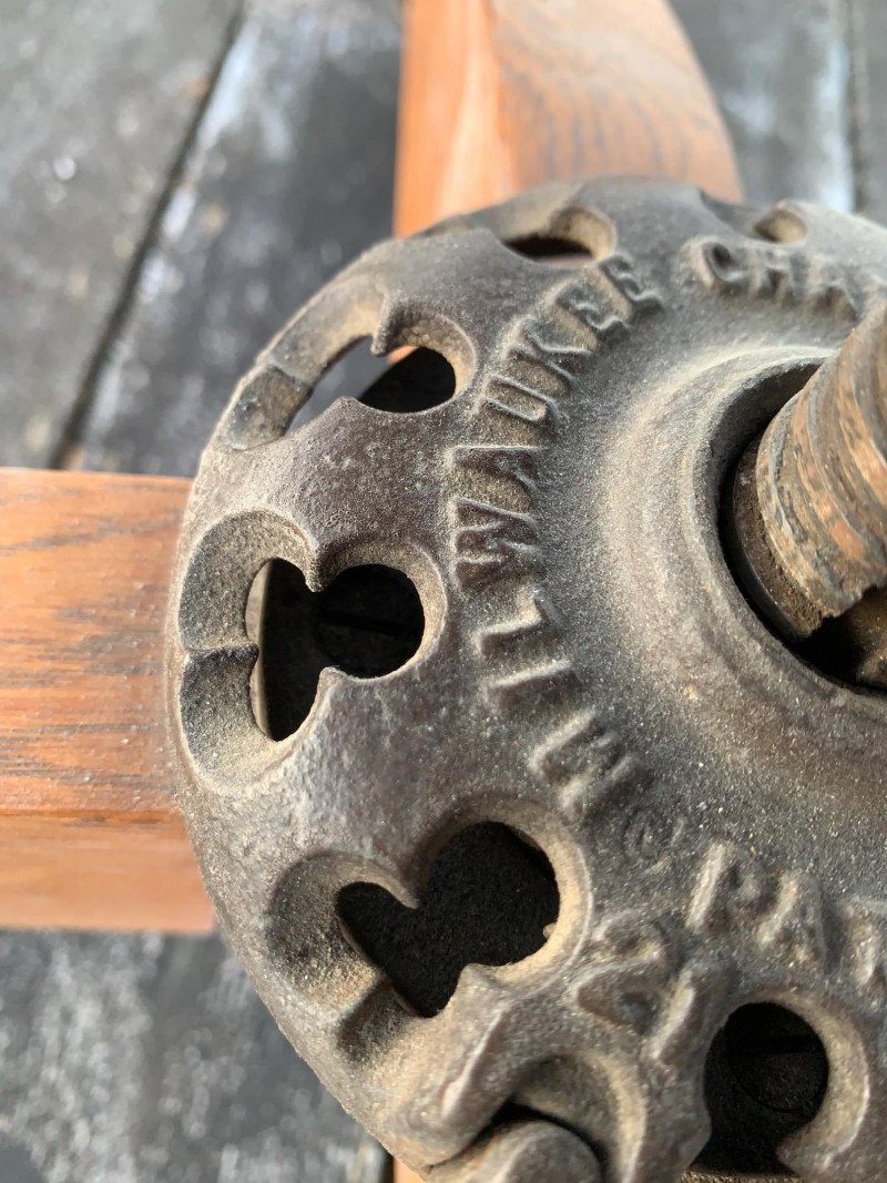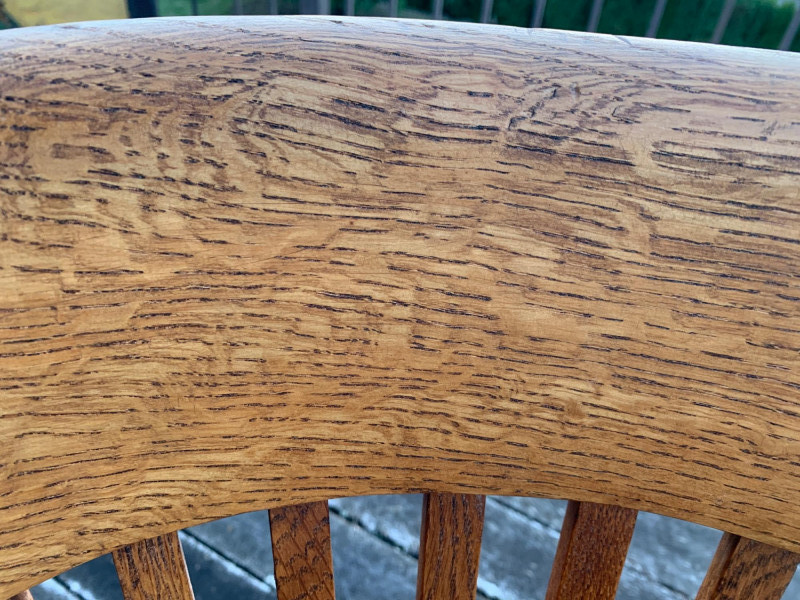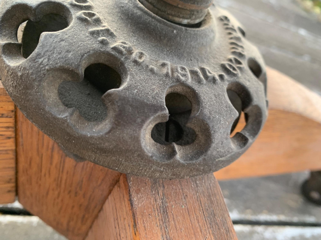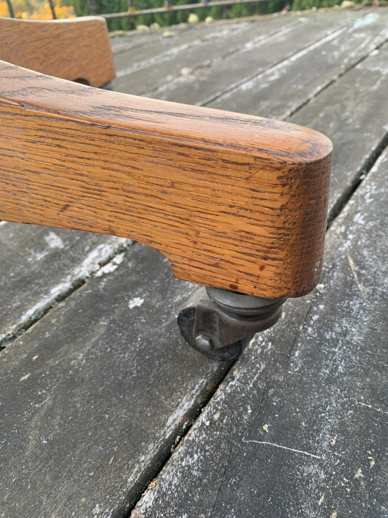This chair is in excellent condition. The oak wood shows its natural grain beautifully, and the cane seat is in pristine shape. The cast iron base and all its mechanisms are in perfect working order. Please refer to all photos for a complete view of the chair's quality and craftsmanship.