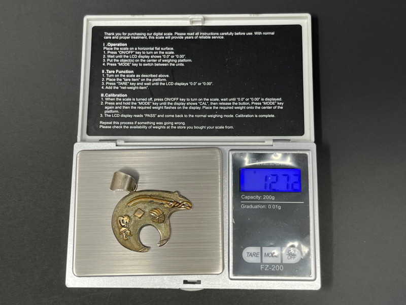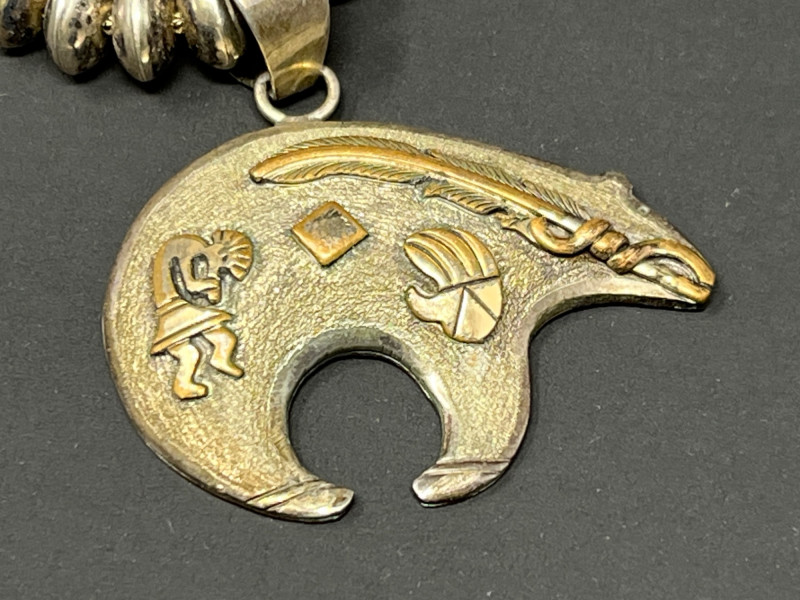 A striking blend of tradition and symbolism, this handcrafted necklace features classic Navajo-style sterling silver beads paired with a bold bear-shaped pendant in warm brass tones. Engraved with geometric motifs and a central cut-out, the pendant evokes strength and protection—hallmarks of Native American bear iconography. A wearable piece of cultural artistry. Origin: Likely Navajo, Southwestern United States Materials: Sterling silver beads (“Navajo pearls”) and bear charm, brass or gold-tone bear pendant details Design Features: Engraved symbolic motifs, circular cut-out (possibly representing the heartline) Era: Mid-to-late 20th century Clasp: Traditional hook closure Symbolism: Bear represents strength, introspection, and spiritual guidance in Native traditions Condition: Excellent vintage condition; artisan-made Summary