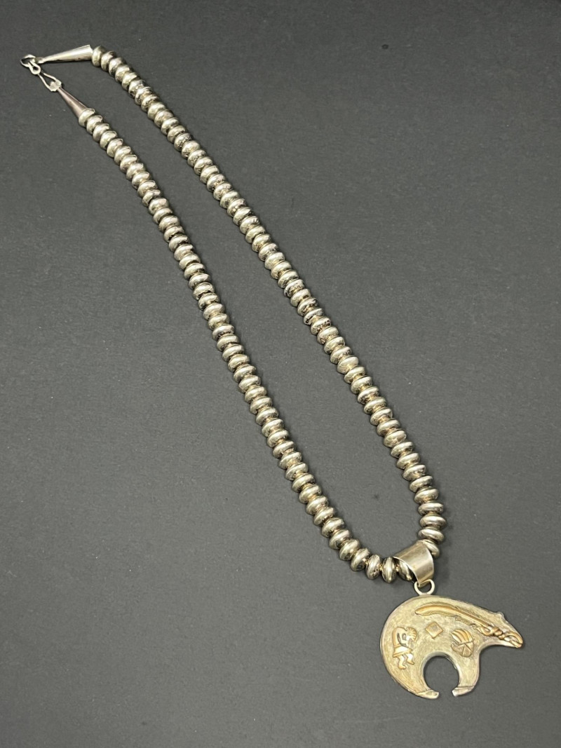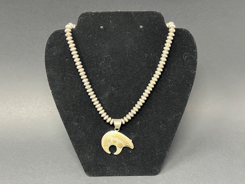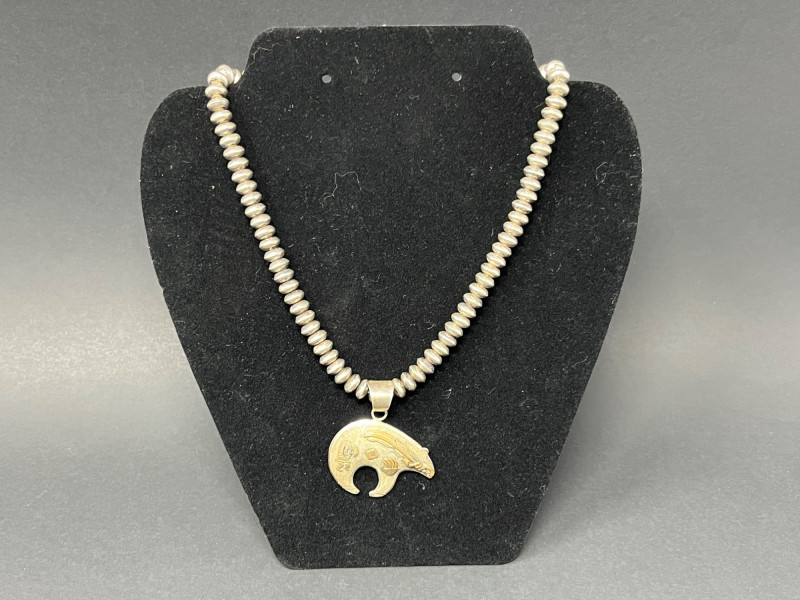 Lot # 14 - Navajo Sterling Silver Beaded Necklace with Bear Pendant