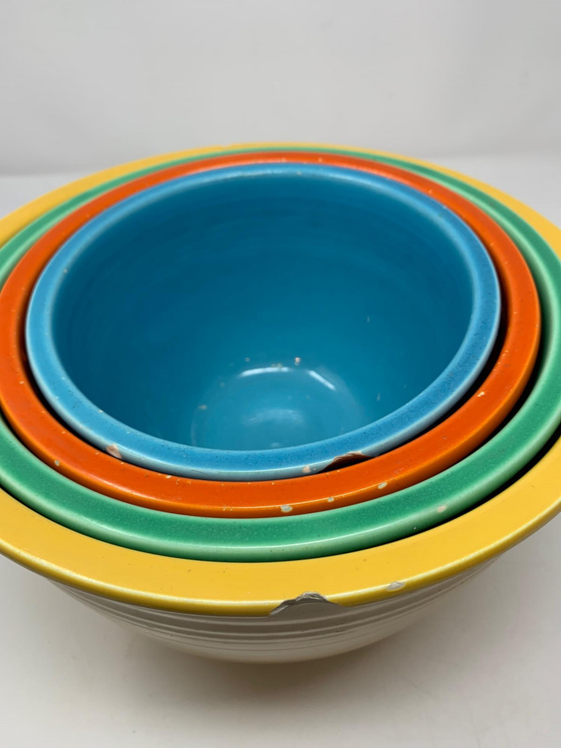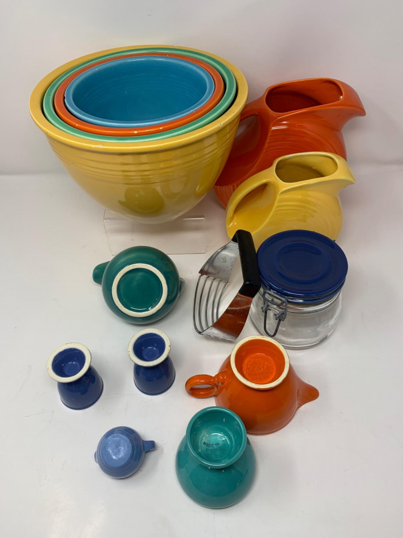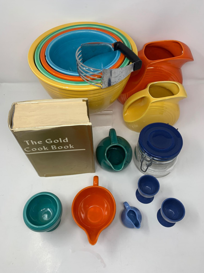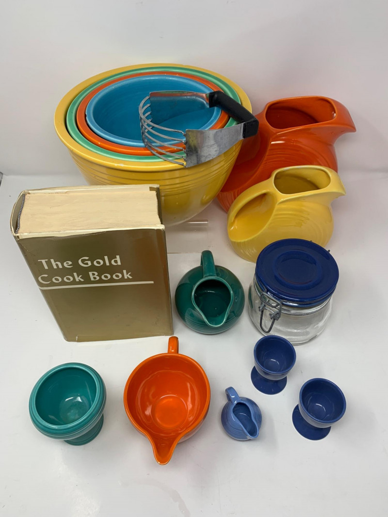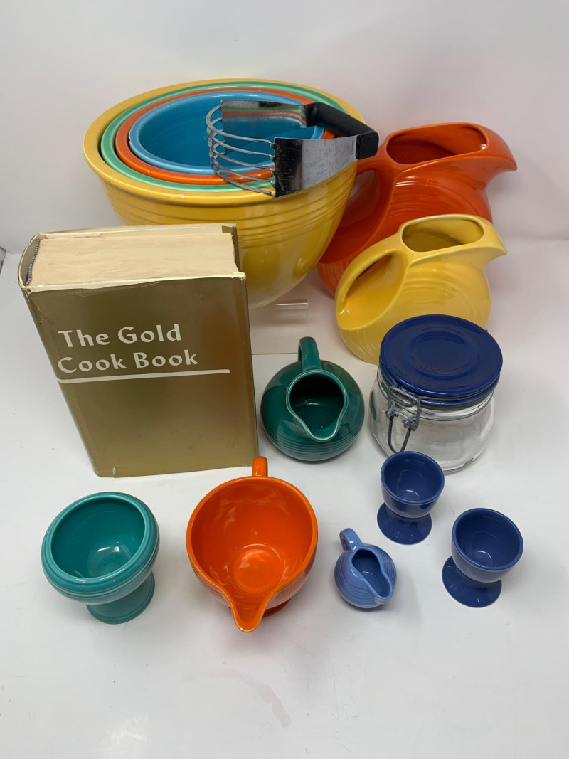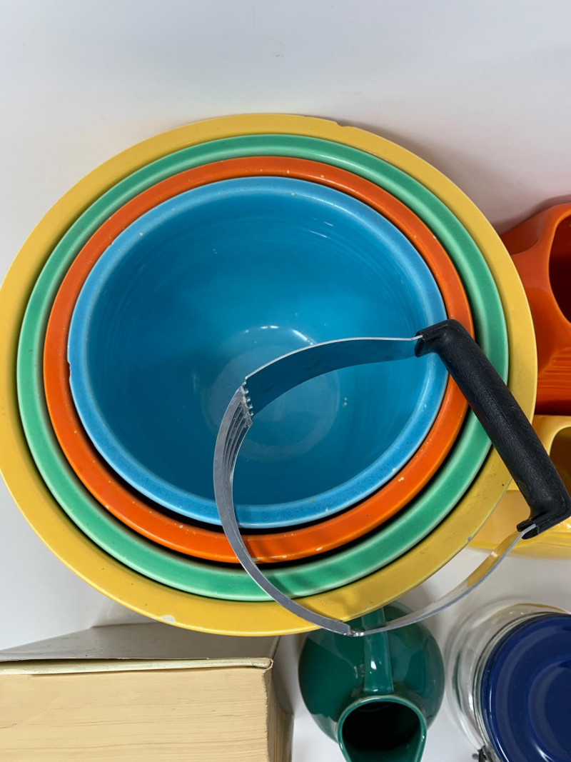 A jubilant spread of mid-century kitchenware in a rainbow of saturated hues—perfect for collectors, decorators, or anyone craving a retro pop in their culinary space. This curated lot includes: Metal pastry blender with black handle