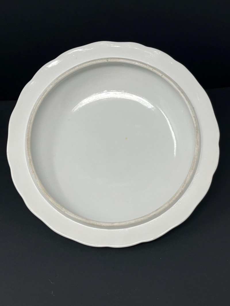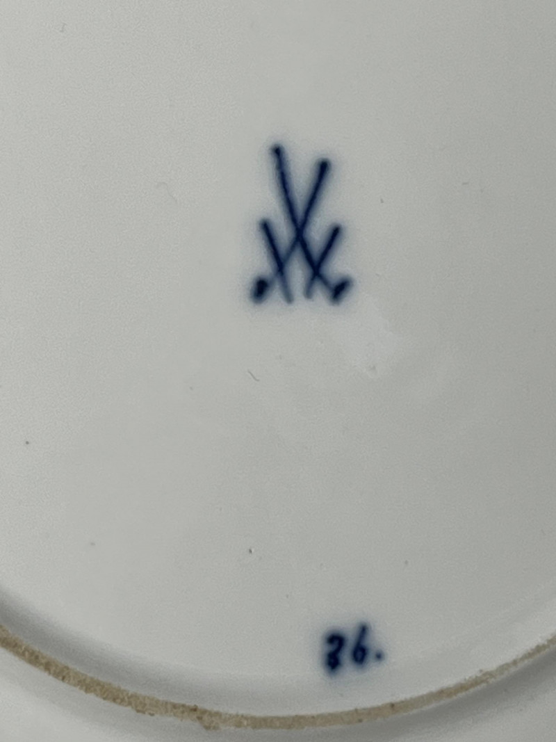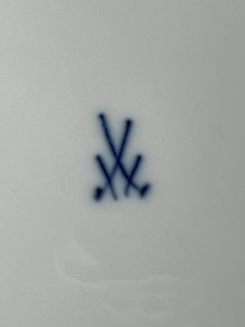 A stately early 1900's Meissen porcelain covered tureen in the iconic Blue Onion pattern, featuring sculpted side handles and a curled leaf finial atop the lid. Hand-painted in cobalt blue on crisp white porcelain, the floral and botanical motifs reflect Meissen’s 18th-century design legacy. The scalloped rim and ornate handlework add Rococo flair, making this piece ideal for formal dining, display, or collection. Fine German porcelain Hand-painted cobalt blue “Blue Onion” pattern Sculpted foliage-style handles and curled leaf finial Covered form with fitted lid Because the swords are featured in the design pattern it would date its manufacture from 1900 to early 1930'sDescription