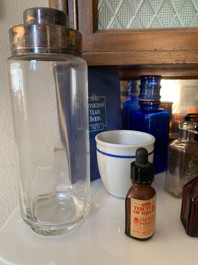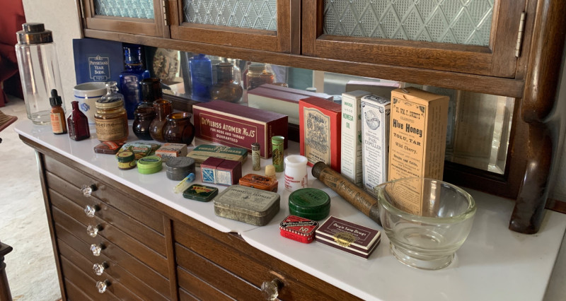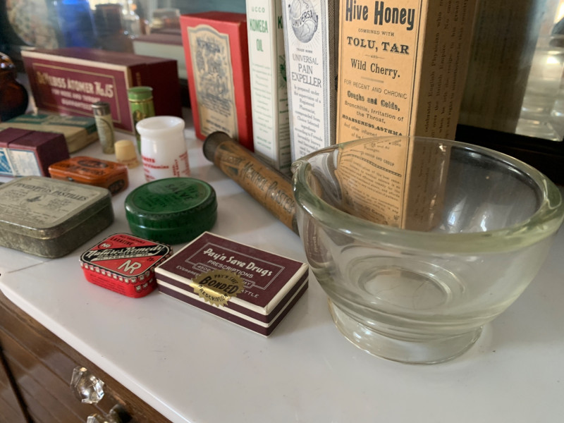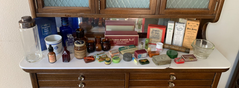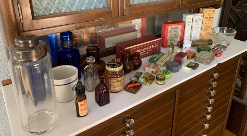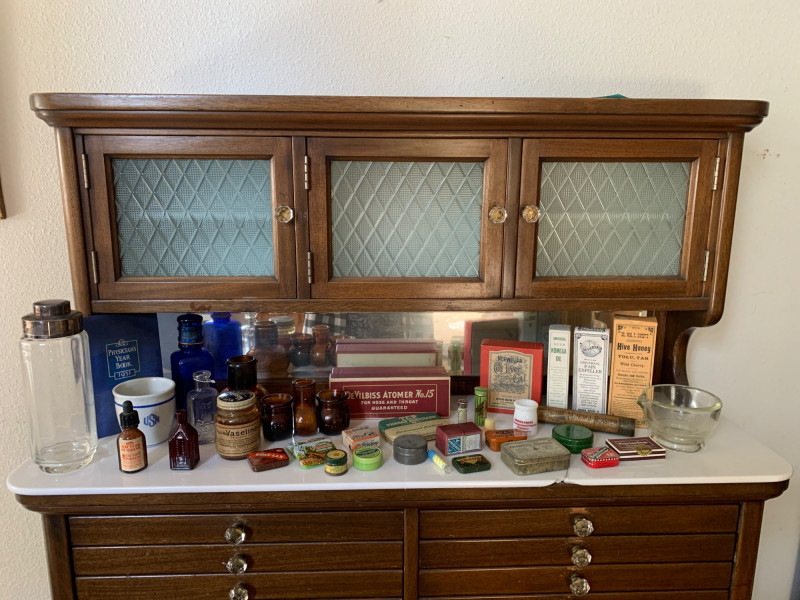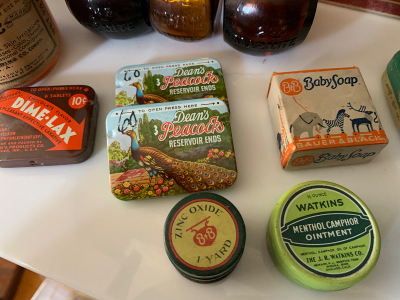 A sprawling tabletop collection of vintage apothecary bottles, pill tins, and pharmaceutical packaging from the estate of a former physician. This lot includes dozens of empty containers—brown and clear glass bottles, embossed jars, branded tins, and promotional pamphlets—offering a rich visual narrative of 20th-century American medicine. All items are loose and displayed without a cabinet, ideal for collectors, decorators, or educators seeking authentic medical ephemera. Glass Bottles: (5) Brown apothecary bottles (various sizes, some embossed or labeled) (2) Clear glass bottles and jars, including one large specimen jar with metal lid (2) Blue glass bottles Tins & Boxes: “Vicks VapoRub” green tin “Mothers Atone M.S.” red box Assorted pill boxes, salve tins, and ointment containers Printed Ephemera: “Blue Honey” promotional pamphlet Miscellaneous remedy advertisements and instruction sheets Tools & Accessories: Small ceramic bowl Measuring spoons and mixing implementsItem Details