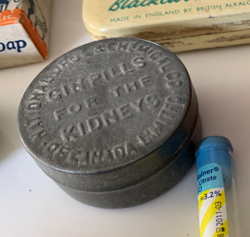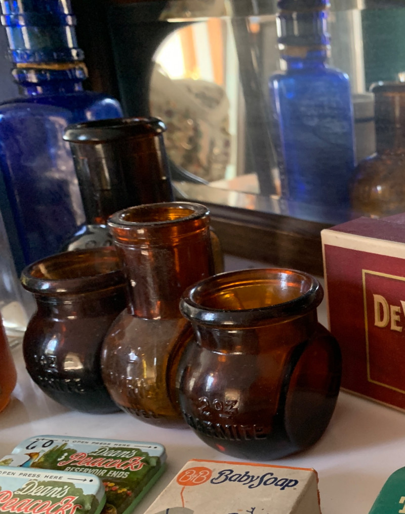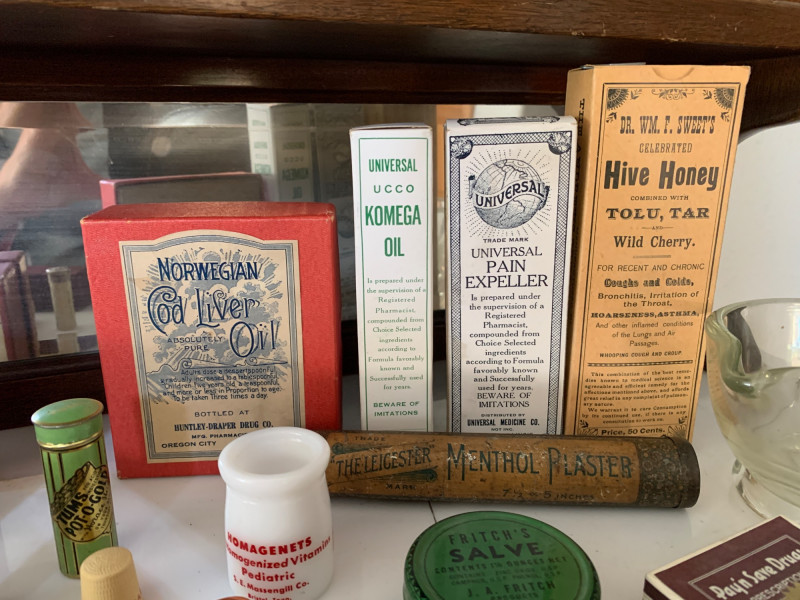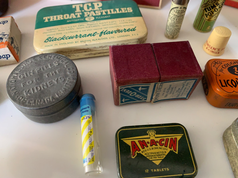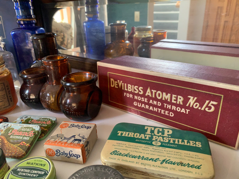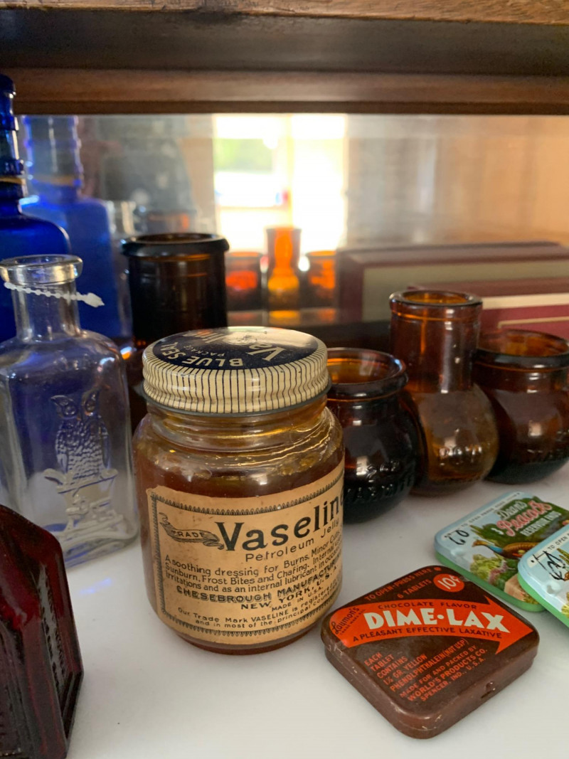 A sprawling tabletop collection of vintage apothecary bottles, pill tins, and pharmaceutical packaging from the estate of a former physician. This lot includes dozens of empty containers—brown and clear glass bottles, embossed jars, branded tins, and promotional pamphlets—offering a rich visual narrative of 20th-century American medicine. All items are loose and displayed without a cabinet, ideal for collectors, decorators, or educators seeking authentic medical ephemera. Glass Bottles: (5) Brown apothecary bottles (various sizes, some embossed or labeled) (2) Clear glass bottles and jars, including one large specimen jar with metal lid (2) Blue glass bottles Tins & Boxes: “Vicks VapoRub” green tin “Mothers Atone M.S.” red box Assorted pill boxes, salve tins, and ointment containers Printed Ephemera: “Blue Honey” promotional pamphlet Miscellaneous remedy advertisements and instruction sheets Tools & Accessories: Small ceramic bowl Measuring spoons and mixing implementsItem Details