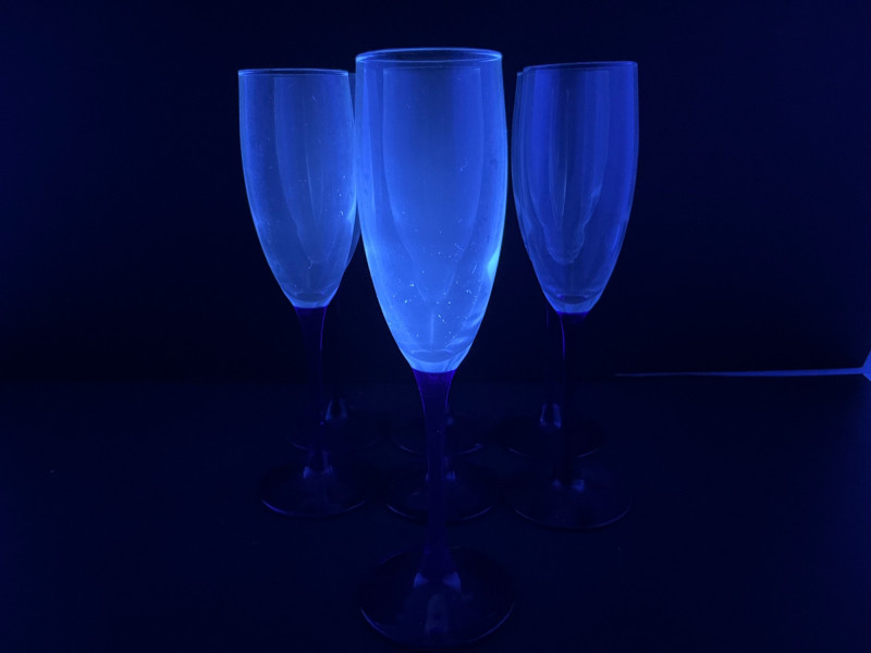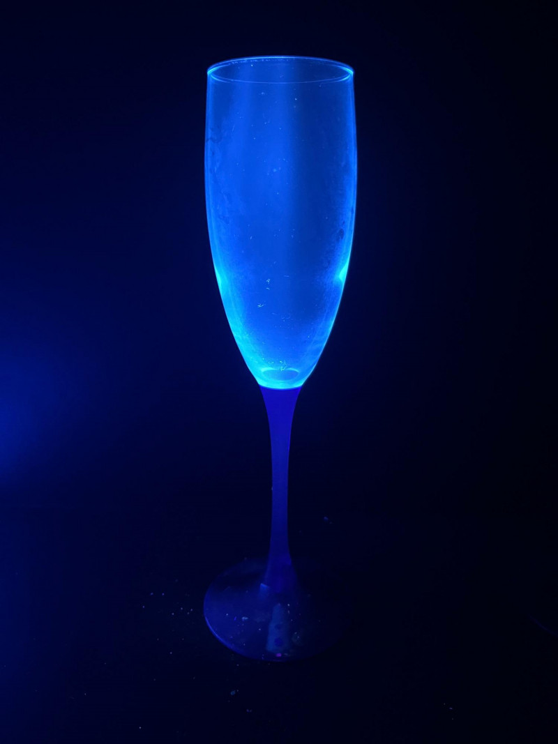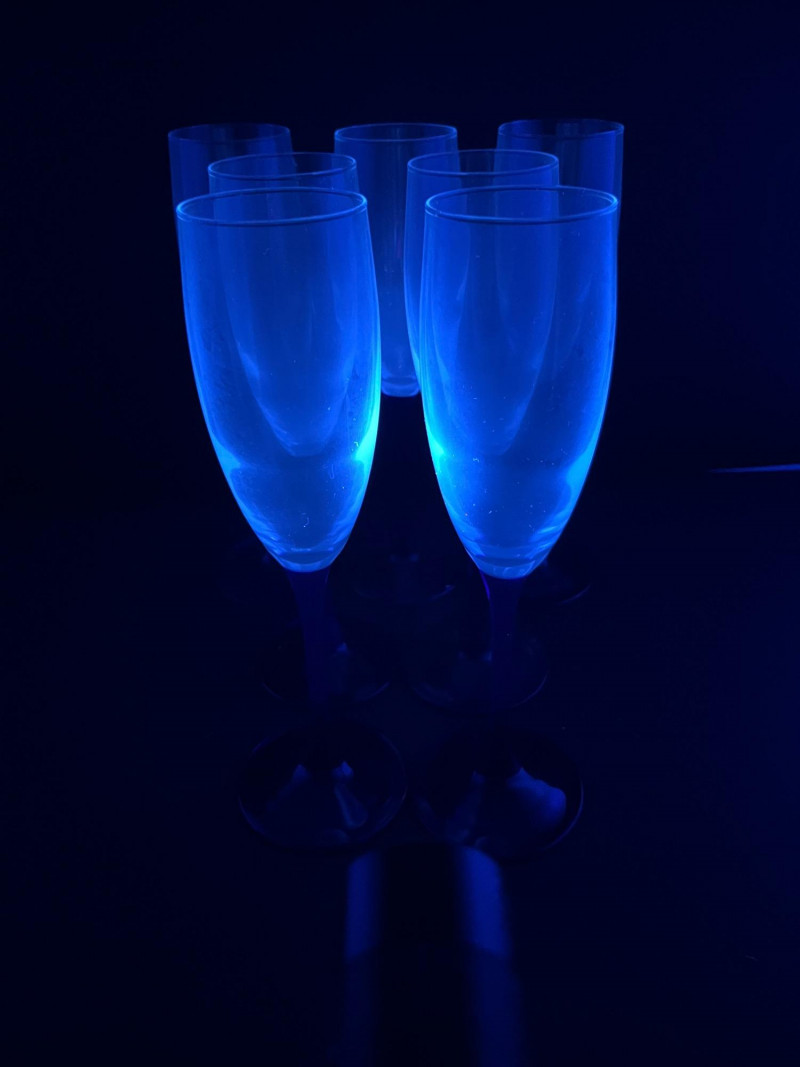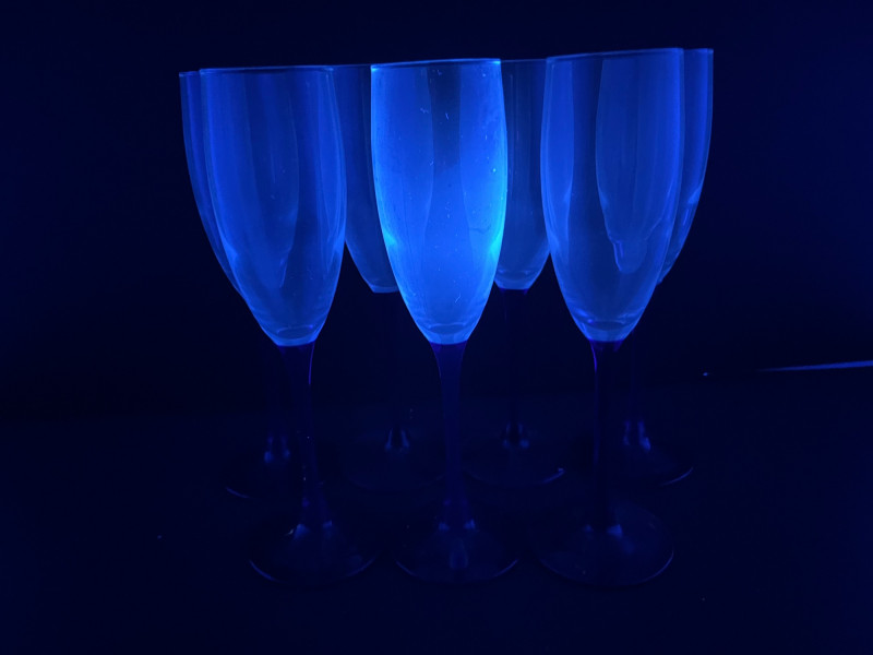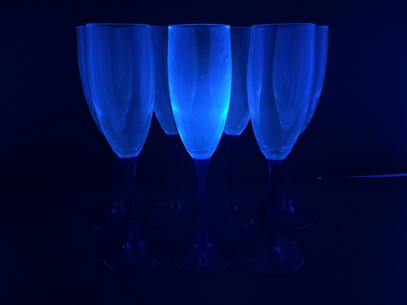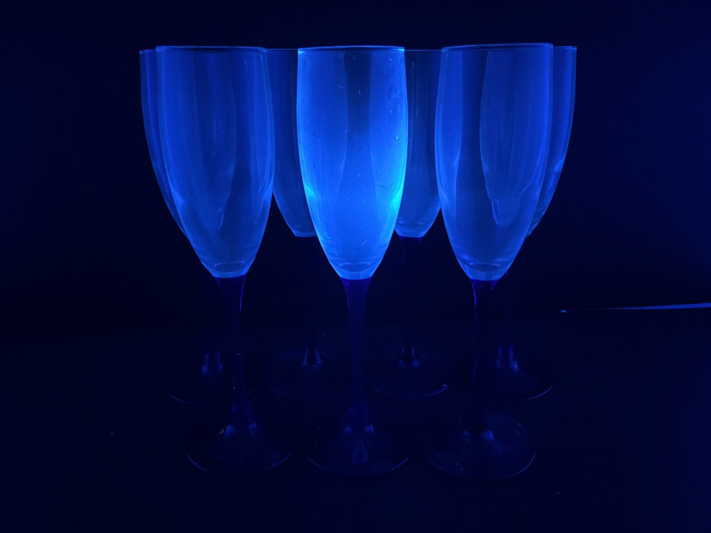 A dramatic set of seven vintage champagne flutes with cobalt stems and manganese-infused bowls that glow under UV light. These elegant glasses combine mid-century flair with scientific intrigue, making them ideal for collectors, stylists, or anyone seeking a touch of atomic-era glamour. Cobalt blue stems anchor the design with rich color and visual weight Manganese glass bowls emit a soft bluish glow under blacklight, a trait prized by collectors of fluorescent glass Sleek silhouettes and balanced proportions make these flutes perfect for display or celebratory use Height: 8 in Bowl Diameter: 3 inDescription
