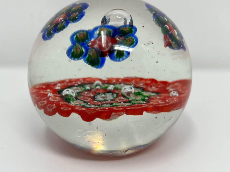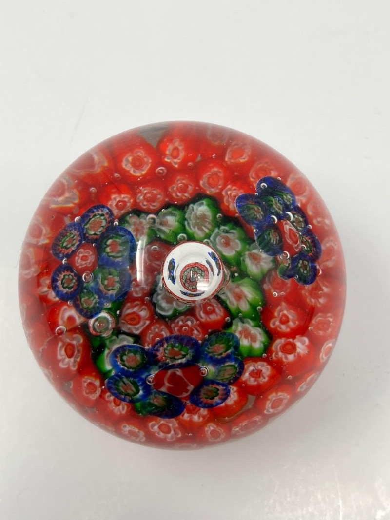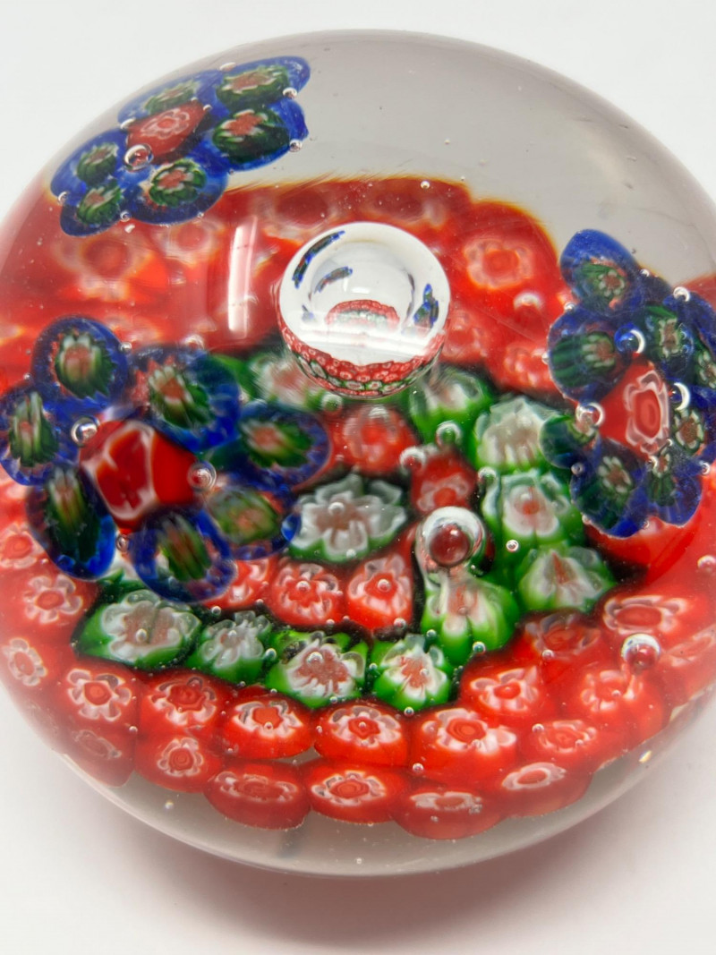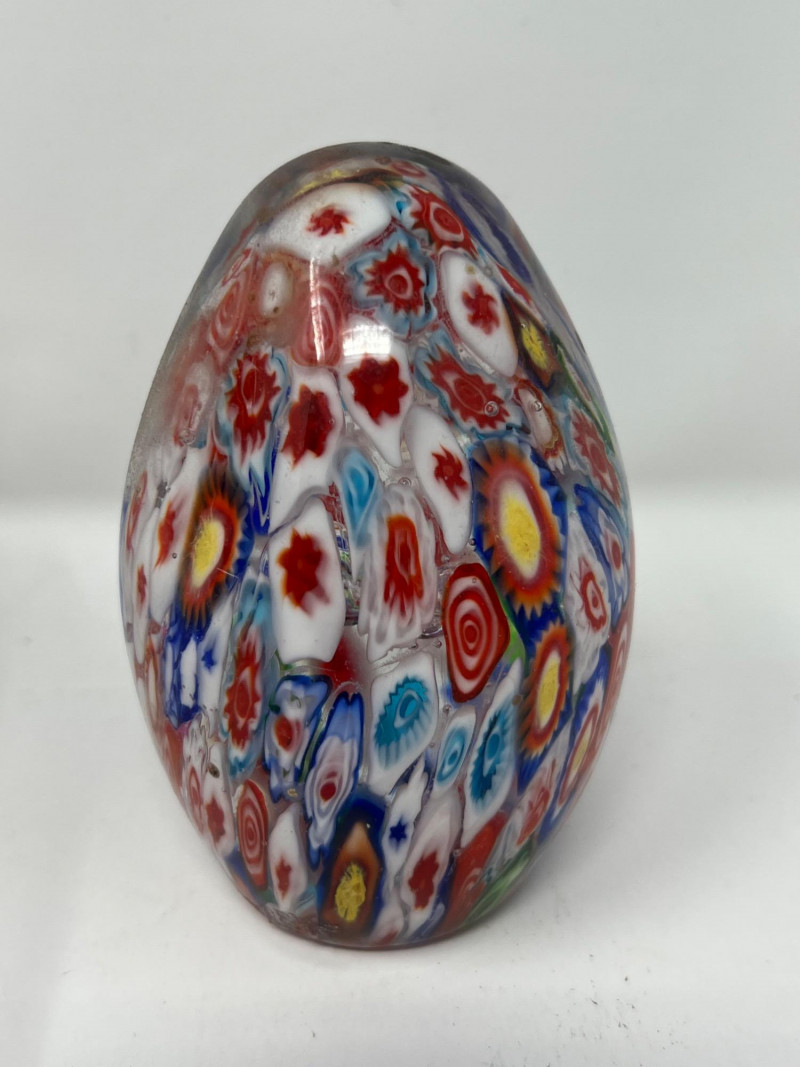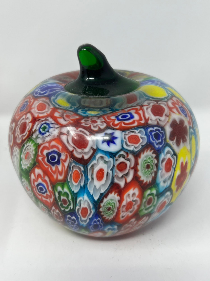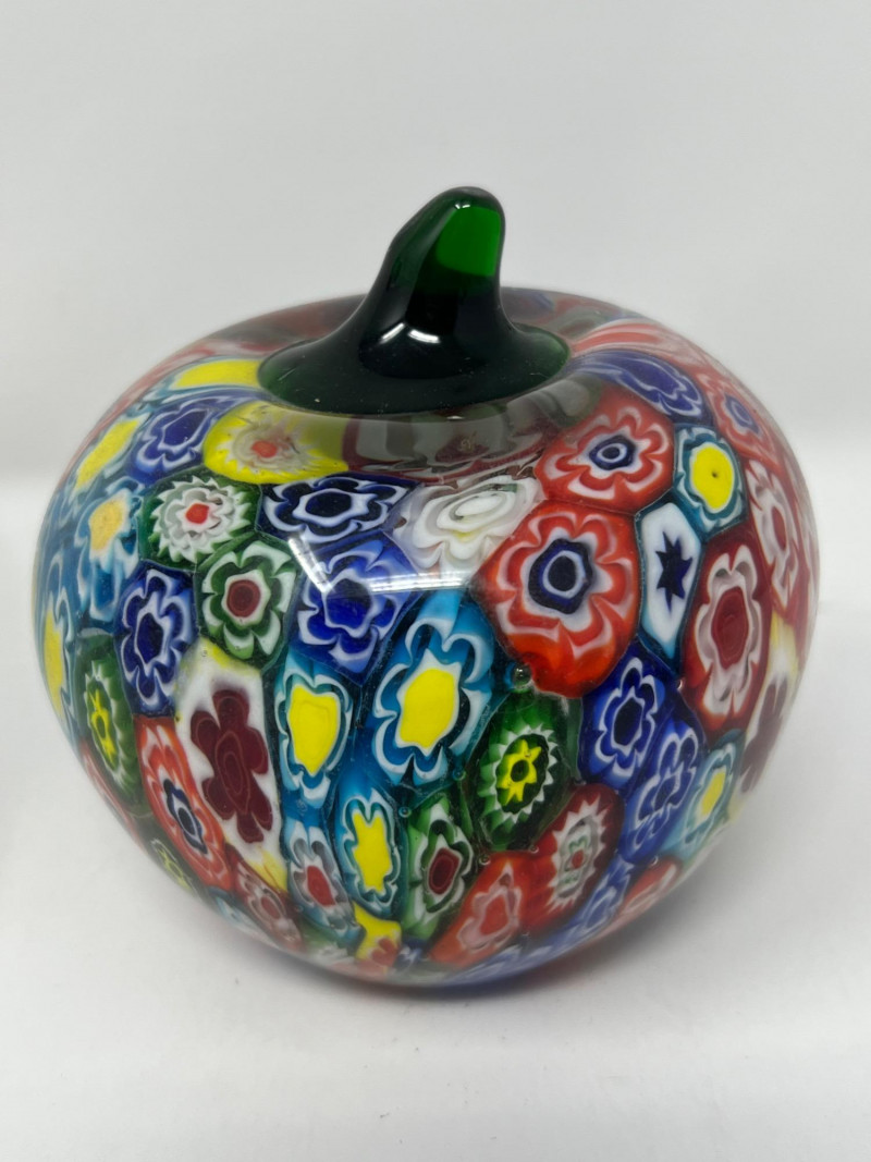 Summary: A vibrant trio of Murano glass millefiori pieces, each showcasing the Venetian mastery of embedded mosaic cane work. Includes an apple sculpture with green stem, a spherical paperweight with red swirl core on a clear stand, and a dense oval millefiori form. These pieces blend playful form with intricate craftsmanship, ideal for collectors of Italian glass or lovers of color-saturated design. Maker: Murano (likely AVEM or V. Nason; label not visible) Material: Handblown glass with millefiori technique Color Palette: Multicolor floral mosaic with red, green, blue, yellow, and white accents Dimensions: Apple: Approx. 4" H × 4" W Paperweight: Approx. 3.5" diameter Oval: Approx. 4" L × 2.5" W Era: Late 20th century to early 2000s Condition: Excellent; no chips or cracks notedItem Details