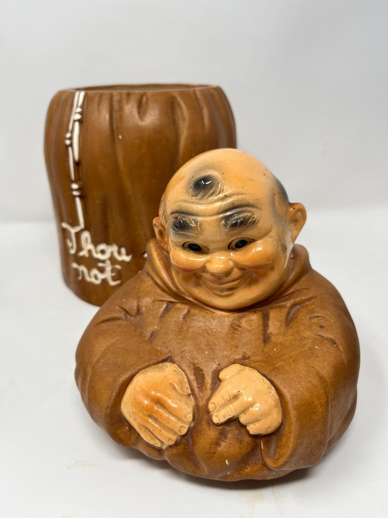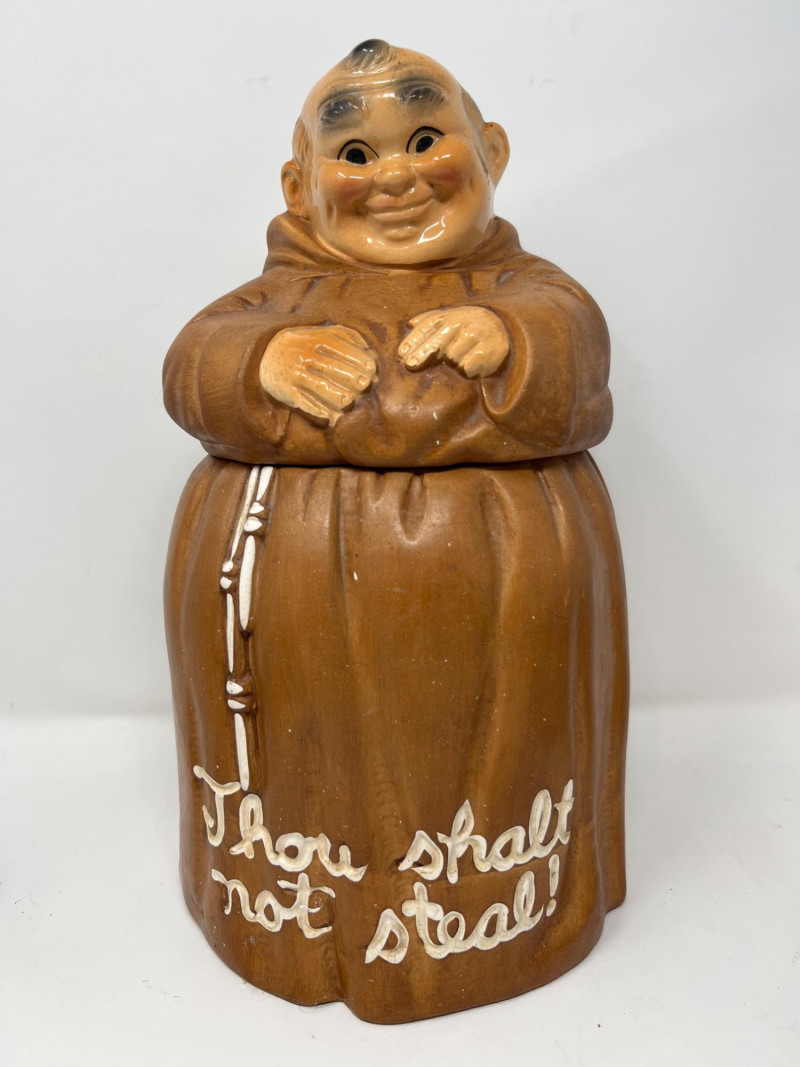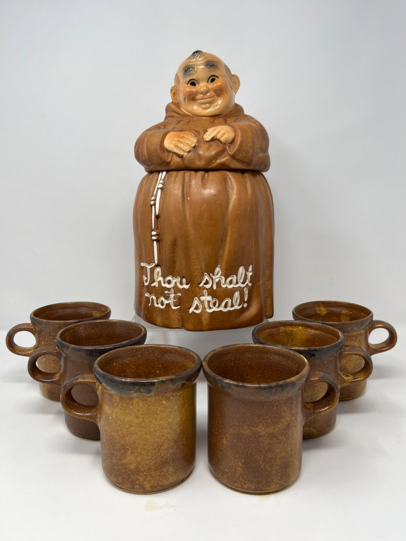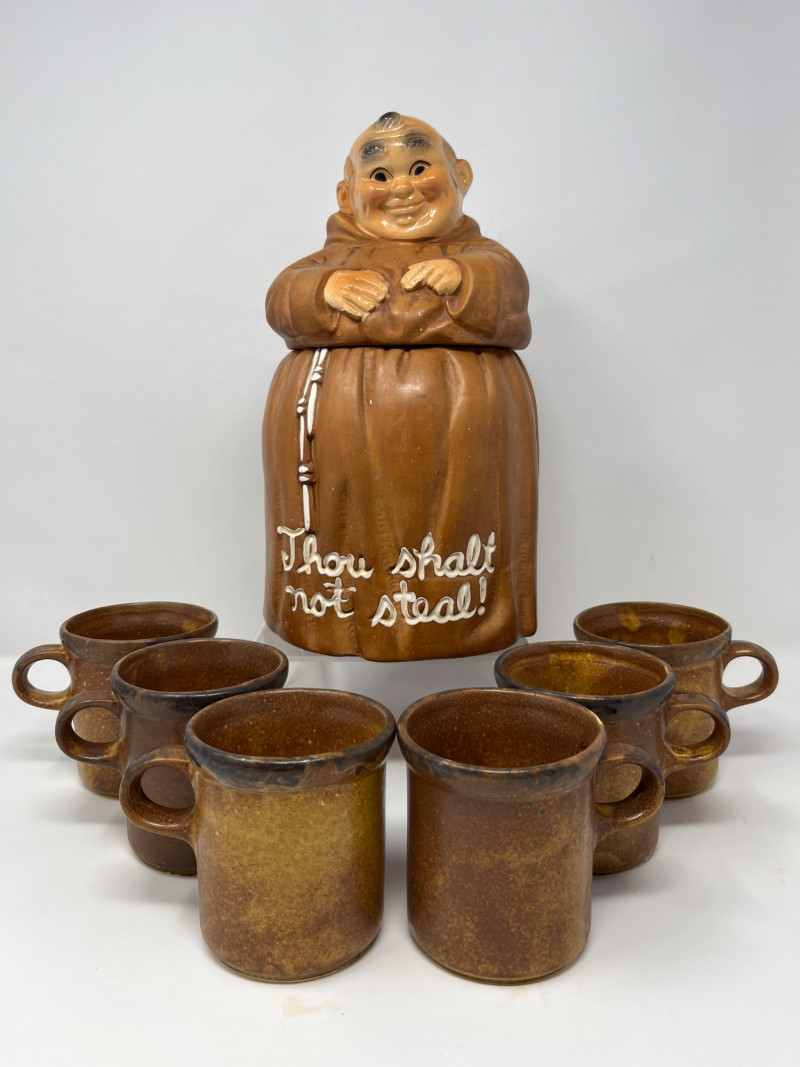 Lot # 51 - Vintage "Thou Shalt Not Steal" Friar Monk Cookie Jar and McCoy Mugs