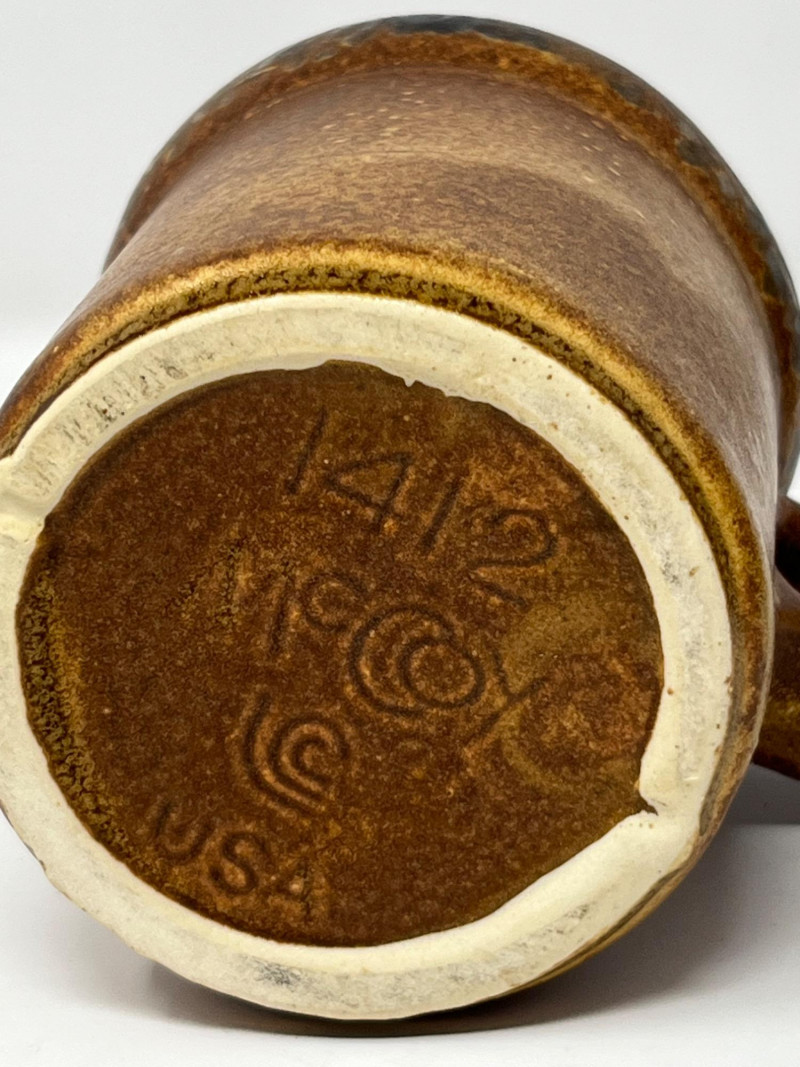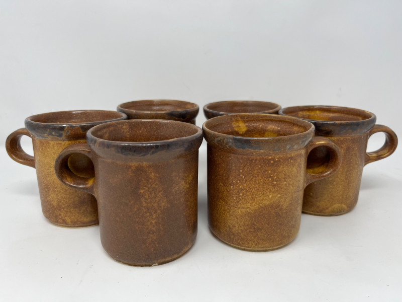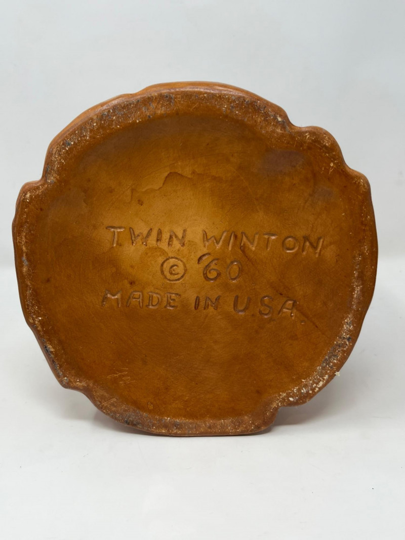This is a charming vintage set featuring an authentic Twin Winton "Friar Tuck" monk cookie jar from the 1960s. The rotund monk, wearing a brown ceramic robe, has the phrase "Thou Shalt Not Steal!" inscribed on the front. The jar stands approximately 12 inches tall. It comes with a matching set of six speckled brown mugs, which are confirmed to be from McCoy Pottery. These mugs are known for their earthy tones and speckled glaze and are a collectible item in their own right.Condition:
